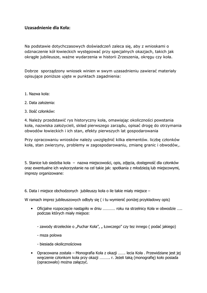 Uzasadnienie dla Koła: Na podstawie dotychczasowych doświadczeń zaleca się, aby z wnioskami o odznaczenie kół łowieckich występować przy specjalnych okazjach, takich jak okrągłe jubileusze, ważne wydarzenia w historii Zrzeszenia, okręgu czy koła. Dobrze sporządzony wniosek winien w swym uzasadnieniu zawierać materiały opisujące poniższe ujęte w punktach zagadnienia: 1. Nazwa koła: 2. Data założenia: 3. Ilość członków: 4. Należy przedstawić rys historyczny koła, omawiając okoliczności powstania koła, nazwiska założycieli, skład pierwszego zarządu, opisać drogę do otrzymania obwodów łowieckich i ich stan, efekty pierwszych lat gospodarowania Przy opracowaniu wniosków należy uwzględnić kilka elementów. liczbę członków koła, stan zwierzyny, problemy w zagospodarowaniu, zmianę granic i obwodów,. 5. Stanice lub siedziba koła – nazwa miejscowości, opis, zdjęcia, dostępność dla członków oraz ewentualne ich wykorzystanie na cel takie jak: spotkania z młodzieżą lub miejscowymi, imprezy organizowane: 6. Data i miejsce obchodzonych jubileuszy koła o ile takie miały miejsce – W ramach imprez jubileuszowych odbyły się ( i tu wymienić poniżej przykładowy opis) • Oficjalne rozpoczęcie nastąpiło w dniu ………… roku na strzelnicy Koła w obwodzie ….. podczas których miały miejsce: - zawody strzeleckie o „Puchar Koła”, „ Łowczego” czy tez innego ( podać jakiego) - msza polowa - biesiada okolicznościowa • Opracowana została – Monografia Koła z okazji ……. lecia Koła . Przewidziane jest jej wręczenie członkom koła przy okazji ………. r. Jeżeli taką (monografię) koło posiada (opracowało) można załączyć. • • • • • • Jeżeli członek danego koła ma osiągnięcia ponad przeciętne ( wydana książka, artykuły w Łowcu Polskim, inne np .programy telewizyjne to dobrze o nich wspomnieć lub je przywołać Wybito metalowy znaczek koła – z aktualnym symbolem Koła np. z okazji ……. Lecia Koła lub innego jubileuszu Następujący członkowie koła otrzymali w roku jubileuszu odznaczenia: oraz podać ilu i jakie odznaczenia otrzymali członkowie koła. Zaproszenie goście: nadleśniczowie, przedstawiciele Policji, starostowie, burmistrzowie i przedstawiciele okręgowych władz łowieckich Organizacja wystaw łowieckich lub udział koła w wystawie o zasięgu ponad kołowym Zasłużenie myśliwi i działacze ( członkowie koła) w Kole: - wymienić z nazwiska i określić pełnione funkcje 7. Obwody łowieckie – • • • Obwód nr……………. – N-ctwo …………………….. – Obwód typowo leśny o pow. Ca ……………………… hektarów o przewadze lasu sosnowego ze śladowymi zadrzewieniami liściastymi. Obwód nie posiadający pół uprawnych graniczący z granicą ………………….. od strony zachodniej i ………………… od strony północnej. Obwód bogaty w zwierzynę płową głównie jelenie, oraz w mniejszej ilości sarny i daniele. Dziki występują w ograniczonym zakresie i jest to zasługa systematycznego dokarmiania. Bardzo dobrze zagospodarowany pod względem łowieckim. Obwód ………………… – N-ctwo ………………. . Obwód polno-leśny o pow. Ca ………………….. hektarów. Zadrzewienia kępowe rozrzucone po cały terenie obwodu. Bardzo dobre ziemie uprawiane rolniczo. Obwód o bardzo dużych możliwościach łowieckich. Zmienna ilość występującej zwierzyny skutkuje stosunkowo niewielkimi planami. Bardzo dobra jakość osobnicza sarny. jelenie przechodnie, stan dzików względnie bardzo dobry. Obwód ………………..– N-ctwo . – Obwód opow. Ok. ……………….. hektarów typowo polny z jedną kępą lasu o pow. ok. 950ha. Bardzo bogate łowiska, zasobne w dziki, jelenie i sarny. Las bukowo-dębowy z odnowieniami naturalnymi, z dużą ilością mokrych dołków. Wkoło lasy gleby pszenno-buraczane powodują doskonałe warunki żerowe dla zwierzyny. Obwód mogący być wizytówką dla Kół. 8. Pozyskanie zwierzyny w ostatnich sezonach: • • • • Jelenie –……….szt Daniele –……………. szt Sarny – …………… szt Dziki – ……………… szt 9. Osiągnięcia w gospodarce łowieckiej – ewentualne introdukcje zwierzyny, efekty, wykładana karma 10. Kynologia w kole 11. Trofea – Członkowie naszego koła zaliczają się do czołówki trofeistów w okręgu posiadając cały szereg trofeów medalowych pozyskanych w obwodach naszego Koła i tak: Jelenie – byki – …………… złote medale , ……………. srebrne i ……………….. brązowych. Niestety spora ilość nie zinwentaryzowanych wyjechała z myśliwymi dewizowymi. Sarny – rogacze –………….. złoty …………..srebrne i jeden …………..( podobna sytuacja z trofeami pozyskanymi przez dewizowców. 12. Strzelectwo w Kole – udział w zawodach okręgowych, mistrzostwach kół, osiągnięcia myśliwych – strzelców danego koła. Osiągnięcia w tym zakresie 13. Aktywność kulturowa - Koło obejmuje współpracą szkoły podstawowe i ponad podstawowe zlokalizowane na terenie naszych obwodów. Każdego roku odbywają się konkursy plastyczne o tematyce łowiecko-przyrodniczej, spotkania o charakterze pogadanek oraz wycieczki do obwodów powiązane z dokarmianiem i gawędami łowieckimi. Ponadto koło finansuje różne przedsięwzięcia dla szkół (w zależności od potrzeb zgłaszanych przez opiekunów z Kola). 14. Informacja o sztandarze koła ( ewentualne jego zdjęcie z pocztem sztandarowym 15. Zagospodarowanie obwodów: • Ilość posiadanych poletek, sposoby ich wykorzystania ( produkcja karmy, zgryzowe, zaporowe, łąki) itp. • Ilość paśników i innych urządzeń dokarmiania lub przechowywania karmy • Urządzenia łowieckie ( ilość , może jakieś zdjęcia) • Wydatki na zagospodarowanie obwodów 16. Jakiego rodzaju tradycje kultywowane są w kole. 17. Działalność