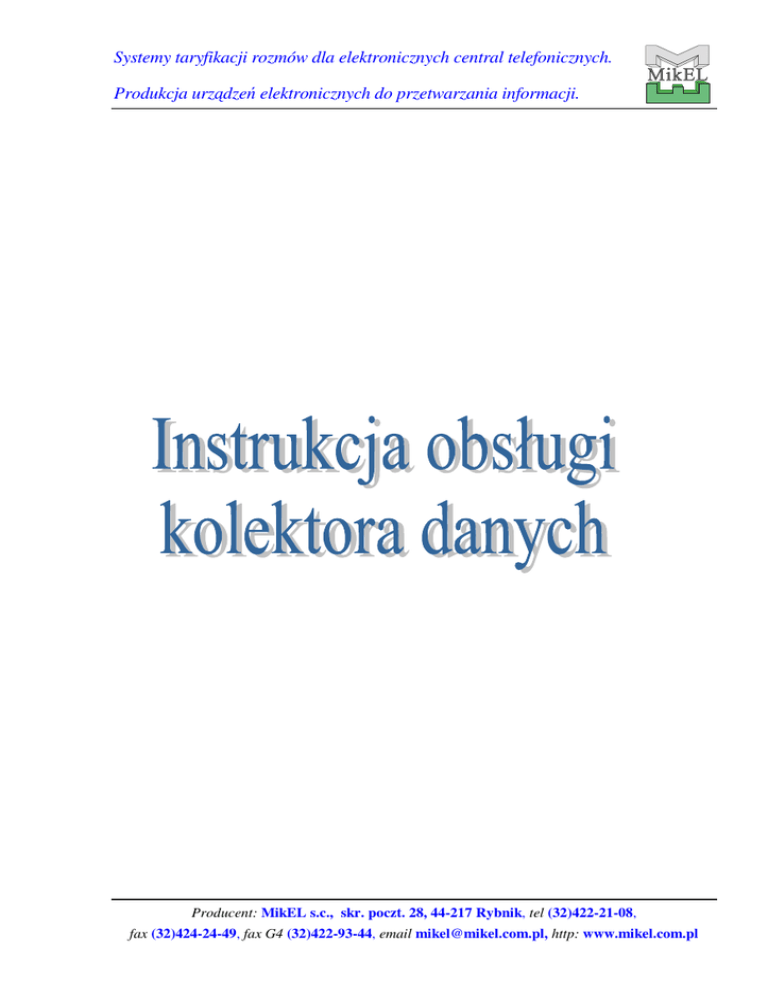Systemy taryfikacji rozmów dla elektronicznych central telefonicznych. Produkcja urz dze elektronicznych do przetwarzania informacji. Producent: MikEL s.c., skr. poczt. 28, 44-217 Rybnik, tel (32)422-21-08, fax (32)424-24-49, fax G4 (32)422-93-44, email [email protected], http: www.mikel.com.pl Instrukcja obsługi kolektorów danych firmy MikEL Strona 1 SPIS TRE CI 1. INFORMACJE OGÓLNE............................................................................................2 2. OBSŁUGA KOLEKTORA DANYCH. .......................................................................3 2.1. 2.2. 2.3. 2.4. OPIS KLAWIATURY URZ DZENIA. .............................................................................3 OPIS SIECI DZIAŁA POSZCZEGÓLNYCH FUNKCJI KOLEKTORA DANYCH. ...................3 ZASILANIE URZ DZENIA. .........................................................................................8 OPIS ZŁ CZA KOMUNIKACYJNEGO............................................................................8 3. PROGRAM UPLOAD.EXE .........................................................................................9 4. PROGRAM DOWNLOAD.EXE................................................................................11 5. PROGRAM KOLEKTOR.EXE..................................................................................13 5.1. 5.2. 5.3. 5.4. 5.5. KONFIGURACJA. ....................................................................................................13 PAMI . ................................................................................................................13 HASŁA...................................................................................................................14 KONWERSJA. .........................................................................................................15 TERMINAL. ............................................................................................................16 6. DANE TECHNICZNE KOLEKTORA DANYCH. ..................................................18 Instrukcja obsługi kolektorów danych firmy MikEL 1. Strona 2 INFORMACJE OGÓLNE. Podczas przyjmowania towarów na magazyn, jak równie podczas okresowych kontroli towarów w magazynie, najcz ciej wykonywan czynno ci jest liczenie i zapisywanie stanu towarów. W takich przypadkach bardzo pomocnym mo e by u ycie urz dzenia, umo liwiaj cego elektroniczne zapami tywanie informacji oraz obsług czytnika kodów kreskowych. Do obsługi tego urz dzenia, zwanego równie kolektorem danych, standardowo jest doł czane oprogramowanie komputerowe: ♦ Programy u ytkowe kolektor.exe, upload.exe i download.exe; ♦ Pliki pomocy kontekstowej kolektor.hlp i rs232_pl.hlp, które po naci ni ciu klawisza F1 udost pniaj opisy poszczególnych opcji programów; ♦ Pliki aplikacji *.hex dla ró nych wersji kolektora. Programy te w wersji instalacyjnej stanowi jeden plik KolektorSetup.exe. Zostały napisane za pomoc DELPHI7 i mog by uruchamiane tylko w rodowisku 32bitowych Windows (Win9x, NT, 2000, Millennium, XP). Po instalacji jest mo liwe sprawdzanie, czy w Internecie pojawiły si nowsze wersje oprogramowania. Działanie kolektora zostało podzielone na osobne funkcje: INWENTARYZACJA, PRZYJ CIE, CENNIK ,USTAWIENIA oraz INFORMACJE. Do wykonania trzech pierwszych funkcji jest jeszcze niezb dny, ale nie dostarczany w komplecie, czytnik kodów paskowych. Jego podł czenie do urz dzenia buforuj cego umo liwia bardzo szybkie, jednoznaczne odszukanie sprawdzanego towaru. Do wa niejszych zada kolektora danych nale y zaliczy : ♦ zapami tanie wysłanych z komputera informacji o towarach, ułatwiaj cych proces ich kontroli (np. kod paskowy, nazwa, cena); ♦ szybkie odszukiwanie towarów na podstawie zeskanowego kodu paskowego lub bezpo rednio wprowadzonego za pomoc klawiaturki urz dzenia; ♦ mo liwo ♦ dopisywanie nowych towarów; ♦ ekonomiczne zasilanie własne oraz czytnika kodów paskowych, maj ce wpływ na czas pracy zasilaj cych baterii; wpisywania ilo ci odszukanego towaru i jego ceny; ♦ mo liwo przesłania do komputera informacji zgromadzonych podczas inwentaryzacji lub przyj cia towarów. Wyprodukowany przez firm MikEL kolektor jest gotowy od razu do pracy, poniewa zawiera oprogramowanie u ytkowe zwane ‘aplikacj ’, a dostarczane oprogramowanie komputerowe umo liwia: ♦ Zapis towarów do kolektora na podstawie przygotowanego wcze niej pliku tekstowego - program upload.exe; ♦ Odczyt z kolektora informacji o przeprowadzonych inwentaryzacjach i przyj ciach towarów, które s zapisywane do wskazanego pliku tekstowego program download.exe; ♦ Zmian podstawowych parametrów pracy urz dzenia (pod wietlanie wy wietlacza, potwierdzanie d wi kowe naciskania klawiszy, czas bezczynno ci, hasła dost pu do poszczególnych funkcji kolektora), odczyt Instrukcja obsługi kolektorów danych firmy MikEL informacji technicznych danego urz dzenia (pojemno i bie pami ci, numer seryjny, dat produkcji), uniwersaln szeregowych - program kolektor.exe; ♦ 2. Strona 3 ce wykorzystanie obsług portów Wymian oprogramowania (aplikacji) w kolektorze za pomoc szeregowe i programu kolektor.exe. transmisji OBSŁUGA KOLEKTORA DANYCH. 2.1. Opis klawiatury urz dzenia. Kolektor danych wyposa ony jest w klawiatur składaj c si z 20 klawiszy podzielonych kolorami na grupy funkcjonalne. Kolorem srebrnym wydzielono grup klawiszy numerycznych oraz separator warto ci dziesi tnej (kropk ) słu cych do wprowadzania warto ci (np. ceny, ilo ci, kodu itp.). Do wykonania ró nych operacji słu klawisze wydzielone kolorem ółtym. Poni sza tabela okre la działanie klawiszy z tej grupy. OK ESC DEL +,– klawisz operacja zatwierdzanie rezygnacja, wycofanie kasowanie znak wprowadzanej liczby mno enie poruszanie (nawigacja) po MENU Kolorem czerwonym wydzielono tylko jeden klawisz ON/OFF. Klawisz ten słu y do wł czania i wył czania kolektora. Przy wył czaniu nale y klawisz ten wcisn i przytrzyma około 2s. 2.2. Opis sieci