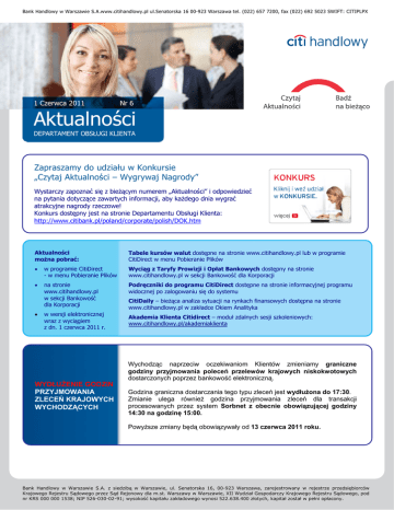Bank Handlowy w Warszawie S.A.www.citihandlowy.pl ul.Senatorska 16 00-923 Warszawa tel. (022) 657 7200, fax (022) 692 5023 SWIFT: CITIPLPX 1 Czerwca 2011 Nr 6 Aktualności DEPARTAMENT OBSŁUGI KLIENTA Zapraszamy do udziału w Konkursie „Czytaj Aktualności – Wygrywaj Nagrody” Wystarczy zapoznać się z bieżącym numerem „Aktualności” i odpowiedzieć na pytania dotyczące zawartych informacji, aby każdego dnia wygrać atrakcyjne nagrody rzeczowe! Konkurs dostępny jest na stronie Departamentu Obsługi Klienta: http://www.citibank.pl/poland/corporate/polish/DOK.htm Aktualności można pobrać: Tabele kursów walut dostępne na stronie www.citihandlowy.pl lub w programie CitiDirect w menu Pobieranie Plików w programie CitiDirect - w menu Pobieranie Plików Wyciąg z Taryfy Prowizji i Opłat Bankowych dostępny na stronie www.citihandlowy.pl w sekcji Bankowość dla Korporacji na stronie www.citihandlowy.pl w sekcji Bankowość dla Korporacji Podręczniki do programu CitiDirect dostępne na stronie informacyjnej programu widocznej po zalogowaniu się do systemu w wersji elektronicznej wraz z wyciągiem z dn. 1 czerwca 2011 r. WYDŁUŻENIE GODZIN PRZYJMOWANIA ZLECEŃ KRAJOWYCH WYCHODZĄCYCH CitiDaily – bieżąca analiza sytuacji na rynkach finansowych dostępna na stronie www.citihandlowy.pl w zakładce Okiem Analityka Akademia Klienta Citidirect – moduł zdalnych sesji szkoleniowych: www.citihandlowy.pl/akademiaklienta Wychodząc naprzeciw oczekiwaniom Klientów zmieniamy graniczne godziny przyjmowania poleceń przelewów krajowych niskokwotowych dostarczonych poprzez bankowość elektroniczną. Godzina graniczna dostarczania tego typu zleceń jest wydłużona do 17:30. Zmianie ulega również godzina przyjmowania zleceń dla transakcji procesowanych przez system Sorbnet z obecnie obowiązującej godziny 14:30 na godzinę 15:00. Powyższe zmiany będą obowiązywały od 13 czerwca 2011 roku. Bank Handlowy w Warszawie S.A. z siedzibą w Warszawie, ul. Senatorska 16, 00-923 Warszawa, zarejestrowany w rejestrze przedsiębiorców Krajowego Rejestru Sądowego przez Sąd Rejonowy dla m.st. Warszawy w Warszawie, XII Wydział Gospodarczy Krajowego Rejestru Sądowego, pod nr KRS 000 000 1538; NIP 526-030-02-91; wysokość kapitału zakładowego wynosi 522.638.400 złotych, kapitał został w pełni opłacony. Bank Handlowy w Warszawie S.A.www.citihandlowy.pl ul.Senatorska 16 00-923 Warszawa tel. (022) 657 7200, fax (022) 692 5023 SWIFT: CITIPLPX NOWOŚCI W OFERCIE KART KORPORACYJNYCH AKADEMIA KLIENTA CITIDIRECT – INDYWIDULANE SZKOLENIA Z INSTRUKTOREM Zmiany w zakresie Kart Obciążeniowych Visa Business oraz Kart Gwarantowanych Visa Business. 1. Możliwość zdalnego zlecania zmiany Limitu Indywidualnego lub Limitu Wypłat Gotówki, bez konieczności wysyłania oryginalnych dokumentów telefonicznie - Pełnomocnik może złożyć dyspozycję w Biurze Obsługi Klienta (tel. 22 692 24 36 lub 800 120 078) drogą mailową - Pełnomocnik może wysłać dyspozycję na adres Biura Obsługi Klienta: [email protected] 2. Możliwość złożenia dyspozycji wydania duplikatu Karty telefonicznie poprzez Biuro Obsługi Klienta Wydanie duplikatu Karty poprzez Biuro Obsługi Klienta będzie możliwe w sytuacji, gdy Karta Użytkownika zostanie skradziona lub zgubiona. Powyższe zmiany wprowadza nowy Regulamin 3. Łatwiejsza spłata zadłużenia Karty Gwarantowanej Visa Business dzięki Poleceniu Zapłaty. Nowa funkcjonalność ma na celu usprawnienie procesu spłaty zadłużenia Karty przez pracownika oraz jej realizację w terminie wymagalności. Nowa funkcjonalność możliwa jest po podpisaniu Porozumienia z Klientem 4. Nowa, edytowalna dokumentacja 5. Bezpieczny, szyfrowany kanał komunikacji elektronicznej - „Bezpieczny Email” Teraz wszelkie bieżące kwestie związane z użytkowaniem Kart Visa Business można wyjaśniać korzystając ze specjalnej skrzynki pocztowej „Bezpieczny Email”. Zmianę wprowadza nowy Regulamin oraz Formularz zgody na komunikację elektroniczną Miło nam zakomunikować, iż użytkownicy portalu Akademii Klienta CitiDirect mają teraz prostszy dostęp do modułu szkoleń samodzielnych. Od teraz wejście nie wymaga rejestracji. Ponadto informujemy, iż uruchomiona została nowa, dodatkowa funkcjonalność. Od dziś użytkownicy mogą korzystać z indywidualnych szkoleń z instruktorem. Ich terminy oraz tematy są wybierane przez Klienta. Taki tryb warsztatów, dzięki elastycznemu podejściu, pozwala użytkownikom CitiDirect w pełni wykorzystać konsultacje z trenerem. Zapraszamy www.citihandlowy.pl/akademiaklienta Bank Handlowy w Warszawie S.A. z siedzibą w Warszawie, ul. Senatorska 16, 00-923 Warszawa, zarejestrowany w rejestrze przedsiębiorców Krajowego Rejestru Sądowego przez Sąd Rejonowy dla m.st. Warszawy w Warszawie, XII Wydział Gospodarczy Krajowego Rejestru Sądowego, pod nr KRS 000 000 1538; NIP 526-030-02-91; wysokość kapitału zakładowego wynosi 522.638.400 złotych, kapitał został w pełni opłacony. Bank Handlowy w Warszawie S.A.www.citihandlowy.pl ul.Senatorska 16 00-923 Warszawa tel. (022) 657 7200, fax (022) 692 5023 SWIFT: CITIPLPX Od maja 2011 roku dostępna jest nowa usługa – potwierdzenie zrealizowanych przelewów krajowych. Aby wygenerować potwierdzenie transakcji, przy jej tworzeniu w systemie CitiDirect należy w polu 'Szczegóły płatności' umieścić ciąg znaków /ITC/ (trzyliterowy skrót ograniczony ukośnikami). Znacznik może być umieszczony w którejkolwiek z czterech linii, w dowolnym miejscu tekstu. NOWA USŁUGA – POTWIERDZENIA ZREALIZOWANYCH PRZELEWÓW KRAJOWYCH Potwierdzenia takich transakcji przesyłane będą w postaci pliku pdf, w dniu realizacji przelewu, na adres e-mail, na który obecnie wysyłane są wyciągi bankowe. W przypadku, gdy Klient pobiera wyciągi jedynie przez system CitiDirect, a chciałby otrzymywać potwierdzenia pojedynczych przelewów na adres e-mail, niezbędne jest podpisanie i 