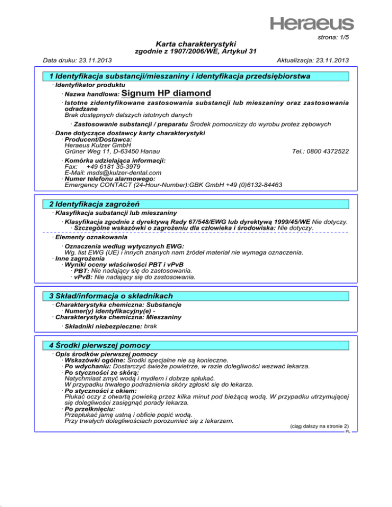 36.0.30 strona: 1/5 Karta charakterystyki zgodnie z 1907/2006/WE, Artykuł 31 Data druku: 23.11.2013 Aktualizacja: 23.11.2013 1 Identyfikacja substancji/mieszaniny i identyfikacja przedsiębiorstwa · Identyfikator produktu · Nazwa handlowa: Signum HP diamond · Istotne zidentyfikowane zastosowania substancji lub mieszaniny oraz zastosowania odradzane Brak dostępnych dalszych istotnych danych · Zastosowanie substancji / preparatu Środek pomocniczy do wyrobu protez zębowych · Dane dotyczące dostawcy karty charakterystyki · Producent/Dostawca: Heraeus Kulzer GmbH Grüner Weg 11, D-63450 Hanau Tel.: 0800 4372522 · Komórka udzielająca informacji: Fax: +49 6181 35-3979 E-Mail: [email protected] · Numer telefonu alarmowego: Emergency CONTACT (24-Hour-Number):GBK GmbH +49 (0)6132-84463 2 Identyfikacja zagrożeń · Klasyfikacja substancji lub mieszaniny · Klasyfikacja zgodnie z dyrektywą Rady 67/548/EWG lub dyrektywą 1999/45/WE Nie dotyczy. · Szczególne wskazówki o zagrożeniu dla człowieka i środowiska: Nie dotyczy. · Elementy oznakowania · Oznaczenia według wytycznych EWG: Wg. list EWG (UE) i innych znanych nam źródeł materiał nie wymaga oznaczenia. · Inne zagrożenia · Wyniki oceny właściwości PBT i vPvB · PBT: Nie nadający się do zastosowania. · vPvB: Nie nadający się do zastosowania. 3 Skład/informacja o składnikach · Charakterystyka chemiczna: Substancje · Numer(y) identyfikacyjny(e) · Charakterystyka chemiczna: Mieszaniny · Składniki niebezpieczne: brak 4 Środki pierwszej pomocy · Opis środków pierwszej pomocy · Wskazówki ogólne: Środki specjalne nie są konieczne. · Po wdychaniu: Dostarczyć świeże powietrze, w razie dolegliwości wezwać lekarza. · Po styczności ze skórą: Natychmiast zmyć wodą i mydłem i dobrze spłukać. W przypadku trwałego podrażnienia skóry zgłosić się do lekarza. · Po styczności z okiem: Płukać oczy z otwartą powieką przez kilka minut pod bieżącą wodą. W przypadku utrzymującej się dolegliwości zasięgnąć porady lekarza. · Po przełknięciu: Przepłukać jamę ustną i obficie popić wodą. Przy trwałych dolegliwościach porozumieć się z lekarzem. (ciąg dalszy na stronie 2) PL 36.0.30 strona: 2/5 Karta charakterystyki zgodnie z 1907/2006/WE, Artykuł 31 Data druku: 23.11.2013 Nazwa handlowa: Signum Aktualizacja: 23.11.2013 HP diamond (ciąg dalszy od strony 1) · Wskazówki dla lekarza: · Najważniejsze ostre i opóźnione objawy oraz skutki narażenia Brak dostępnych dalszych istotnych danych · Wskazania dotyczące wszelkiej natychmiastowej pomocy lekarskiej i szczególnego postępowania z poszkodowanym Brak dostępnych dalszych istotnych danych * 5 Postępowanie w przypadku pożaru · Środki gaśnicze · Przydatne środki gaśnicze: CO2, proszek gaśniczy lub strumień wody. Większy pożar zwalczać strumieniem wody lub pianą odporną na działanie alkoholu. Zabiegi gaszenia ognia dostosować do otoczenia. · Szczególne zagrożenia związane z substancją lub mieszaniną Podczas pożaru mogą uwolnić się: Tlenek węgla (CO) · Informacje dla straży pożarnej · Specjalne wyposażenie ochronne: Nosić urządzenie ochrony dróg oddechowych niezależnie od powietrza otoczenia. · Inne dane - 6 Postępowanie w przypadku niezamierzonego uwolnienia do środowiska · Indywidualne środki ostrożności, wyposażenie ochronne i procedury w sytuacjach awaryjnych Nosić ubranie ochronne. Osoby żagrozone przenieść w bezpieczne miejsce. · Środki ostrożności w zakresie ochrony środowiska: Szczególne środki nie są konieczne. · Metody i materiały zapobiegające rozprzestrzenianiu się skażenia i służące do usuwania skażenia: Zdjąć mechanicznie. Materiał zebrany usunąć w sposób zgodny z przepisami. · Odniesienia do innych sekcji Informacje na temat bezpiecznej obsługi patrz rozdział 7. Informacje na temat osobistego wyposażenia ochronnego patrz rozdział 8. - 7 Postępowanie z substancjami i mieszaninami oraz ich magazynowanie · Sposób obchodzenia się: · Środki ostrożności dotyczące bezpiecznego postępowania Nosić ubranie ochronne. Osoby żagrozone przenieść w bezpieczne miejsce. · Wskazówki dla ochrony przeciwpożarowej i przeciwwybuchowej: Nie są potrzebne szczególne zabiegi. · Warunki bezpiecznego magazynowania, łącznie z informacjami dotyczącymi wszelkich wzajemnych niezgodności · Składowanie: · Wymagania w stosunku do pomieszczeń składowych i zbiorników: Przechowywać tylko w oryginalnych beczkach. · Wskazówki odnośnie wspólnego składowania: Nie konieczne. · Dalsze wskazówki odnośnie warunków składowania: Keep receptacle tightly sealed. Zbiornik przechowywać w dobrze przewietrzanym miejscu. (ciąg dalszy na stronie 3) PL 36.0.30 strona: 3/5 Karta charakterystyki zgodnie z 1907/2006/WE, Artykuł 31 Data druku: 23.11.2013 Nazwa handlowa: Signum Aktualizacja: 23.11.2013 HP diamond (ciąg dalszy od strony 2) · Szczególne zastosowanie(-a) końcowe Brak dostępnych dalszych istotnych danych 8 Kontrola narażenia/środki ochrony indywidualnej · Dodatkowe wskazówki dla wykonania urządzeń technicznych: Brak dalszych danych, patrz punkt 7. · Parametry dotyczące kontroli · Składniki wraz z kontrolowanymi wartościami granicznymi zależnymi od miejsca pracy: Produkt nie zawiera znaczących ilości materiałów, których wartości graniczne musiałyby być kontrolowane pod kątem warunków miejsca pracy. · Wskazówki dodatkowe: Podstawą były aktualnie obowiązujące wykazy. · Kontrola narażenia · Osobiste wyposażenie ochronne: · Ogólne środki ochrony i higieny: Należy przestrzegać zwyczajne środki ostrożności przy obchodzeniu się z chemikaliami. · Ochrona dróg oddechowych: Nie konieczne. · Ochrona rąk: Rękawice nieprzepuszczalne · Do długotrwałego kontaktu w miejscach bez zwiększonego zagrożenia uszkodzeniem (np. laboratorium) nadają się rękawice z następującego materiału: Kauczuk nat