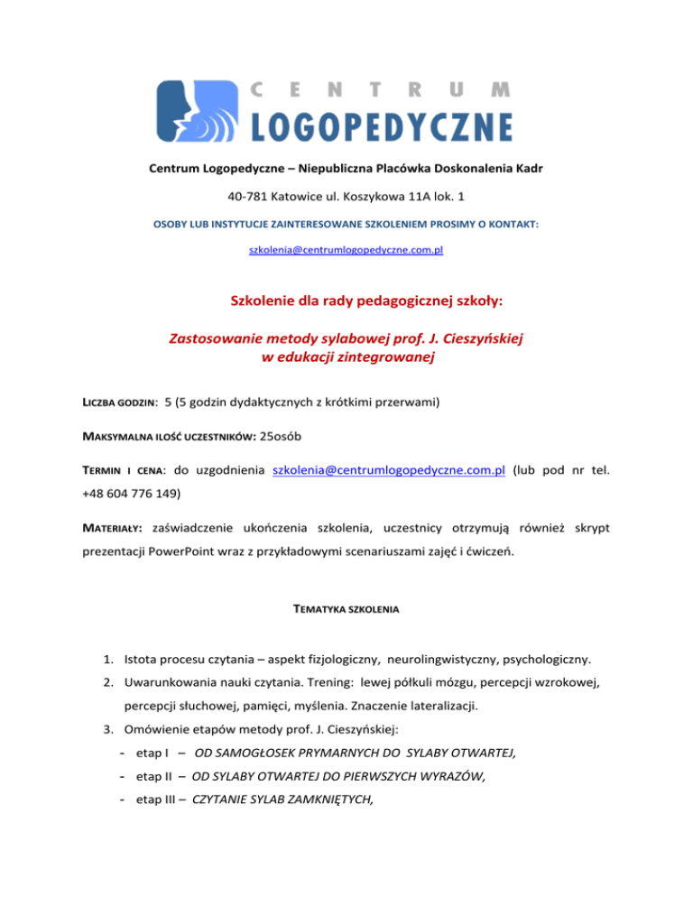 Centrum Logopedyczne – Niepubliczna Placówka Doskonalenia Kadr 40-781 Katowice ul. Koszykowa 11A lok. 1 OSOBY LUB INSTYTUCJE ZAINTERESOWANE SZKOLENIEM PROSIMY O KONTAKT: [email protected] Szkolenie dla rady pedagogicznej szkoły: Zastosowanie metody sylabowej prof. J. Cieszyńskiej w edukacji zintegrowanej LICZBA GODZIN: 5 (5 godzin dydaktycznych z krótkimi przerwami) MAKSYMALNA ILOŚĆ UCZESTNIKÓW: 25osób TERMIN I CENA: do uzgodnienia [email protected] (lub pod nr tel. +48 604 776 149) MATERIAŁY: zaświadczenie ukończenia szkolenia, uczestnicy otrzymują również skrypt prezentacji PowerPoint wraz z przykładowymi scenariuszami zajęć i ćwiczeń. TEMATYKA SZKOLENIA 1. Istota procesu czytania – aspekt fizjologiczny, neurolingwistyczny, psychologiczny. 2. Uwarunkowania nauki czytania. Trening: lewej półkuli mózgu, percepcji wzrokowej, percepcji słuchowej, pamięci, myślenia. Znaczenie lateralizacji. 3. Omówienie etapów metody prof. J. Cieszyńskiej: - etap I – OD SAMOGŁOSEK PRYMARNYCH DO SYLABY OTWARTEJ, - etap II – OD SYLABY OTWARTEJ DO PIERWSZYCH WYRAZÓW, - etap III – CZYTANIE SYLAB ZAMKNIĘTYCH, - etap IV – CZYTANIE NOWYCH SYLAB OTWARTYCH I ZAMKNIĘTYCH, - etap V – SAMODZIELNE CZYTANIE TEKSTÓW. 4. Przykładowe konspekty a w nich zabawy i ćwiczenia wprowadzające dziecko w świat pisma. Szkolenie prowadzone jest w formie warsztatowej z czynnym udziałem uczestników, w szkoleniu wykorzystana będzie prezentacja PowerPoint, zawierającą m. in. nagrania filmów. PROWADZĄCA: Łucja Skrzypiec – pedagog, logopeda, nauczyciel akademicki. Zajmuje się diagnozą i wspomaganiem rozwoju dzieci między innymi poprzez wczesną naukę czytania. Współpracowała przy realizacji dwóch ogólnopolskich projektów badawczych z Akademią Świętokrzyską - „Badanie stopnia przygotowania sześciolatków do nauki szkolnej” i Centrum Metodycznym Pomocy Psychologiczno - Pedagogicznej w Warszawie - „Badanie gotowości szkolnej sześciolatków”. Jest założycielem i liderem grupy wsparcia nauczycieli pracujących metodą prof. J. Cieszyńskiej, autorką innowacji pedagogicznej i materiałów pomocniczych dla nauczycieli. Pełni funkcję sekretarza Śląskiego Oddziału Polskiego Towarzystwa Logopedycznego. Instytucje zainteresowane organizacją szkolenia proszone [email protected] lub nr tel. + 48 604 776 149 są o kontakt: