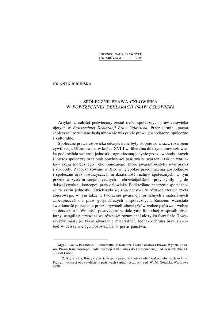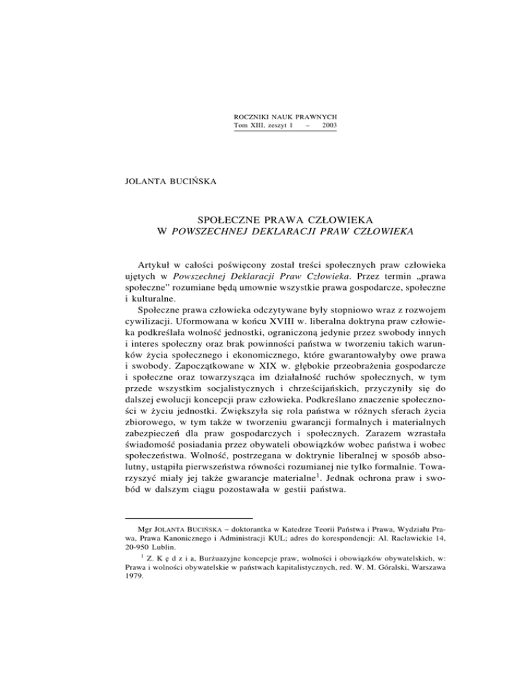 ROCZNIKI NAUK PRAWNYCH Tom XIII, zeszyt 1 – 2003 JOLANTA BUCIŃSKA SPOŁECZNE PRAWA CZŁOWIEKA W POWSZECHNEJ DEKLARACJI PRAW CZŁOWIEKA Artykuł w całości poświe˛cony został treści społecznych praw człowieka uje˛tych w Powszechnej Deklaracji Praw Człowieka. Przez termin „prawa społeczne” rozumiane be˛da˛ umownie wszystkie prawa gospodarcze, społeczne i kulturalne. Społeczne prawa człowieka odczytywane były stopniowo wraz z rozwojem cywilizacji. Uformowana w końcu XVIII w. liberalna doktryna praw człowieka podkreślała wolność jednostki, ograniczona˛ jedynie przez swobody innych i interes społeczny oraz brak powinności państwa w tworzeniu takich warunków życia społecznego i ekonomicznego, które gwarantowałyby owe prawa i swobody. Zapoczatkowane ˛ w XIX w. głe˛bokie przeobrażenia gospodarcze i społeczne oraz towarzyszaca ˛ im działalność ruchów społecznych, w tym przede wszystkim socjalistycznych i chrześcijańskich, przyczyniły sie˛ do dalszej ewolucji koncepcji praw człowieka. Podkreślano znaczenie społeczności w życiu jednostki. Zwie˛kszyła sie˛ rola państwa w różnych sferach życia zbiorowego, w tym także w tworzeniu gwarancji formalnych i materialnych zabezpieczeń dla praw gospodarczych i społecznych. Zarazem wzrastała świadomość posiadania przez obywateli obowiazków ˛ wobec państwa i wobec społeczeństwa. Wolność, postrzegana w doktrynie liberalnej w sposób absolutny, ustapiła ˛ pierwszeństwa równości rozumianej nie tylko formalnie. Towarzyszyć miały jej także gwarancje materialne 1. Jednak ochrona praw i swobód w dalszym ciagu ˛ pozostawała w gestii państwa. Mgr JOLANTA BUCIŃSKA − doktorantka w Katedrze Teorii Państwa i Prawa, Wydziału Prawa, Prawa Kanonicznego i Administracji KUL; adres do korespondencji: Al. Racławickie 14, 20-950 Lublin. 1 Z. K e˛ d z i a, Burżuazyjne koncepcje praw, wolności i obowiazków ˛ obywatelskich, w: Prawa i wolności obywatelskie w państwach kapitalistycznych, red. W. M. Góralski, Warszawa 1979. 122 JOLANTA BUCIŃSKA Sposobów zagwarantowania społecznych praw człowieka w płaszczyźnie pozapaństwowej i ponadpaństwowej można doszukać sie˛ w latach mie˛dzywojennych. Wówczas powstało wiele indywidualnie formułowanych projektów deklaracji praw człowieka. W roku 1919 utworzono Mie˛dzynarodowa˛ Organizacje˛ Pracy, która zapoczatkowała ˛ ochrone˛ ekonomicznych i społecznych praw jednostki. Z własna˛ Mie˛dzynarodowa˛ Deklaracja˛ Praw Człowieka wysta˛ pił w 1928 roku również Instytut Prawa Mie˛dzynarodowego. Jednakże zdecydowany sprzeciw państw o orientacji totalitarnej uniemożliwił umie˛dzynarodowienie problematyki praw człowieka i ich ochrony. Totalitaryzm stanowił także zagrożenie dla praw człowieka w sferze idei, doktryn i legislacji wewnatrzpaństwowej. ˛ Ustrój totalitarny w wariancie faszystowskim całkowicie odrzucał wartość wolności i godności człowieka. Jednostke˛ całkowicie podporzadkowywał ˛ państwu. Co za tym idzie, wszelka aktywność społeczna, gospodarcza czy kulturalna była również podporzadko˛ wana zasadom i celom totalitarnego państwa. Komunistyczna doktryna praw człowieka najwie˛ksze znaczenie przypisywała prawom społecznym, gospodarczym i kulturalnym jako materialnej gwarancji praw politycznych. Ład, porza˛ dek publiczny i przestrzeganie prawa w teorii miały priorytet wzgle˛dem swobód obywatelskich i politycznych. Odrzucano koncepcje˛ praw natury i przyrodzonej godności osoby ludzkiej. Państwo jako wyłaczny ˛ suweren, arbitralnie wyznaczało zakres praw przysługujacych ˛ jednostce. Kolejna˛ przeszkode˛ utrudniajac ˛ a˛ rozwój prawnomie˛dzynarodowej ochrony praw człowieka, w tym i praw społecznych, stanowiło ówczesne rozumienie suwerenności państwa. Wedle niego państwo jest głównym suwerenem i jako podmiot prawa mie˛dzynarodowego nie ma żadnych zobowiazań ˛ wobec jednostki poza tymi, które wyraźnie przyje˛ło. Nie uwzgle˛dniano suwerenności człowieka jako takiego. Do zwrotu w procesie rozwoju ochrony, a co za tym idzie i idei społecznych praw człowieka, doszło dopiero po II wojnie światowej. 1. OKOLICZNOŚCI PROKLAMOWANIA POWSZECHNEJ DEKLARACJI PRAW CZŁOWIEKA Kataklizm II wojny światowej i doznanie przez ludzkość okrutnych zbrodni stały sie˛ bezpośrednim impulsem do podje˛cia prac nad przygotowaniem dokumentu, który ujmowałby w postaci katalogu podstawowe prawa człowie- SPOŁECZNE PRAWA CZŁOWIEKA 123 ka, zaakceptowane przez wszystkie kraje Narodów Zjednoczonych2. Prace te poprzedzone zostały przeprowadzeniem szerokich badań, majacych ˛ na celu zebranie opinii na temat ówczesnego rozumienia praw człowieka oraz określenie przynajmniej w stopniu ogólnym współczesnej koncepcji praw ludzkich. Celowo zrezygnowano z poszukiwań według klucza ideologicznego, filozoficznego, czy wyznaniowego, co utrudniłoby uzyskanie uniwersalizmu dokumentu3. Nowe uje˛cie praw miało być możliwie wszechstronne i obejmować nie tylko wszystkie podstawowe prawa ludzkie, lecz także odnosić sie˛ do każdego człowieka i całości stosunków mie˛dzyludzkich. Dlatego umieszczone w Powszechnej Deklaracji Praw Człowieka prawa należa˛ do obu grup praw człowieka: wolnościowych i społecznych. Już w treści Preambuły wskazuje sie˛, iż „wszystkie ludy oraz wszystkie Narody” powinny dażyć ˛ do urzeczywistnienia „świata, w którym istoty ludzkie cieszyć sie˛ be˛da˛ wolnościa˛ słowa i przekonań oraz wolnościa˛ od strachu i potrzeb”. Stanowi to nawiazanie ˛ do słynnych czterech wolności F. D. Roosevelta, wygłoszonych w Przesłaniu do Kongresu z dnia 6 stycznia 1941 roku, w których zawarta jest idea jedności dwu grup praw człowieka. Podział praw człowieka na polityczne, obywatelskie, wolnościowe oraz na gospodarcze, społeczne, kulturalne był głównie wynikiem konfrontacji na tle ideologiczno-politycznym pomie