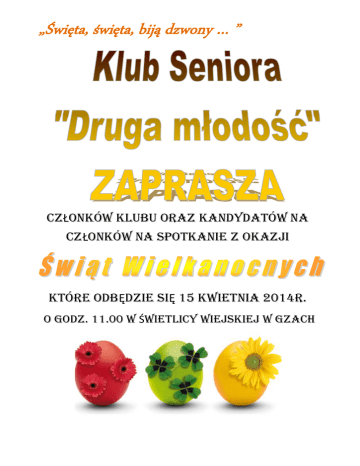 „Święta, święta, biją dzwony … ” czŁonków klubu oraz kandydatów na czŁonków na SPOTKANIE z okazji Które odbĘdzie siĘ 15 KWIETNIA 2014r. o godz. 11.00 w Świetlicy Wiejskiej w Gzach