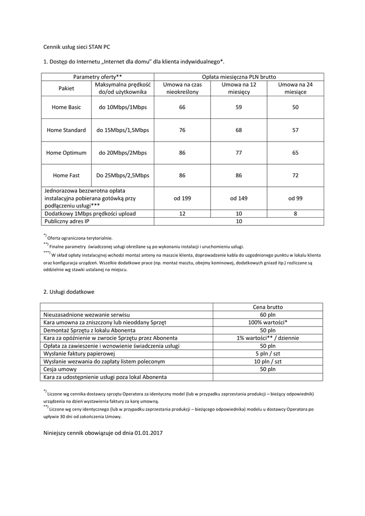 Cennik usług sieci STAN PC 1. Dostęp do Internetu „Internet dla domu” dla klienta indywidualnego*. Parametry oferty** Maksymalna prędkość Pakiet do/od użytkownika Umowa na czas nieokreślony Opłata miesięczna PLN brutto Umowa na 12 Umowa na 24 miesięcy miesiące Home Basic do 10Mbps/1Mbps 66 59 50 Home Standard do 15Mbps/1,5Mbps 76 68 57 Home Optimum do 20Mbps/2Mbps 86 77 65 Home Fast Do 25Mbps/2,5Mbps 86 86 72 od 199 od 149 od 99 12 10 10 8 Jednorazowa bezzwrotna opłata instalacyjna pobierana gotówką przy podłączeniu usługi*** Dodatkowy 1Mbps prędkości upload Publiczny adres IP *) Oferta ograniczona terytorialnie. **) Finalne parametry świadczonej usługi określane są po wykonaniu instalacji i uruchomieniu usługi. ***) W skład opłaty instalacyjnej wchodzi montaż anteny na maszcie klienta, doprowadzenie kabla do uzgodnionego punktu w lokalu klienta oraz konfiguracja urządzeń. Wszelkie dodatkowe prace (np. montaż masztu, obejmy kominowej, dodatkowych gniazd itp.) rozliczane są oddzielnie wg stawki ustalanej na miejscu. 2. Usługi dodatkowe Nieuzasadnione wezwanie serwisu Kara umowna za zniszczony lub nieoddany Sprzęt Demontaż Sprzętu z lokalu Abonenta Kara za opóźnienie w zwrocie Sprzętu przez Abonenta Opłata za zawieszenie i wznowienie świadczenia usługi Wysłanie faktury papierowej Wysłanie wezwania do zapłaty listem poleconym Cesja umowy Kara za udostępnienie usługi poza lokal Abonenta *) Cena brutto 60 pln 100% wartości* 50 pln 1% wartości** / dziennie 50 pln 5 pln / szt 10 pln / szt 50 pln Liczone wg cennika dostawcy sprzętu Operatora za identyczny model (lub w przypadku zaprzestania produkcji – bieżący odpowiednik) urządzenia na dzień wystawienia faktury za karę umowną. **) Liczone wg ceny identycznego (lub w przypadku zaprzestania produkcji – bieżącego odpowiednika) modelu u dostawcy Operatora po upływie 30 dni od zakończenia Umowy. Niniejszy cennik obowiązuje od dnia 01.01.2017