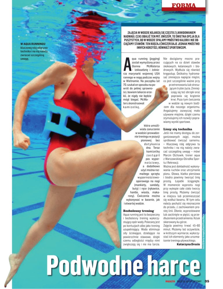 forma A qua running (jogging) został wymyślony przez Glenna McWatersa – lekkoatletę i żołnierza marynarki wojennej USA rannego w nogę podczas wojny w Wietnamie. Na początku lat 70. szukał on sposobu na powrót do pełnej sprawności, bowiem lekarze orzekli, że nigdy nie będzie mógł biegać. McWaters skonstruował kamizelkę, która umożliwiała zanurzenie w wodzie i prowadzenie treningu w pozycji pionowej bez dotykania dna. Teraz kamizelkę zastąpił pas wypornościowy, a dodatkowo użyć można rozmaitego sprzętu wypornościowooporowego na nogi (mankiety, sandały, buty) i ręce (rękawice, hantle, wiosła, makarony). Ćwiczenia można wykonywać w basenie, jak i otwartej wodzie. Bezbolesny trening Aqua running jest to bezpieczny i bezbolesny trening wykorzystujący opór wody. Polecany jest po kontuzjach albo jako trening uzupełniający. Woda eliminuje siły ściskające, działające na powierzchnie stawowe, dzięki czemu odległości między nimi zwiększają się i nie ma tarcia. Nie dociążamy mocno pracujących na co dzień stawów skokowych, kolanowych i biodrowych. Wydłuża się również kręgosłup. Delikatny hydromasaż zmniejsza napięcie mięśni, co jest szczególnie ważne przy przetrenowaniu lub stresującym trybie życia. Zmniejszają się też obrzęki oraz poprawia się krążenie krwi. Poza tym ćwiczenia w wodzie są nowym bodźcem dla naszego organizmu. Angażujemy zazwyczaj mało używane mięśnie, dzięki czemu stymulujemy ich rozwój i poprawiamy wyniki sportowe. Liczy się technika Jeśli nie mamy dostępu do zorganizowanych zajęć, można spróbować ćwiczyć samemu. – Kluczową rolę odgrywa tu technika i na nią należy zwracać szczególną uwagę – mówi Marcin Olchowik, trener aqua z Warszawskiego Ośrodka Sportu i Rekreacji. Ważna jest dokładność wykonywania ruchów oraz utrzymanie pionu. Głowa, klatka piersiowa i biodra powinny tworzyć linię prostą. Łopatki ściągnięte. W momencie wyprostu nogi przy wykopie całe ciało tworzy linię prostą. Możemy ćwiczyć w miejscu lub przemieszczać się wzdłuż basenu. W tym celu należy pochylić się nieznacznie do przodu, z zachowaniem prostej linii. Dłonie, wyprostowane lub zaciśnięte w pięści, są przedłużeniem przedramienia. Kciuk skierowany ku górze. Zajęcia powinny trwać 45–60 minut. Możemy też oczywiście, w krótszym wymiarze, wykorzystać ich elementy jako urozmaicenie treningu pływackiego. Katarzyna Drosio Podwodne harce Magazyn Przegląd Sportowy foto © Getty Images/Flash Press Media w aqua runningu kluczową rolę odgrywa technika i na nią należy zwracać szczególną uwagę. Zajęcia w wodzie kojarzą się często z likwidowaniem nadwagi. Czas obalić ten mit. Owszem, to świetna opcja dla puszystych, bo w wodzie spalamy mnóstwo kalorii i nie obciążamy stawów. Ten rodzaj ćwiczeń daje jednak mnóstwo innych korzyści, również sportowcom. 35