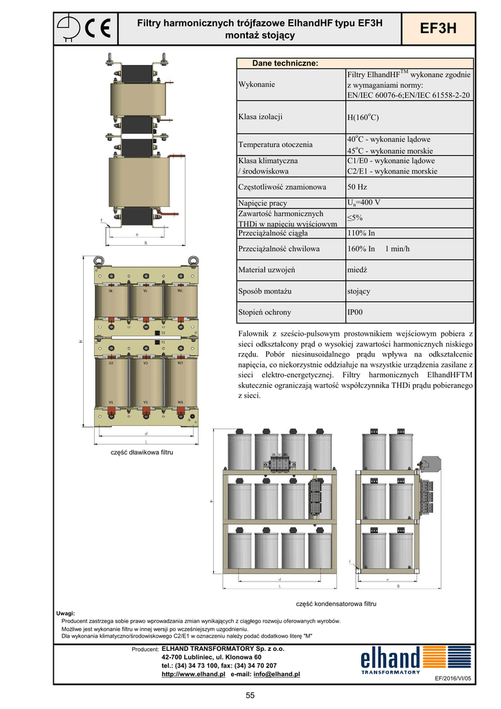 Filtry harmonicznych trójfazowe ElhandHF typu EF3H montaż stojący EF3H Dane techniczne: Wykonanie TM Filtry ElhandHF wykonane zgodnie z wymaganiami normy: EN/IEC 60076-6;EN/IEC 61558-2-20 Klasa izolacji H(160oC) Klasa klimatyczna / środowiskowa 40oC - wykonanie lądowe 45oC - wykonanie morskie C1/E0 - wykonanie lądowe C2/E1 - wykonanie morskie Częstotliwość znamionowa 50 Hz Napięcie pracy Zawartość harmonicznych THDi w napięciu wyjściowym Przeciążalność ciągła Un=400 V Przeciążalność chwilowa 160% In Materiał uzwojeń miedź Sposób montażu stojący Stopień ochrony IP00 Temperatura otoczenia ≤5% 110% In 1 min/h Falownik z sześcio-pulsowym prostownikiem wejściowym pobiera z sieci odkształcony prąd o wysokiej zawartości harmonicznych niskiego rzędu. Pobór niesinusoidalnego prądu wpływa na odkształcenie napięcia, co niekorzystnie oddziałuje na wszystkie urządzenia zasilane z sieci elektro-energetycznej. Filtry harmonicznych ElhandHFTM skutecznie ograniczają wartość współczynnika THDi prądu pobieranego z sieci. część dławikowa filtru część kondensatorowa filtru Uwagi: Producent zastrzega sobie prawo wprowadzania zmian wynikających z ciągłego rozwoju oferowanych wyrobów. Możliwe jest wykonanie filtru w innej wersji po wcześniejszym uzgodnieniu. Dla wykonania klimatyczno/środowiskowego C2/E1 w oznaczeniu należy podać dodatkowo literę "M" Producent: ELHAND TRANSFORMATORY Sp. z o.o. 42-700 Lubliniec, ul. Klonowa 60 tel.: (34) 34 73 100, fax: (34) 34 70 207 http://www.elhand.pl e-mail: [email protected] 55 EF/2016/VI/05 EF3H Filtry harmonicznych trójfazowe ElhandHF typu EF3H montaż stojący Parametry techniczne filtrów trójfazowych EF3H Typ filtru Moc napędu [kW] EF3H-160/400/50 EF3H-200/400/50 EF3H-250/400/50 EF3H-315/400/50 EF3H-355/400/50 EF3H-400/400/50 EF3H-500/400/50 EF3H-560/400/50 EF3H-630/400/50 160 200 250 315 355 400 500 560 630 Bateria CAP1 CAP2 CAP3 CAP4 L [mm] 360 360 520 680 Wymiary części dławikowej L[mm] B[mm] H[mm] d[mm] 420 420 420 480 480 480 540 540 540 240 260 290 300 325 340 360 380 405 755 755 755 855 855 855 965 965 965 370 370 370 430 430 430 490 490 490 e[mm] f[mm] 152 172 192 204 214 234 234 254 274 4x(13x18) 4x(13x18) 4x(13x18) 4x(13x18) 4x(13x18) 4x(13x18) 4x(13x18) 4x(13x18) 4x(13x18) H [mm] 940 940 940 940 B [mm] 290 465 500 510 d [mm] 270 270 430 490 Bateria kondensatorów Masa całkowita [kg] CAP1 CAP2 CAP2 CAP2 CAP3 CAP3 CAP4 CAP4 CAP4 146 185 219 254 292 322 371 420 482 e [mm] 190 350 350 350 f [mm] 4xø13 4xø13 4xø13 4xø13 Uwagi: Producent zastrzega sobie prawo wprowadzania zmian wynikających z ciągłego rozwoju oferowanych wyrobów. Możliwe jest wykonanie filtru w innej wersji po wcześniejszym uzgodnieniu. Dla wykonania klimatyczno/środowiskowego C2/E1 w oznaczeniu należy podać dodatkowo literę "M" EF/2016/VI/06 Producent: ELHAND TRANSFORMATORY Sp. z o.o. 42-700 Lubliniec, ul. Klonowa 60 tel.: (34) 34 73 100, fax: (34) 34 70 207 http://www.elhand.pl e-mail: [email protected] 56