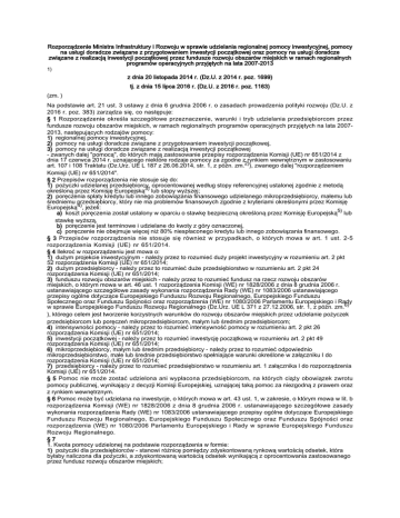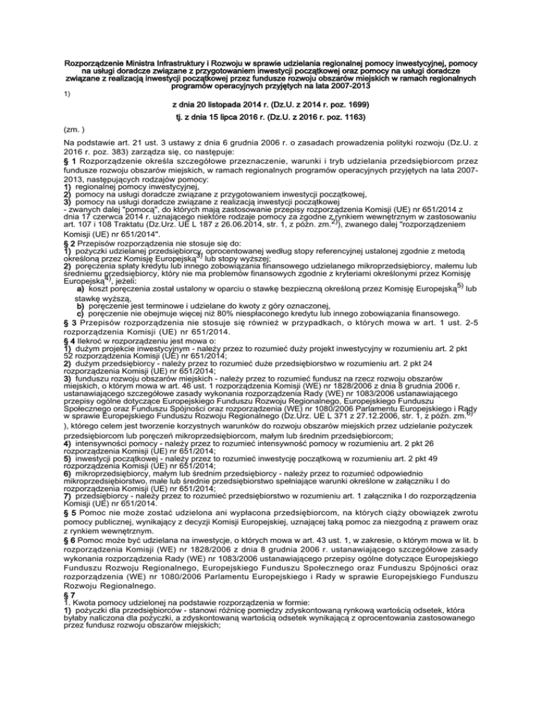 Rozporządzenie Ministra Infrastruktury i Rozwoju w sprawie udzielania regionalnej pomocy inwestycyjnej, pomocy na usługi doradcze związane z przygotowaniem inwestycji początkowej oraz pomocy na usługi doradcze związane z realizacją inwestycji początkowej przez fundusze rozwoju obszarów miejskich w ramach regionalnych programów operacyjnych przyjętych na lata 2007-2013 1) z dnia 20 listopada 2014 r. (Dz.U. z 2014 r. poz. 1699) tj. z dnia 15 lipca 2016 r. (Dz.U. z 2016 r. poz. 1163) (zm. ) Na podstawie art. 21 ust. 3 ustawy z dnia 6 grudnia 2006 r. o zasadach prowadzenia polityki rozwoju (Dz.U. z 2016 r. poz. 383) zarządza się, co następuje: § 1 Rozporządzenie określa szczegółowe przeznaczenie, warunki i tryb udzielania przedsiębiorcom przez fundusze rozwoju obszarów miejskich, w ramach regionalnych programów operacyjnych przyjętych na lata 20072013, następujących rodzajów pomocy: 1) regionalnej pomocy inwestycyjnej, 2) pomocy na usługi doradcze związane z przygotowaniem inwestycji początkowej, 3) pomocy na usługi doradcze związane z realizacją inwestycji początkowej - zwanych dalej "pomocą", do których mają zastosowanie przepisy rozporządzenia Komisji (UE) nr 651/2014 z dnia 17 czerwca 2014 r. uznającego niektóre rodzaje pomocy za zgodne z rynkiem wewnętrznym w zastosowaniu art. 107 i 108 Traktatu (Dz.Urz. UE L 187 z 26.06.2014, str. 1, z późn. zm.2)), zwanego dalej "rozporządzeniem Komisji (UE) nr 651/2014". § 2 Przepisów rozporządzenia nie stosuje się do: 1) pożyczki udzielanej przedsiębiorcy, oprocentowanej według stopy referencyjnej ustalonej zgodnie z metodą określoną przez Komisję Europejską3) lub stopy wyższej; 2) poręczenia spłaty kredytu lub innego zobowiązania finansowego udzielanego mikroprzedsiębiorcy, małemu lub średniemu przedsiębiorcy, który nie ma problemów finansowych zgodnie z kryteriami określonymi przez Komisję Europejską4), jeżeli: a) koszt poręczenia został ustalony w oparciu o stawkę bezpieczną określoną przez Komisję Europejską5) lub stawkę wyższą, b) poręczenie jest terminowe i udzielane do kwoty z góry oznaczonej, c) poręczenie nie obejmuje więcej niż 80% niespłaconego kredytu lub innego zobowiązania finansowego. § 3 Przepisów rozporządzenia nie stosuje się również w przypadkach, o których mowa w art. 1 ust. 2-5 rozporządzenia Komisji (UE) nr 651/2014. § 4 Ilekroć w rozporządzeniu jest mowa o: 1) dużym projekcie inwestycyjnym - należy przez to rozumieć duży projekt inwestycyjny w rozumieniu art. 2 pkt 52 rozporządzenia Komisji (UE) nr 651/2014; 2) dużym przedsiębiorcy - należy przez to rozumieć duże przedsiębiorstwo w rozumieniu art. 2 pkt 24 rozporządzenia Komisji (UE) nr 651/2014; 3) funduszu rozwoju obszarów miejskich - należy przez to rozumieć fundusz na rzecz rozwoju obszarów miejskich, o którym mowa w art. 46 ust. 1 rozporządzenia Komisji (WE) nr 1828/2006 z dnia 8 grudnia 2006 r. ustanawiającego szczegółowe zasady wykonania rozporządzenia Rady (WE) nr 1083/2006 ustanawiającego przepisy ogólne dotyczące Europejskiego Funduszu Rozwoju Regionalnego, Europejskiego Funduszu Społecznego oraz Funduszu Spójności oraz rozporządzenia (WE) nr 1080/2006 Parlamentu Europejskiego i Rady w sprawie Europejskiego Funduszu Rozwoju Regionalnego (Dz.Urz. UE L 371 z 27.12.2006, str. 1, z późn. zm.6) ), którego celem jest tworzenie korzystnych warunków do rozwoju obszarów miejskich przez udzielanie pożyczek przedsiębiorcom lub poręczeń mikroprzedsiębiorcom, małym lub średnim przedsiębiorcom; 4) intensywności pomocy - należy przez to rozumieć intensywność pomocy w rozumieniu art. 2 pkt 26 rozporządzenia Komisji (UE) nr 651/2014; 5) inwestycji początkowej - należy przez to rozumieć inwestycję początkową w rozumieniu art. 2 pkt 49 rozporządzenia Komisji (UE) nr 651/2014; 6) mikroprzedsiębiorcy, małym lub średnim przedsiębiorcy - należy przez to rozumieć odpowiednio mikroprzedsiębiorstwo, małe lub średnie przedsiębiorstwo spełniające warunki określone w załączniku I do rozporządzenia Komisji (UE) nr 651/2014; 7) przedsiębiorcy - należy przez to rozumieć przedsiębiorstwo w rozumieniu art. 1 załącznika I do rozporządzenia Komisji (UE) nr 651/2014. § 5 Pomoc nie może zostać udzielona ani wypłacona przedsiębiorcom, na których ciąży obowiązek zwrotu pomocy publicznej, wynikający z decyzji Komisji Europejskiej, uznającej taką pomoc za niezgodną z prawem oraz z rynkiem wewnętrznym. § 6 Pomoc może być udzielana na inwestycje, o których mowa w art. 43 ust. 1, w zakresie, o którym mowa w lit. b rozporządzenia Komisji (WE) nr 1828/2006 z dnia 8 grudnia 2006 r. ustanawiającego szczegółowe zasady wykonania rozporządzenia Rady (WE) nr 1083/2006 ustanawiającego przepisy ogólne dotyczące Europejskiego Funduszu Rozwoju Regionalnego, Europejskiego Funduszu Społecznego oraz Funduszu Spójności oraz rozporządzenia (WE) nr 1080/2006 Parlamentu Europejskiego i Rady w sprawie Europejskiego Funduszu Rozwoju Regionalnego. §7 1. Kwota pomocy udzielonej na podstawie rozporządzenia w formie: 1) pożyczki dla przedsiębiorców - stanowi różnicę pomiędzy zdyskontowaną rynkową wartością odsetek, która byłaby naliczona dla pożyczki, a zdyskontowaną wartością odsetek wynikającą z oprocentowania zastosowanego przez fundusz rozwoju obszarów miejskich; 2) poręczenia dla mikroprzedsiębiorców, małych lub średnich przedsiębiorców - stanowi różnicę między zdyskontowaną wartością rynkowej opłaty prowizyjnej, jaka byłaby pobrana od udzielanego poręczenia, a zdyskontowaną wartością opłaty prowizyjnej pobieranej przez fundusz rozwoju obszarów miejskich. 2. Rynkowa wartość odsetek, o której mowa w ust. 1 pkt 1, jest wyliczana na podstawie stóp referencyjnych ustalonych zgodnie z metodą określoną przez Komisję Europejską7). 3. Przez rynkową opłatę prowizyjną, o której mo