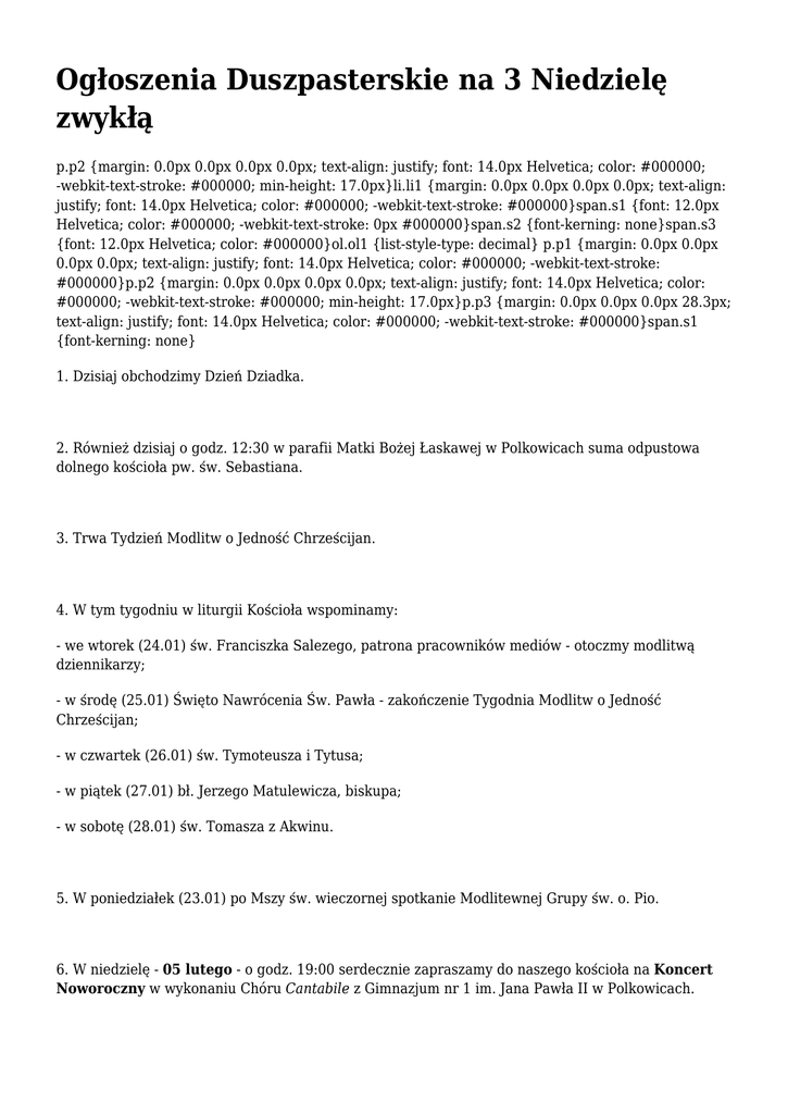 Ogłoszenia Duszpasterskie na 3 Niedzielę zwykłą