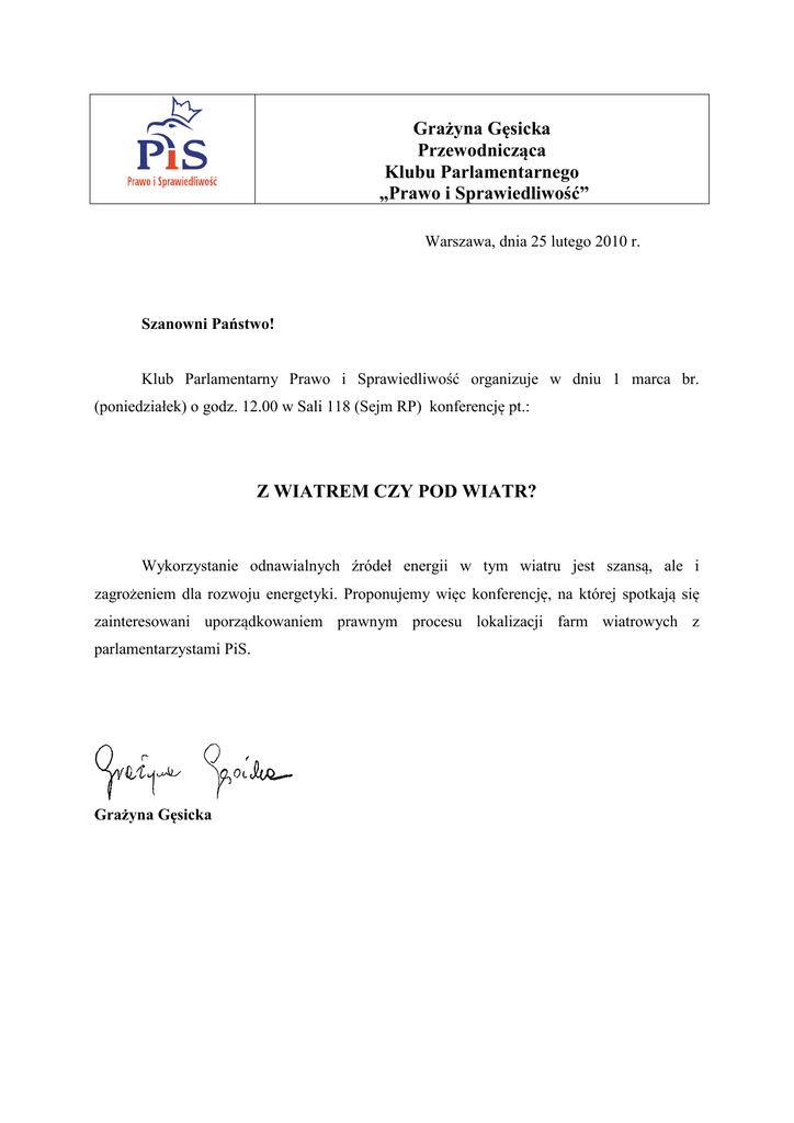 Grażyna Gęsicka Przewodnicząca Klubu Parlamentarnego „Prawo i Sprawiedliwość” Warszawa, dnia 25 lutego 2010 r. Szanowni Państwo! Klub Parlamentarny Prawo i Sprawiedliwość organizuje w dniu 1 marca br. (poniedziałek) o godz. 12.00 w Sali 118 (Sejm RP) konferencję pt.: Z WIATREM CZY POD WIATR? Wykorzystanie odnawialnych źródeł energii w tym wiatru jest szansą, ale i zagrożeniem dla rozwoju energetyki. Proponujemy więc konferencję, na której spotkają się zainteresowani uporządkowaniem prawnym procesu lokalizacji farm wiatrowych z parlamentarzystami PiS. Grażyna Gęsicka Program konferencji: Z WIATREM CZY POD WIATR? 1. Wystąpienie wprowadzające – Grażyna Gęsicka, Przewodnicząca Klubu Parlamentarnego Prawo i Sprawiedliwość 2. Przedstawienie problematyki związanej z inwestycjami energii odnawialnej – lokalizacje farm wiatrowych w Polsce 3. Prezentacja opinii i badań naukowców współpracujących z PAN oraz wspierających przeciwko lokalne organizacje niewłaściwej procedurze i stowarzyszenia inwestowania w protestujące elektrownie wiatrowe 4. Dyskusja – wypowiedzi zainteresowanych 5. Propozycje zmian ustawowych mające na celu uporządkowanie prawne lokalizacji farm wiatrowych 6. Ocena propozycji zmian przez zainteresowanych – dyskusja 7. Moratorium do Premiera RP z wezwaniem do wstrzymania inwestycji „wiatrowych” do czasu uregulowań prawnych Organizatorzy: Anna Zalewska, Aleksandra Natalli – Świat, Marek Kuchciński, Krzysztof Jurgiel,
