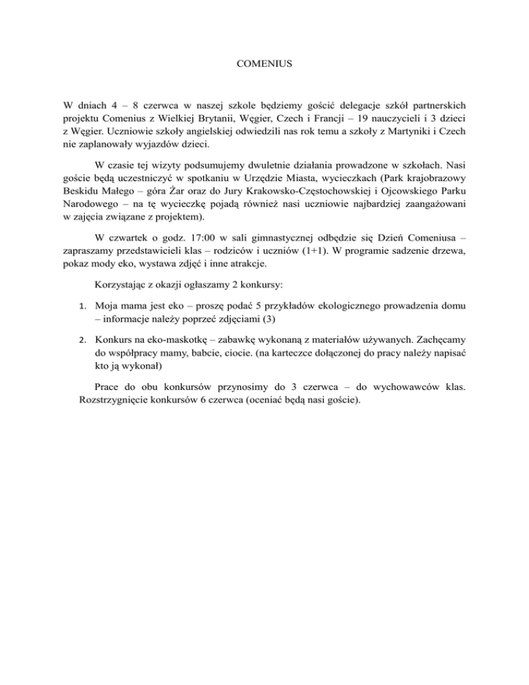 COMENIUS W dniach 4 – 8 czerwca w naszej szkole będziemy gościć delegacje szkół partnerskich projektu Comenius z Wielkiej Brytanii, Węgier, Czech i Francji – 19 nauczycieli i 3 dzieci z Węgier. Uczniowie szkoły angielskiej odwiedzili nas rok temu a szkoły z Martyniki i Czech nie zaplanowały wyjazdów dzieci. W czasie tej wizyty podsumujemy dwuletnie działania prowadzone w szkołach. Nasi goście będą uczestniczyć w spotkaniu w Urzędzie Miasta, wycieczkach (Park krajobrazowy Beskidu Małego – góra Żar oraz do Jury Krakowsko-Częstochowskiej i Ojcowskiego Parku Narodowego – na tę wycieczkę pojadą również nasi uczniowie najbardziej zaangażowani w zajęcia związane z projektem). W czwartek o godz. 17:00 w sali gimnastycznej odbędzie się Dzień Comeniusa – zapraszamy przedstawicieli klas – rodziców i uczniów (1+1). W programie sadzenie drzewa, pokaz mody eko, wystawa zdjęć i inne atrakcje. Korzystając z okazji ogłaszamy 2 konkursy: 1. Moja mama jest eko – proszę podać 5 przykładów ekologicznego prowadzenia domu – informacje należy poprzeć zdjęciami (3) 2. Konkurs na eko-maskotkę – zabawkę wykonaną z materiałów używanych. Zachęcamy do współpracy mamy, babcie, ciocie. (na karteczce dołączonej do pracy należy napisać kto ją wykonał) Prace do obu konkursów przynosimy do 3 czerwca – do wychowawców klas. Rozstrzygnięcie konkursów 6 czerwca (oceniać będą nasi goście).