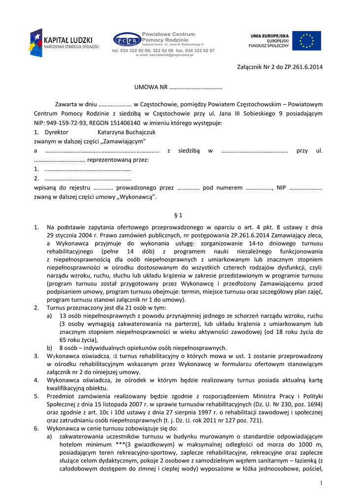 Powiatowe Centrum Pomocy Rodzinie Częstochowa ul. Jana III Sobieskiego 9 tel. 034 322 92 08; 322 92 06 fax. 034 322 92 07 e–mail: [email protected] Załącznik Nr 2 do ZP.261.6.2014 UMOWA NR …………………………….. Zawarta w dniu …………………. w Częstochowie, pomiędzy Powiatem Częstochowskim – Powiatowym Centrum Pomocy Rodzinie z siedzibą w Częstochowie przy ul. Jana III Sobieskiego 9 posiadającym NIP: 949-159-72-93, REGON 151406140 w imieniu którego występuje: 1. Dyrektor Katarzyna Buchajczuk zwanym w dalszej części „Zamawiającym” a ………………………………………………………………… z siedzibą w …………………………………….. przy ul. ……………………………. reprezentowaną przez: 1. ………………………………………………… 2. ………………………………………………… wpisaną do rejestru …………. prowadzonego przez …………… pod numerem …………….., NIP …………………. zwaną w dalszej części umowy „Wykonawcą”. §1 1. 2. 3. 4. 5. 6. Na podstawie zapytania ofertowego przeprowadzonego w oparciu o art. 4 pkt. 8 ustawy z dnia 29 stycznia 2004 r. Prawo zamówień publicznych, nr postępowania ZP.261.6.2014 Zamawiający zleca, a Wykonawca przyjmuje do wykonania usługę: zorganizowanie 14-to dniowego turnusu rehabilitacyjnego (pełne 14 dób) z programem nauki niezależnego funkcjonowania z niepełnosprawnością dla osób niepełnosprawnych z umiarkowanym lub znacznym stopniem niepełnosprawności w ośrodku dostosowanym do wszystkich czterech rodzajów dysfunkcji, czyli: narządu wzroku, ruchu, słuchu lub układu krążenia w zakresie przedstawionym w programie turnusu (program turnusu został przygotowany przez Wykonawcę i przedłożony Zamawiającemu przed podpisaniem umowy, program turnusu obejmuje: termin, miejsce turnusu oraz szczegółowy plan zajęć, program turnusu stanowi załącznik nr 1 do umowy). Turnus przeznaczony jest dla 21 osób w tym: a) 13 osób niepełnosprawnych z powodu przynajmniej jednego ze schorzeń narządu wzroku, ruchu (3 osoby wymagają zakwaterowania na parterze), lub układu krążenia z umiarkowanym lub znacznym stopniem niepełnosprawności w wieku aktywności zawodowej (od 18 roku życia do 65 roku życia), b) 8 osób – indywidualnych opiekunów osób niepełnosprawnych. Wykonawca oświadcza, iż turnus rehabilitacyjny o których mowa w ust. 1 zostanie przeprowadzony w ośrodku rehabilitacyjnym wskazanym przez Wykonawcę w formularzu ofertowym stanowiącym załącznik nr 2 do niniejszej umowy. Wykonawca oświadcza, że ośrodek w którym będzie realizowany turnus posiada aktualną kartę kwalifikacyjną obiektu. Przedmiot zamówienia realizowany będzie zgodnie z rozporządzeniem Ministra Pracy i Polityki Społecznej z dnia 15 listopada 2007 r. w sprawie turnusów rehabilitacyjnych (Dz. U. Nr 230, poz. 1694) oraz zgodnie z art. 10c i 10d ustawy z dnia 27 sierpnia 1997 r. o rehabilitacji zawodowej i społecznej oraz zatrudnianiu osób niepełnosprawnych (t. j. Dz. U. rok 2011 nr 127 poz. 721). Wykonawca w cenie turnusu zobowiązuje się do: a) zakwaterowania uczestników turnusu w budynku murowanym o standardzie odpowiadającym hotelom minimum ***(3 gwiazdkowym) w maksymalnej odległości od morza do 1000 m, posiadającym teren rekreacyjno-sportowy, zaplecze rehabilitacyjne, rekreacyjne oraz zaplecze służące celom dydaktycznym, pokoje 2 osobowe z samodzielnym węzłem sanitarnym – łazienką (z całodobowym dostępem do zimnej i ciepłej wody) wyposażone w łóżka jednoosobowe, pościel, 1 Powiatowe Centrum Pomocy Rodzinie Częstochowa ul. Jana III Sobieskiego 9 tel. 034 322 92 08; 322 92 06 fax. 034 322 92 07 e–mail: [email protected] 7. 8. 9. ręczniki, koce, szafy, stoliki, krzesła, lampki nocne, telewizor i radio - szczegółowe wymagania dotyczące zakwaterowania tj. wyposażenia, zakresu świadczonych usług, w tym usług gastronomicznych mają być zgodne z wytycznymi dotyczącymi hotelu 3-gwiazdkowego zawartymi w załączniku nr 1 do Rozporządzenie Ministra Gospodarki i Pracy z dnia 19 sierpnia 2004 r. w sprawie obiektów hotelarskich i innych obiektów, w których są świadczone usługi hotelarskie (t. j. Dz. U. rok 2006 nr 22 poz. 169 późn. zm.). b) zapewnienia wyżywienia zgodnie z zasadami higieny oraz racjonalnego żywienia. W okres turnusu (14 pełnych dób) nie zalicza się czasu przeznaczonego na podróż w obie strony. W czasie trwania turnusu – 3 posiłki dziennie (śniadanie, obiad – pierwsze i drugie danie oraz deser, kolacja), suchy prowiant na wycieczkę i drogę powrotną, c) zapewnienia bezpłatnej całodobowej opieki medycznej (stała opieka pielęgniarska, lekarz na dyżurze telefonicznym), 20 zabiegów rehabilitacyjnych dostosowanych do indywidualnych potrzeb każdej osoby niepełnosprawnej, zleconych przez lekarza ośrodka rehabilitacyjnowypoczynkowego na podstawie informacji o stanie zdrowia. Zabiegi dla uczestników turnusu będą zaordynowane pod warunkiem dostarczenia informacji o stanie zdrowia osoby niepełnosprawnej podpisanej przez lekarza kierującego na turnus z miejsca zamieszkania. Koszty związane z zakupem leków podstawowych niezbędnych do zabiegów rehabilitacyjnych ponosi Wykonawca, d) zorganizowania 1 (jednej) wycieczki fakultatywnej autokarowej, zorganizowanie ogniska z pieczeniem kiełbasek oraz zapewnieniem ciepłych i zimnych napoi, 2 wieczorków tanecznych, korzystanie z bazy rekreacyjno-sportowej w miejscu zakwaterowania. Koszty związane z programem integracji społecznej ponosi Wykonawca, e) zapewnienia transportu na turnus wraz z drogą powrotną z Częstochowy do Ośrodka Rehabilitacyjnego sprawnym technicznie autokarem wysokiej klasy, wyposażonymi w toaletę i klimatyzację oraz posiadającymi aktualny przegląd techniczny, f) wniesienia opłaty klimatycznej za uczestników turnusu, g) zapewnienia na czas podróży w obie