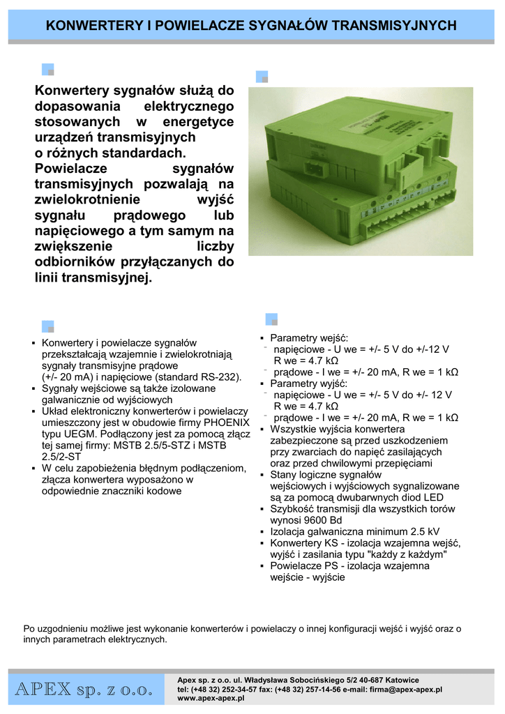 KONWERTERY I POWIELACZE SYGNAŁÓW TRANSMISYJNYCH TRANSMISYJNYCH Konwertery sygnałów służą do dopasowania elektrycznego stosowanych w energetyce urządzeń transmisyjnych o różnych standardach. Powielacze sygnałów transmisyjnych pozwalają na zwielokrotnienie wyjść sygnału prądowego lub napięciowego a tym samym na zwiększenie liczby odbiorników przyłączanych do linii transmisyjnej. Konwertery i powielacze sygnałów przekształcają wzajemnie i zwielokrotniają sygnały transmisyjne prądowe (+/- 20 mA) i napięciowe (standard RS-232). Sygnały wejściowe są także izolowane galwanicznie od wyjściowych Układ elektroniczny konwerterów i powielaczy umieszczony jest w obudowie firmy PHOENIX typu UEGM. Podłączony jest za pomocą złącz tej samej firmy: MSTB 2.5/5-STZ i MSTB 2.5/2-ST W celu zapobieżenia błędnym podłączeniom, złącza konwertera wyposażono w odpowiednie znaczniki kodowe ‾ ‾ ‾ ‾ Parametry wejść: napięciowe - U we = +/- 5 V do +/-12 V R we = 4.7 kΩ prądowe - I we = +/- 20 mA, R we = 1 kΩ Parametry wyjść: napięciowe - U we = +/- 5 V do +/- 12 V R we = 4.7 kΩ prądowe - I we = +/- 20 mA, R we = 1 kΩ Wszystkie wyjścia konwertera zabezpieczone są przed uszkodzeniem przy zwarciach do napięć zasilających oraz przed chwilowymi przepięciami Stany logiczne sygnałów wejściowych i wyjściowych sygnalizowane są za pomocą dwubarwnych diod LED Szybkość transmisji dla wszystkich torów wynosi 9600 Bd Izolacja galwaniczna minimum 2.5 kV Konwertery KS - izolacja wzajemna wejść, wyjść i zasilania typu "każdy z każdym" Powielacze PS - izolacja wzajemna wejście - wyjście Po uzgodnieniu możliwe jest wykonanie konwerterów i powielaczy o innej konfiguracji wejść i wyjść oraz o innych parametrach elektrycznych. APEX sp. z o.o. Apex sp. z o.o. ul. Władysława Sobocińskiego 5/2 40-687 Katowice tel: (+48 32) 252-34-57 fax: (+48 32) 257-14-56 e-mail: [email protected] www.apex-apex.pl