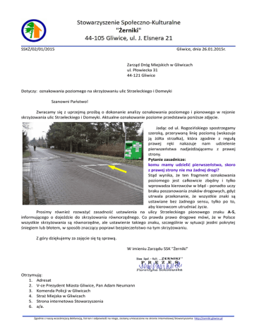 SSKŻ/02/01/2015 Gliwice, dnia 26.01.2015r. Zarząd Dróg Miejskich w Gliwicach ul. Płowiecka 31 44-121 Gliwice Dotyczy: oznakowania poziomego na skrzyżowaniu ulic Strzeleckiego i Domeyki Szanowni Państwo! Zwracamy się z uprzejmą prośbą o dokonanie analizy oznakowania poziomego i pionowego w rejonie skrzyżowania ulic Strzeleckiego i Domeyki. Aktualne oznakowanie poziome przedstawia poniższe zdjęcie. Jadąc od ul. Rogozińskiego spostrzegamy szeroką, przerywaną linię poziomą (wskazuje ją żółta strzałka), która zgodnie z regułą prawej ręki nakazuje nam udzielenie pierwszeństwa nadjeżdżającemu z prawej strony. Pytanie zasadnicze: komu mamy udzielić pierwszeństwa, skoro z prawej strony nie ma żadnej drogi? Stąd wynika, że ten fragment oznakowania poziomego jest całkowicie zbędny i tylko wprowadza kierowców w błąd - ponadto uczy braku poszanowania znaków drogowych, gdyż utrwala przekonanie, że wszystkie znaki są ustawiane bez żadnego sensu, tylko po to, aby kierowcom utrudniać życie. Prosimy również rozważyć zasadność ustawienia na ulicy Strzeleckiego pionowego znaku A-5, informującego o dojeździe do skrzyżowania równorzędnego. Co prawda prawo drogowe mówi, że w Polsce wszystkie skrzyżowania są równorzędne, ale ustawienie takiego znaku, szczególnie w sytuacji jezdni pokrytej śniegiem lub błotem, w sposób znaczący poprawi bezpieczeństwo na tym skrzyżowaniu. Z góry dziękujemy za zajęcie się tą sprawą. W imieniu Zarządu SSK "Żerniki" Otrzymują: 1. Adresat 2. V-ce Prezydent Miasta Gliwice, Pan Adam Neumann 3. Komenda Policji w Gliwicach 4. Straż Miejska w Gliwicach 5. Strona internetowa Stowarzyszenia 6. a/a. Zgodnie z naszą wcześniejszą deklaracją, list ten i odpowiedź na niego, zostaną umieszczone na stronie internetowej Stowarzyszenia: http://zerniki.gliwice.pl