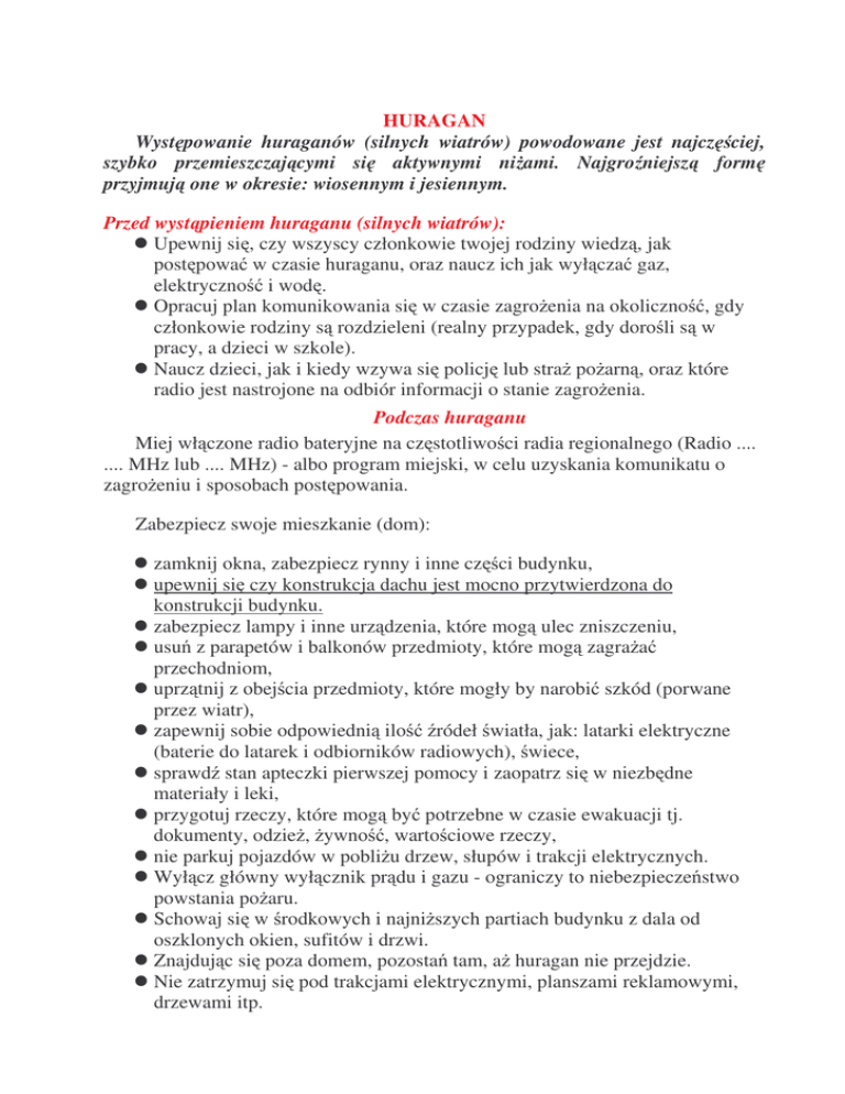 HURAGAN Wyst powanie huraganów (silnych wiatrów) powodowane jest najcz ciej, szybko przemieszczaj cymi si aktywnymi ni ami. Najgro niejsz form przyjmuj one w okresie: wiosennym i jesiennym. Przed wyst pieniem huraganu (silnych wiatrów): Upewnij si , czy wszyscy członkowie twojej rodziny wiedz , jak post powa w czasie huraganu, oraz naucz ich jak wył cza gaz, elektryczno i wod . Opracuj plan komunikowania si w czasie zagro enia na okoliczno , gdy członkowie rodziny s rozdzieleni (realny przypadek, gdy doro li s w pracy, a dzieci w szkole). Naucz dzieci, jak i kiedy wzywa si policj lub stra po arn , oraz które radio jest nastrojone na odbiór informacji o stanie zagro enia. Podczas huraganu Miej wł czone radio bateryjne na cz stotliwo ci radia regionalnego (Radio .... .... MHz lub .... MHz) - albo program miejski, w celu uzyskania komunikatu o zagro eniu i sposobach post powania. Zabezpiecz swoje mieszkanie (dom): zamknij okna, zabezpiecz rynny i inne cz ci budynku, upewnij si czy konstrukcja dachu jest mocno przytwierdzona do konstrukcji budynku. zabezpiecz lampy i inne urz dzenia, które mog ulec zniszczeniu, usu z parapetów i balkonów przedmioty, które mog zagra a przechodniom, uprz tnij z obej cia przedmioty, które mogły by narobi szkód (porwane przez wiatr), zapewnij sobie odpowiedni ilo ródeł wiatła, jak: latarki elektryczne (baterie do latarek i odbiorników radiowych), wiece, sprawd stan apteczki pierwszej pomocy i zaopatrz si w niezb dne materiały i leki, przygotuj rzeczy, które mog by potrzebne w czasie ewakuacji tj. dokumenty, odzie , ywno , warto ciowe rzeczy, nie parkuj pojazdów w pobli u drzew, słupów i trakcji elektrycznych. Wył cz główny wył cznik pr du i gazu - ograniczy to niebezpiecze stwo powstania po aru. Schowaj si w rodkowych i najni szych partiach budynku z dala od oszklonych okien, sufitów i drzwi. Znajduj c si poza domem, pozosta tam, a huragan nie przejdzie. Nie zatrzymuj si pod trakcjami elektrycznymi, planszami reklamowymi, drzewami itp. Je eli słu by ratownicze zalecaj ewakuacj : wyrusz tak szybko jak to tylko mo liwe, opuszczaj c mieszkanie wył cz energi elektryczn , oraz główny zawór wody i gazu. Wyga ogie w piecach, oraz zabezpiecz dom, zawiadom kogo , poza zasi giem wichury, dok d si ewakuujesz, zabierz przygotowany zawczasu podr czny baga , oraz ciepł odzie . Po huraganie Udziel pierwszej pomocy rannym i poszkodowanym osobom. Unikaj le cych lub zwisaj cych przewodów elektrycznych. Ostro nie wkraczaj do swego domu. Sprawd instalacj (gazow , elektryczn , wodoci gow i ciekow ) w zniszczonym domu. O wszystkich zdarzeniach, maj cych istotne znaczenie dla bezpiecze stwa ludzi informuj: słu by dy urne Stra y Po arnej, Policji, pogotowie energetyczne, gazowe, inne.