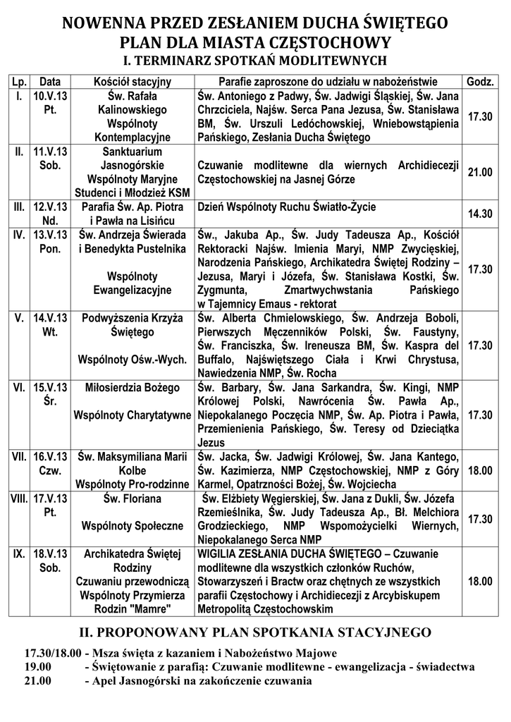 NOWENNA PRZED ZESŁANIEM DUCHA ŚWIĘTEGO PLAN DLA MIASTA CZĘSTOCHOWY I. TERMINARZ SPOTKAŃ MODLITEWNYCH Lp. Data I. 10.V.13 Pt. Kościół stacyjny Św. Rafała Kalinowskiego Wspólnoty Kontemplacyjne II. 11.V.13 Sanktuarium Sob. Jasnogórskie Wspólnoty Maryjne Studenci i Młodzież KSM III. 12.V.13 Parafia Św. Ap. Piotra Nd. i Pawła na Lisińcu IV. 13.V.13 Św. Andrzeja Świerada Pon. i Benedykta Pustelnika Wspólnoty Ewangelizacyjne V. 14.V.13 Wt. Podwyższenia Krzyża Świętego Wspólnoty Ośw.-Wych. VI. 15.V.13 Śr. Miłosierdzia Bożego Wspólnoty Charytatywne VII. 16.V.13 Św. Maksymiliana Marii Czw. Kolbe Wspólnoty Pro-rodzinne VIII. 17.V.13 Św. Floriana Pt. Wspólnoty Społeczne IX. 18.V.13 Sob. Archikatedra Świętej Rodziny Czuwaniu przewodniczą Wspólnoty Przymierza Rodzin "Mamre" Parafie zaproszone do udziału w nabożeństwie Godz. Św. Antoniego z Padwy, Św. Jadwigi Śląskiej, Św. Jana Chrzciciela, Najśw. Serca Pana Jezusa, Św. Stanisława 17.30 BM, Św. Urszuli Ledóchowskiej, Wniebowstąpienia Pańskiego, Zesłania Ducha Świętego Czuwanie modlitewne dla wiernych Archidiecezji 21.00 Częstochowskiej na Jasnej Górze Dzień Wspólnoty Ruchu Światło-Życie Św., Jakuba Ap., Św. Judy Tadeusza Ap., Kościół Rektoracki Najśw. Imienia Maryi, NMP Zwycięskiej, Narodzenia Pańskiego, Archikatedra Świętej Rodziny – Jezusa, Maryi i Józefa, Św. Stanisława Kostki, Św. Zygmunta, Zmartwychwstania Pańskiego w Tajemnicy Emaus - rektorat Św. Alberta Chmielowskiego, Św. Andrzeja Boboli, Pierwszych Męczenników Polski, Św. Faustyny, Św. Franciszka, Św. Ireneusza BM, Św. Kaspra del Buffalo, Najświętszego Ciała i Krwi Chrystusa, Nawiedzenia NMP, Św. Rocha Św. Barbary, Św. Jana Sarkandra, Św. Kingi, NMP Królowej Polski, Nawrócenia Św. Pawła Ap., Niepokalanego Poczęcia NMP, Św. Ap. Piotra i Pawła, Przemienienia Pańskiego, Św. Teresy od Dzieciątka Jezus Św. Jacka, Św. Jadwigi Królowej, Św. Jana Kantego, Św. Kazimierza, NMP Częstochowskiej, NMP z Góry Karmel, Opatrzności Bożej, Św. Wojciecha Św. Elżbiety Węgierskiej, Św. Jana z Dukli, Św. Józefa Rzemieślnika, Św. Judy Tadeusza Ap., Bł. Melchiora Grodzieckiego, NMP Wspomożycielki Wiernych, Niepokalanego Serca NMP WIGILIA ZESŁANIA DUCHA ŚWIĘTEGO – Czuwanie modlitewne dla wszystkich członków Ruchów, Stowarzyszeń i Bractw oraz chętnych ze wszystkich parafii Częstochowy i Archidiecezji z Arcybiskupem Metropolitą Częstochowskim 14.30 17.30 17.30 17.30 18.00 17.30 18.00 II. PROPONOWANY PLAN SPOTKANIA STACYJNEGO 17.30/18.00 - Msza święta z kazaniem i Nabożeństwo Majowe 19.00 - Świętowanie z parafią: Czuwanie modlitewne - ewangelizacja - świadectwa 21.00 - Apel Jasnogórski na zakończenie czuwania