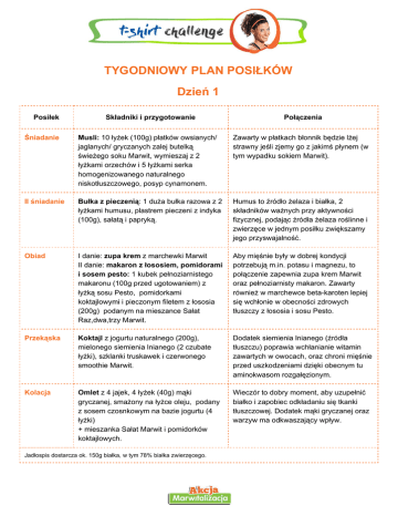 TYGODNIOWY PLAN POSIŁKÓW Dzień 1 Posiłek Składniki i przygotowanie Połączenia Śniadanie Musli: 10 łyżek (100g) płatków owsianych/ jaglanych/ gryczanych zalej butelką świeżego soku Marwit, wymieszaj z 2 łyżkami orzechów i 5 łyżkami serka homogenizowanego naturalnego niskotłuszczowego, posyp cynamonem. Zawarty w płatkach błonnik będzie lżej strawny jeśli zjemy go z jakimś płynem (w tym wypadku sokiem Marwit). II śniadanie Bułka z pieczenią : 1 duża bułka razowa z 2 łyżkami humusu, plastrem pieczeni z indyka (100g), sałatą i papryką. Humus to źródło żelaza i białka, 2 składników ważnych przy aktywności fizycznej, podając źródła żelaza roślinne i zwierzęce w jednym posiłku zwiększamy jego przyswajalność. Obiad I danie: zupa krem z marchewki Marwit II danie: makaron z łososiem, pomidorami i sosem pesto: 1 kubek pełnoziarnistego makaronu (100g przed ugotowaniem) z łyżką sosu Pesto, pomidorkami koktajlowymi i pieczonym filetem z łososia (200g) podanym na mieszance Sałat Raz,dwa,trzy Marwit. Aby mięśnie były w dobrej kondycji potrzebują m.in. potasu i magnezu, to połączenie zapewnia zupa krem Marwit oraz pełnoziarnisty makaron. Zawarty również w marchewce betakaroten lepiej się wchłonie w obecności zdrowych tłuszczy z łososia i sosu Pesto. Przekąska Koktajl z jogurtu naturalnego (200g), mielonego siemienia lnianego (2 czubate łyżki), szklanki truskawek i czerwonego smoothie Marwit. Dodatek siemienia lnianego (źródła tłuszczu) poprawia wchłanianie witamin zawartych w owocach, oraz chroni mięśnie przed uszkodzeniami dzięki obecnym tu aminokwasom rozgałęzionym. Kolacja Omlet z 4 jajek, 4 łyżek (40g) mąki gryczanej, smażony na łyżce oleju, podany z sosem czosnkowym na bazie jogurtu (4 łyżki) + mieszanka Sałat Marwit i pomidorków koktajlowych. Wieczór to dobry moment, aby uzupełnić białko i zapobiec odkładaniu się tkanki tłuszczowej. Dodatek mąki gryczanej oraz warzyw ma odkwaszający wpływ. Jadłospis dostarcza ok. 150g białka, w tym 78% białka zwierzęcego. Dzień 2 Posiłek Składniki i przygotowanie Połączenia Śniadanie Kanapki z pieczenią i sosem żurawinowym : 4 kromki chleba z pełnego ziarna (ok. 160g), 4 łyżeczki oleju lnianego, 4 łyżeczki konfitury z żurawiny do mięs, mieszanka sałat Marwit, 4 niegrube plastry pieczeni z indyka (200g), pomidor, papryka. Olejem lnianym możemy skrapiać nawet pieczywo, jego dodatek do potraw uzupełnia je w kwasy omega3, które mają działanie przeciwzapalne dla mięśni. II śniadanie Owsianka : Smoothie żółte Marwit, 5 łyżek (50g) płatków owsianych, 2 łyżki orzechów, pół małego jogurtu naturalnego 100g (wymieszać wszystkie składniki). Owocowe smoothie Marwit wzbogacamy płatkami owsianymi, orzechami i jogurtem, dzięki temu maleje indeks glikemiczny całej potrawy – w trakcie treningu nie poczujesz spadku energii a jeśli jesteś akurat w pracy nie będziesz miał ochoty na podjadanie. Obiad I danie: zupa krem z brokułów Marwit II danie: papryka nadziewana kurczakiem , kasza gryczana (100g), połówki papryki wypełnić pokrojoną piersią z kurczaka (150g), wymieszaną z łyżką oleju, 1 jajkiem, przykryć plastrem mozzarelli, gotować na parze lub piec ok. 30 min. W tej potrawie jest całe mnóstwo składników o odkwaszającym działaniu: zupa krem z brokułów, papryka oraz kasza gryczana. Każdą potrawę warto uzupełniać warzywami, to podstawa żywienia osoby aktywnej. Przekąska Sałatka : Garść mieszanki sałat Marwit + 1 łyżka oleju + 1 łyżka orzechów + posiekane w paski marwitki i jabłko, 5 łyżek (50g) kuskusu razowego. Marwitki i jabłko to źródło łatwo przyswajalnej energii, nie może się obejść bez dodatku tłuszczu dla lepszej przyswajalności, a razowy kuskus doda Ci energii na popołudniowym treningu. Kolacja Twarożek : 1 kostka twarożku chudego (200g) wymieszana ze 100g jogurtu naturalnego (pół małego), 1 łyżką oleju lnianego+ miseczka warzyw, 3 kromki chleba Graham podgrzane na tosty, butelka świeżego soku Marwit z grejpfruta. Przeciwzapalny olej lniany i bogato białkowy twaróg to doskonałe połączenie na wieczór. Sok z grejpfruta wypij przed lub po kolacji, świetnie działa na przyspieszenie metabolizmu i regenerację mięśniową. Jadłospis dostarcza ok. 150g białka, w tym 73% białka zwierzęcego. Dzień 3 Posiłek Śniadanie Składniki i przygotowanie Jajecznica : 4 jajka usmaż na 1 łyżce oleju rzepakowego, 3 kromki chleba z pełnego ziarna (160g) posmaruj serkiem homogenizowanym naturalnym (100g), zjedz z rzodkiewkami i pomidorkami koktajlowymi. Połączenia Nie warto oddzielać żółtek od białka – żółtka są najbardziej wartościowe i to dzięki nim aminokwasy białkowe zostaną lepiej przyswojone. II śniadanie Owoce, sok : gruszka, sok buraczkowojabłkowy Marwit, kule mocy*. Sok z buraka powinien pić każdy sportowiec! To idealne połączenie z sokiem z jabłek poprawia krążenie, perystaltykę, dzięki czemu energia szybciej dociera do mięśni, a metabolity są sprawnie usuwane. Łączymy go z kulami mocy – prosta energetyczna dawka energii. Obiad Spaghetti: ugotuj 100g razowego makaronu spaghetti, na łyżce oleju podsmaż 100g mielonej wołowiny ze 100g mielonego indyka, możesz to zrobić na zrumienionej cebuli z czosnkiem, wlej 500ml zupy krem Marwit z pomidorów, dopraw. Taki obiad na długo dostarczy ci energii, jest w nim wszystko czego potrzebujesz: białka i żelazo z mięsa, węglowodany wolnoprzyswajalne makaronu, potas z pomidorów oraz zdrowe tłuszcze. Przekąska Jogurt pitny naturalny (400ml), duży banan (ok. 250g), orzechy (2 czubate łyżki). Orzechy są bogactwem magnezu, który zapobiega przykurczom mięśniowym, dobrze łączą się z potasem, np. z banana. Kolacja Dorsz (200g) pieczony z cukinią (150g) i papryką (50g), na 2 łyżkach oleju rzepakowego, przykryty plastrem mozzarelii, ziołowy razowy kuskus (50g) 