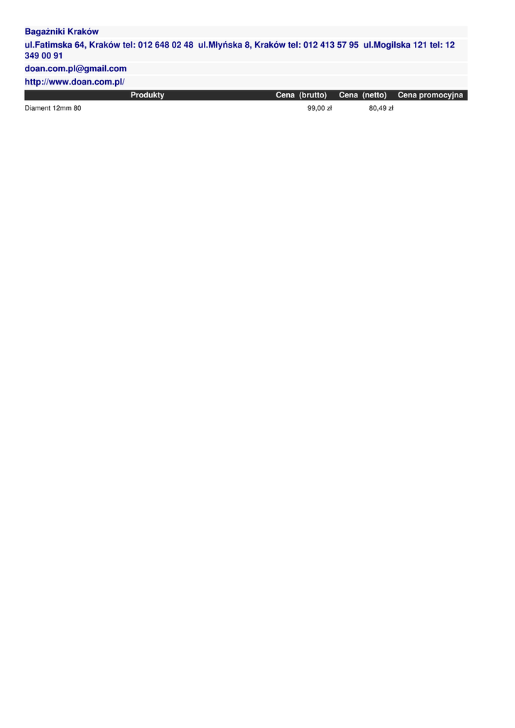Bagażniki Kraków ul.Fatimska 64, Kraków tel: 012 648 02 48 ul.Młyńska 8, Kraków tel: 012 413 57 95 ul.Mogilska 121 tel: 12 349 00 91 [email protected] http://www.doan.com.pl/ Produkty Diament 12mm 80 Cena (brutto) 99,00 zł Cena (netto) 80,49 zł Cena promocyjna