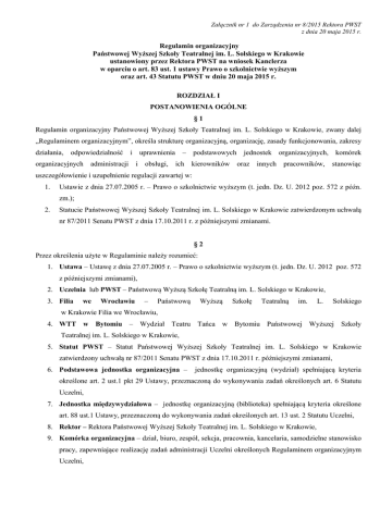 Załącznik nr 1 do Zarządzenia nr 8/2015 Rektora PWST z dnia 20 maja 2015 r. Regulamin organizacyjny Państwowej Wyższej Szkoły Teatralnej im. L. Solskiego w Krakowie ustanowiony przez Rektora PWST na wniosek Kanclerza w oparciu o art. 83 ust. 1 ustawy Prawo o szkolnictwie wyższym oraz art. 43 Statutu PWST w dniu 20 maja 2015 r. ROZDZIAŁ I POSTANOWIENIA OGÓLNE §1 Regulamin organizacyjny Państwowej Wyższej Szkoły Teatralnej im. L. Solskiego w Krakowie, zwany dalej „Regulaminem organizacyjnym”, określa strukturę organizacyjną, organizację, zasady funkcjonowania, zakresy działania, odpowiedzialność i uprawnienia organizacyjnych administracji i – podstawowych jednostek organizacyjnych, komórek obsługi, ich kierowników oraz innych pracowników, stanowiąc uszczegółowienie i uzupełnienie regulacji zawartej w: 1. Ustawie z dnia 27.07.2005 r. – Prawo o szkolnictwie wyższym (t. jedn. Dz. U. 2012 poz. 572 z późn. zm.); 2. Statucie Państwowej Wyższej Szkoły Teatralnej im. L. Solskiego w Krakowie zatwierdzonym uchwałą nr 87/2011 Senatu PWST z dnia 17.10.2011 r. z późniejszymi zmianami. §2 Przez określenia użyte w Regulaminie należy rozumieć: 1. Ustawa – Ustawę z dnia 27.07.2005 r. – Prawo o szkolnictwie wyższym (t. jedn. Dz. U. 2012 poz. 572 z późniejszymi zmianami), 2. Uczelnia lub PWST – Państwową Wyższą Szkołę Teatralną im. L. Solskiego w Krakowie, 3. Filia we Wrocławiu – Państwową Wyższą Szkołę Teatralną im. L. Solskiego w Krakowie Filia we Wrocławiu, 4. WTT w Bytomiu – Wydział Teatru Tańca w Bytomiu Państwowej Wyższej Szkoły Teatralnej im. L. Solskiego w Krakowie, 5. Statut PWST – Statut Państwowej Wyższej Szkoły Teatralnej im. L. Solskiego w Krakowie zatwierdzony uchwałą nr 87/2011 Senatu PWST z dnia 17.10.2011 r. późniejszymi zmianami, 6. Podstawowa jednostka organizacyjna – jednostkę organizacyjną (wydział) spełniającą kryteria określone art. 2 ust.1 pkt 29 Ustawy, przeznaczoną do wykonywania zadań określonych art. 6 Statutu Uczelni, 7. Jednostka międzywydziałowa – jednostkę organizacyjną (biblioteka) spełniającą kryteria określone art. 88 ust.1 Ustawy, przeznaczoną do wykonywania zadań określonych art. 13 ust. 2 Statutu Uczelni, 8. Rektor – Rektora Państwowej Wyższej Szkoły Teatralnej im. L. Solskiego w Krakowie, 9. Komórka organizacyjna – dział, biuro, zespół, sekcja, pracownia, kancelaria, samodzielne stanowisko pracy, zapewniające realizację zadań administracji Uczelni określonych Regulaminem organizacyjnym Uczelni, 10. Teatr PWST – struktura organizacyjna prowadząca działalność artystyczną i wykonująca zadania organizacyjne w oparciu o działalność komórek wymienionych w § 15 niniejszego Regulaminu. ROZDZIAŁ II STRUKTURA ORGANIZACYJNA UCZELNI §3 1. Strukturę organizacyjną Uczelni tworzą: 1) Podstawowe jednostki organizacyjne, którymi są wydziały – realizujące podstawowe zadania w zakresie działalności dydaktyczno-wychowawczej, artystycznej i naukowej oraz rozwoju kadry naukowej Uczelni – określone przepisami Ustawy i Statutu PWST, czyli: a. Wydział Aktorski w Krakowie, b. Wydział Reżyserii Dramatu w Krakowie, c. Wydział Aktorski we Wrocławiu, d. Wydział Lalkarski we Wrocławiu, e. Wydział Teatru Tańca w Bytomiu. 2) Jednostki międzywydziałowe: a. Biblioteka międzywydziałowa PWST w Krakowie, b. Biblioteka międzywydziałowa Filii we Wrocławiu. 3) Jednostka wydziałowa: a. Biblioteka WTT w Bytomiu. 4) Jednostki organizacyjne o charakterze administracyjnym, zwane dalej „komórkami organizacyjnymi administracji i obsługi”, wspomagające funkcjonowanie Uczelni w obszarze, o którym mowa w pkt.1 i realizujące zadania organizacyjne, finansowe, ekonomiczne, gospodarcze, techniczne i usługowe: Kraków: a. Kancelaria Uczelni, b. Dziekanat, c. Dział finansowo-księgowy, d. Dział gospodarczy, e. Dział techniczny, f. Dział organizacji Teatru PWST i promocji, g. Dział obsługi Domu studenckiego i obiektu Warszawska. Filia we Wrocławiu: a. Dziekanat, b. Dział finansowo-księgowy, c. Dział gospodarczy, d. Dział techniczny, 2 e. Pracownia plastyczna, f. Dział organizacji Teatru PWST i promocji. WTT w Bytomiu: a. Biuro obsługi Wydziału Teatru Tańca. 5) Samodzielne stanowiska Kraków: a. Stanowisko ds. kadr, b. Stanowisko ds. nauki i rozwoju naukowego, c. Stanowisko ds. obronnych, informacji niejawnych i zarządzania kryzysowego, d. Archiwum Uczelni, e. Administrator systemu informatycznego, f. Administrator bezpieczeństwa teleinformatycznego, g. Stanowisko ds. bhp. Filia we Wrocławiu: a. Stanowisko ds. obsługi sekretariatu, b. Stanowisko ds. współpracy zagranicznej, programów europejskich i celowych, c. Stanowisko ds. obronnych i zarządzania kryzysowego, d. Archiwum Filii we Wrocławiu, e. Lokalny administrator systemu informatycznego, f. Stanowisko ds. p.poż. 2. W administracji mogą być tworzone inne niż wymienione w art. 1 stanowiska i struktury organizacyjne prowadzące działalność merytoryczną o odrębnej problematyce administracyjnej, ekonomicznej, kontrolnej, techniczno-usługowej i w zakresie bezpieczeństwa, do wykonania określonych zadań, których funkcjonowanie wynika z obowiązujących przepisów prawnych. 3. Niektóre zadania Uczelni określone w niniejszym Regulaminie lub wynikające z przepisów prawa bądź potrzeb Uczelni mogą być zlecane osobom lub firmom zewnętrznym. §4 1. Schemat organizacyjny Uczelni wraz z symbolami literowymi osób funkcyjnych, jednostek organizacyjnych i komórek organizacyjnych administracji i obsługi przedstawia załącznik nr 1 do niniejszego Regulaminu. 2. Schemat organizacyjny stanowi odzwierciedlenie aktualnego, szczegółowego stanu organizacyjnego Uczelni i jest integralną częścią nin. Regulaminu organizacyjnego. 3 ROZDZIAŁ III ZASADY FUNKCJONOWANIA I ZAKRES ODPOWIEDZIALNOŚCI WŁADZ PWST §5 SENAT 1. Senat jest najwyższym organem kolegialnym