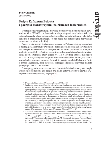 wiêta Eufrozyna Po³ocka i pocz¹tki monastycyzmu na ziemiach bia³oruskich Wed³ug zachowanej tradycji, pierwsze monastery na ziemi po³ockiej powsta³y w XI w. W 1000 r. w Izas³awiu mia³a przebywaæ ¿ona ksiêcia W³odzimierza Ragneda, córka ksiêcia po³ockiego Rogwo³oda, która przyjê³a luby zakonne z imieniem Anastazja. To ona mia³a byæ za³o¿ycielk¹ pierwszego monasteru na ziemi po³ockiej1. Rzeczywisty rozwój ¿ycia monastycznego na Po³occzynie zwi¹zany jest z postaci¹ w. Eufrozyny Po³ockiej, córki ksiêcia po³ockiego wiatos³awa Jerzego Wsies³awowicza2. Ksiê¿niczka w wieku dwunastu lat zdecydowa³a siê wst¹piæ do ¿eñskiego monasteru, gdzie prze³o¿on¹ by³a jej ciotka, ¿ona ksiêcia Romana, który zmar³ w 1116 r. (wed³ug innych informacji w 1113 r.). Daty te wyznaczaj¹ równie¿ czas narodzin w. Eufrozyny. Skoro wst¹pi³a do monasteru maj¹c lat dwanacie, to data narodzin Eufrozyny (imiê z chrztu: Eupraksja, imiê wieckie, ksi¹¿êce: Prakseda) przypada na lata pomiêdzy 1101 a 1104 rokiem3. Powstaje pytanie, czy rzeczywicie dwunastoletnia dziewczynka mog³a wst¹piæ do monasteru, czy mog³a byæ na to gotowa. Mo¿e to jedynie wymys³ (w szlachetnym celu) hagiografa? 1 2 3 Ó. Àðëî¢, Å¢ôðàñ³ííÿ Ïîëàöêàÿ, ̳íñê 1992, ñ. 20. Trudno do koñca okreliæ osobê ksiêcia Jerzego. Zachowane imiê Jerzy jest imieniem z chrztu. ¯ywot w. Eufrozyny nie okrela natomiast drugiego imienia ksiêcia, imienia dynastycznego, ksi¹¿êcego. Wymaga zatem dok³adniejszego ucilenia, który z synów Wsies³awa by³ wymienionym w ¿ywocie Jerzym, czy rzeczywicie mo¿na go uto¿samiaæ ze wiatos³awem. Jak wiadomo ksi¹¿ê Wsies³aw mia³ szeciu synów. Wzajemne relacje pomiêdzy nimi nie s¹ dostatecznie wyjanione. Je¿eli wierzyæ dawnej, maj¹cej odbicie w literaturze epoki, tradycji wymieniania imion ksi¹¿êcych zgodnie z ich hierarchicznoci¹, a tak¿e jeli zgodziæ siê, ¿e zawarte w ¿ywocie i okrelaj¹ce Jerzego wyra¿enie mienszyj oznacza ksiêcia m³odszego wiekiem, a nie, na przyk³ad, ni¿szego ze wzglêdu na swoj¹ pozycjê w hierarchii, wypada zgodziæ siê z ogólnie przyjêtymi s¹dami, i¿ ksi¹¿ê Jerzy to w rzeczy samej ksi¹¿ê wiatos³aw Wsies³awicz. À. À.Ìåëüíèêîâ, Ïðåïîäîáíàÿ Åâôðîñèíèÿ Ïîëîöêàÿ, Ìèíñê 1997, ñ. 17. Àïîâåñöü æûööÿ ³ ñìåðö³ ñâÿòîé ³ áëàæýííàé ³ íàéïàäîáíåéøàé Å¢ôðàñ³íí³, ³ãóìåíí³ ìàíàñòûðà Ñâÿòîãà Ñïàñà ³ Íàéñâÿöåéøàé ßãîíàé Ìàö³, øòî ¢ ãîðàäçå Ïîëàöêó, [ó:] Ñòàðàáåëàðóñêàÿ ë³òàðàòóðà XI-XVIII ñòñò. Õðýñòàìàòûÿ, ïàä ðýä. Ã. Òâàðàíîâ³÷, Áåëàñòîê 2004, ñ. 72; Ìàêàðèé, Èñòîðèÿ Ðóññêîé Öåðêâè, êí. 2, Ìîñêâà 1995, ñ. 315; Å. Å. Ãîëóáèíñêèé, Èñòîðèÿ Ðóññêîé Öåðêâè, ò. 2, Ìîñêâà 1997, ñ. 597; Ó. Àðëî¢, Òàÿìí³öû ïîëàöêàé ã³ñòîðû³, Ìåíñê 1994, ñ. 74. 5 artyku³y Piotr Chomik (Bia³ystok) ¯ywot w. Eufrozyny przekazuje nam informacjê, ¿e ju¿ w wieku dzieciêcym lubi³a ksi¹¿ki i naukê. Czy by³o to wówczas, w XII w. czym osobliwym? Nawet jeli przyjmiemy, ¿e w ksiêstwie po³ockim poziom nauki i kultury w XII w. by³ wysoki, to dostêp i znajomoæ nauki przez kobiety by³ czym rzeczywicie niezwyk³ym. Wykszta³cona, lepiej lub gorzej, m³oda kobieta (w zasadzie jeszcze dziecko), nawet pochodz¹ca z rodu ksi¹¿êcego, budzi³a zdumienie wród wspó³czesnych4. Nieprawdopodobne pocz¹tkowo stwierdzenie hagiografa o rozprzestrzeniaj¹cej siê s³awie ksiê¿niczki po³ockiej nabiera zatem innego wymiaru. Warto zauwa¿yæ, i¿ nie jest powiedziane, ¿e Eufrozyna po osi¹gniêciu siedmiu lat mieszka³a i by³a wychowywana na dworze ojca. Jednak z drugiej strony, je¿eli by³aby wychowywana w monasterze, hagiograf na pewno nie omieszka³by o tym wspomnieæ. Mo¿na jednak z du¿¹ doz¹ prawdopodobieñstwa przyj¹æ, ¿e nauczycielem m³odej ksiê¿niczki by³a osoba duchowna (mnich lub mniszka). Nauka musia³a polegaæ na czytaniu prawos³awnych ksi¹g liturgicznych, wybranych dzie³ Ojców Kocio³a i innych dostêpnych wówczas tekstów. To w³anie tego typu nauka musia³a sk³oniæ m³od¹ ksiê¿nê do wst¹pienia do monasteru i móg³ to byæ mimo m³odego wieku wybór w pe³ni wiadomy. O monasterze, w którym ihumeni¹ by³a ¿ona ksiêcia Romana Wsies³awicza, nie mamy ¿adnych wiadomoci. Jedyne o nim wzmianki pochodz¹ z ¿ywotu w. Eufrozyny. Na pewno nie chodzi tu o wymieniony ju¿ monaster w Izas³awiu, bowiem jego rzeczywiste istnienie nie jest udokumentowane. Mo¿liwe, i¿ pierwszym monasterem w. Eufrozyny by³ monaster niesamodzielny, funkcjonuj¹cy przy której z cerkwi parafialnych Po³ocka. Pierwszym monasterskim zajêciem m³odej mniszki, która zamieszka³a przy soborze w. Zofii w Po³ocku, by³o przepisywanie ksi¹g. By³ to w owych czasach olbrzymi trud, wymagaj¹cy wielkiej cierpliwoci, wyrabiaj¹cy charakter. Ksi¹¿ki przepisywano wówczas tak zwanym ustawem, du¿ymi, wypracowanymi literami, które dodatkowo zdobiono. Ponadto, aby powsta³a gotowa ksi¹¿ka, potrzebna by³a, oprócz pracy kopisty, praca z³otnika, miniaturzysty, introligatora czy specjalisty od przygotowania pergaminu. Wszyscy tego rodzaju rzemielnicy powinni byli znajdowaæ siê w Po³ocku lub w jego pobli¿u. Czy skryptorium przy cerkwi w. Zofii w Po³ocku istnia³o wczeniej, czy jego powstanie by³o zas³ug¹ Eufrozyny, tego nie wiadomo. Pewnym jest natomiast, i¿ to w³anie Eufrozynie zawdziêcza ono swój rozwój, bowiem z czasem ksi¹¿ki w nim powsta³e zaczêto sprzedawaæ lub przepisywaæ okrelone pozycje na zamówienie. Wed³ug znawcy ¿ywotu w. Eufrozyny Aleksego Mielnikowa, mog³a ona nie tylko przepisywaæ ju¿ istniej¹ce ksiêgi i kierowaæ prac¹ skry