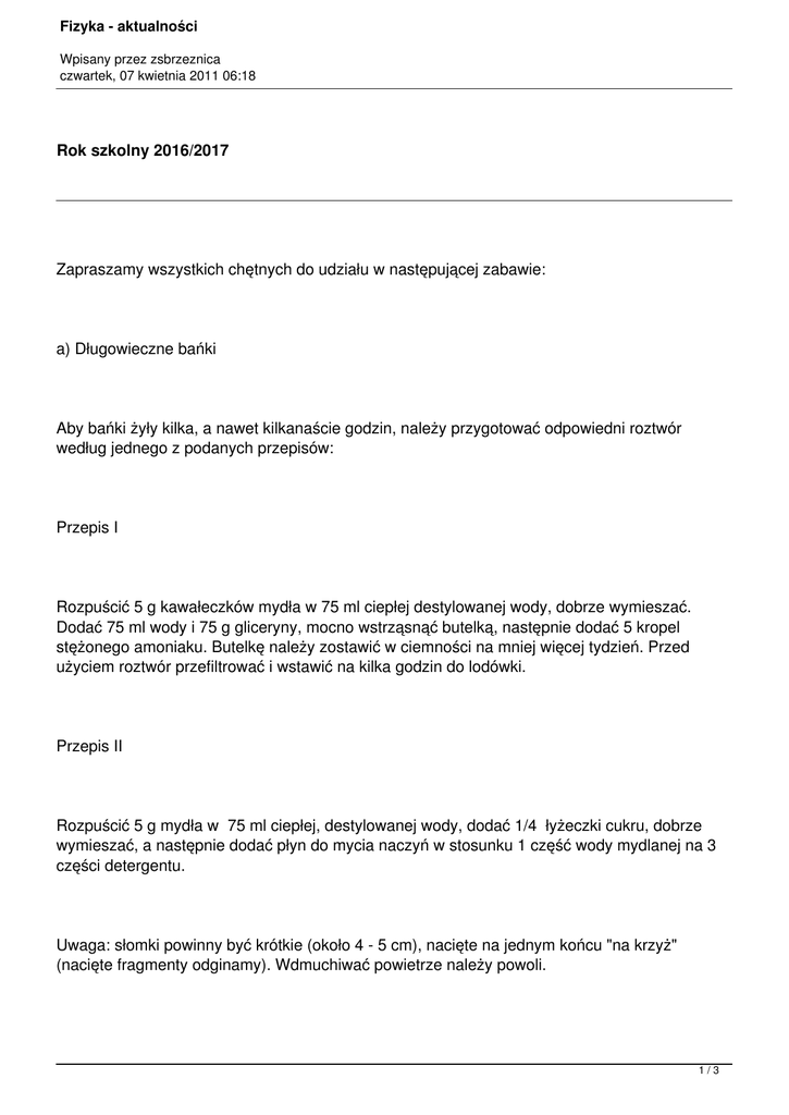 Fizyka - aktualności Wpisany przez zsbrzeznica czwartek, 07 kwietnia 2011 06:18 Rok szkolny 2016/2017 Zapraszamy wszystkich chętnych do udziału w następującej zabawie: a) Długowieczne bańki Aby bańki żyły kilka, a nawet kilkanaście godzin, należy przygotować odpowiedni roztwór według jednego z podanych przepisów: Przepis I Rozpuścić 5 g kawałeczków mydła w 75 ml ciepłej destylowanej wody, dobrze wymieszać. Dodać 75 ml wody i 75 g gliceryny, mocno wstrząsnąć butelką, następnie dodać 5 kropel stężonego amoniaku. Butelkę należy zostawić w ciemności na mniej więcej tydzień. Przed użyciem roztwór przefiltrować i wstawić na kilka godzin do lodówki. Przepis II Rozpuścić 5 g mydła w 75 ml ciepłej, destylowanej wody, dodać 1/4 łyżeczki cukru, dobrze wymieszać, a następnie dodać płyn do mycia naczyń w stosunku 1 część wody mydlanej na 3 części detergentu. Uwaga: słomki powinny być krótkie (około 4 - 5 cm), nacięte na jednym końcu "na krzyż" (nacięte fragmenty odginamy). Wdmuchiwać powietrze należy powoli. 1/3 Fizyka - aktualności Wpisany przez zsbrzeznica czwartek, 07 kwietnia 2011 06:18 Przygotowane roztwory przyniesiemy do szkoły. Zorganizujemy konkurs na najdłużej lecącą, największą oraz najbardziej kolorową bańkę mydlaną. Problemy do rozwiązania: Dlaczego powstają bańki mydlane? Od czego zależy wielkość bańki? Od czego zależy trwałość bańki? Dlaczego bańki mają różne kolory ? najczęściej wszystkie kolory tęczy? Jaki kształt mają bańki i dlaczego właśnie taki? b) Hodujemy kryształy Przepis I Do przezroczystej szklanki napełnionej wodą do 1/3 wysokości wsypujemy trzy łyżeczki soli kuchennej i mieszamy. Roztwór zostawiamy na około 12 godzin do wyklarowania, po czym ostrożnie przelewamy do czystej szklanki, aby nie poruszyć osadu. Szklankę przykrywamy talerzykiem, żeby ochronić przed kurzem. Przez lupę oglądamy pojawiające się kryształy. Biały szron na brzegu naczynia oznacza, że parowanie rozpuszczalnika jest za szybkie, co powoduje, 2/3 Fizyka - aktualności Wpisany przez zsbrzeznica czwartek, 07 kwietnia 2011 06:18 że równocześnie narasta wiele małych, znajdujących się blisko kryształów. Aby otrzymać duży kryształ, wyjmujemy pincetą jeden z małych kryształków i zawieszamy go na nitce, a następnie umieszczamy w słoiku z roztworem nasyconym soli przygotowanym jak wyżej. Jeżeli nie uda się zawiązać nitki, kryształ możemy przykleić do niej klejem do ceramiki. Zamiast pokrywki możemy użyć ołówka, do którego w połowie przywiązujemy wolny koniec nitki; ołówek kładziemy następnie na słoiku. Przepis II Zdobyte w poprzednim doświadczeniu umiejętności wykorzystamy do zrobienia kryształowej choinki i czarodziejskiego ogrodu. Przygotujmy roztwór: 90 ml (6 łyżek) wody, 90 ml (6 łyżek) roztworu wodnego modrej farbki do prania bielizny, 15 ml (łyżka stołowa) amoniaku i 100 g soli kuchennej. Składniki mieszamy i zostawiamy na noc. Z grubej bibuły wycinamy dwie figury o kształcie choinki, nacinamy je i wciskamy jedna w drugą, na krzyż. Na końcu "gałązek" umieszczamy po kropli różnych barwików spożywczych. Choinkę stawiamy "pniem" na talerzu, np. z folii aluminiowej, po czym dodajemy jedną lub dwie łyżeczki roztworu i zostawiamy na kilka godzin. Aby otrzymać kryształowy ogród, bierzemy kawałek węgla drzewnego, zwilżamy kilkoma kroplami barwnika spożywczego, umieszczamy na talerzu z folii aluminiowej i nalewamy roztworu. Po mniej więcej dwóch godzinach pojawią się kolorowe kryształy. Otrzymane kryształy ocenimy, a najlepszą hodowlę nagrodzimy. raszamy wszystki 3/3