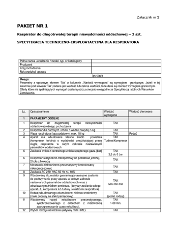 Załącznik nr 2 PAKIET NR 1 Respirator do długotrwałej terapii niewydolności oddechowej – 2 szt. SPECYFIKACJA TECHNICZNO-EKSPLOATACYJNA DLA RESPIRATORA Pełna nazwa urządzenia / model, typ, nr katalogowy Producent Kraj pochodzenia Rok produkcji aparatu (podać) Uwaga: Parametry z wpisanym słowem ‘Tak’ w kolumnie „Wartość wymagana” są wymogiem granicznym. Jeżeli w tej kolumnie pod słowem ‘Tak’ podana jest wartość lub zakres wartości, to te dane są również wymogiem granicznym. Oferty które nie spełniają tych wymagań zostaną odrzucone jako niezgodne ze Specyfikacją Istotnych Warunków Zamówienia. Lp. Opis parametru Wartość wymagana Wartość oferowana 1 PARAMETRY OGÓLNE 1 Respirator do długotrwałej terapii niewydolności TAK oddechowej różnego pochodzenia Respirator dla dorosłych i dzieci o wadze powyżej 5 kg TAK Waga respiratora (bez podstawy), max. 18 kg TAK Podać Aparat ma wbudowane własne źródło powietrza TAK (kompresor, turbina) o wydajności umożliwiającej pracę Turbina/Kompresor ciągłą respiratora w całym zakresie nastawianych parametrów oddechowych Zasilanie w tlen z centralnego źródła sprężonego gazu. [bar] TAK 2,8 do 6 bar Respirator stacjonarno-transportowy na podstawie jezdnej, TAK 2 koła z blokadą Mieszalnik elektroniczno-pneumatyczny kontrolowany TAK mikroprocesorowo Zasilanie AC 230 VAC 50 Hz +/- 10% TAK Wbudowany akumulator gwarantujący awaryjne zasilanie do podtrzymania pracy aparatu w pełnym zakresie TAK nastawianych parametrów oddechowych wraz z Min 360 min wbudowanym źródłem powietrza. (dotyczy zasilania całego aparatu tj. kompresora lub turbiny i elektroniki respiratora). Rodzaj wbudowanego akumulatora: niklowo-wodorkowy TAK (mało podatny na efekt pamięciowy) (podać rodzaj) Wbudowany napęd nebulizatora pneumatycznego, TAK synchronizowanego z oddechem z możliwością 1-60 min. zaprogramowania czasu nebulizacji. Wybór rodzaju nawilżania (aktywny / filtr HME) TAK 2 3 4 5 6 7 8 9 10 11 12 Załącznik nr 2 2 1 2 3 3 1 TRYBY WENTYLACJI Wentylacja objętościowo-kontrolowana Wentylacja ciśnieniowo-kontrolowana Wentylacja ciśnieniowo-kontrolowana z docelową objętością typu PRVC, AutoFlow, APV, VC+ Wentylacja dwupoziomowa typu BiPAP, Bi-Level, DuoPAP, APRV CMV / Assist – IPPV SIMV w opcji PCV,VCV Wentylacja wspomagania oddechu spontanicznego ciśnieniem PSV / ASB Możliwość ustawienia PEEP / CPAP Wdech manualny o programowanych parametrach, wyzwalany osobnym i tylko do tego przeznaczonym przyciskiem na respiratorze - ze względów bezpieczeństwa nie dopuszcza się przycisku mającego dodatkowe „podwójne” działanie (np. „wstrzymanie oddechu”) Wentylacja bezdechu z możliwością ustawienia parametrów (tryb i nastawy) Możliwość wentylacji pacjentów z nieuszczelnionymi rurkami tracheostomijnymi, intubacyjnymi lub przez maskę Westchnienia automatyczne Oddech 100% 02 z automatycznym wyłączeniem po kilku minutach PARAMETRY NASTAWIALNE Częstość oddechów [oddechów/min] 2 Objętość pojedynczego oddechu VCV [ml] 3 Przepływ wdechowy regulowany dla oddechów obowiązkowych objętościowo-kontrolowanych [l/min] Możliwość wyboru kształtu przepływu dla oddechów obowiązkowych objętościowo-kontrolowanych (VCV) 4 6 7 8 9 10 11 12 13 14 4 5 Czas wdechu [s] 6 7 Czas Plateau. Respirator musi posiadać możliwość ustawienia pauzy wdechowej w wentylacji objętościowo kontrolowanej. [s] Manualne przedłużenie fazy wdechowej. [s] 8 Manualne przedłużenie fazy wydechowej. [s] 9 Przepływ bazowy nastawiany ręcznie [l/min] 10 11 Stężenie tlenu w mieszaninie oddechowej regulowane płynnie [%] Ciśnienie wdechowe PCV [cmH2O] 12 Ciśnienie wspomagania PSV/ASB [cmH2O] 13 PEEP / CPAP [cmH2O] TAK TAK TAK TAK TAK TAK TAK TAK TAK TAK TAK TAK TAK TAK 2-80 oddechów/min TAK 50 – 2000 ml TAK 10 – 140 l/min TAK Min kwadratowa i opadająca TAK 0,3-10,0 TAK 0,1 - 2 TAK 0-6 TAK 0-6 TAK 10-20 TAK 21-100% TAK 1-100 cmH2O TAK 0-60 cmH2O TAK 0-35 cmH2O Załącznik nr 2 14 15 16 17 18 19 20 21 4 1 2 3 4 5 6 7 8 9 10 11 12 13 14 15 16 17 18 19 20 21 22 5 1 Wysoki poziom ciśnienia przy BiPAP, Bi-Level, APRV [cmH2O] Niski poziom ciśnienia przy BiPAP, BiLevel, APRV [cmH2O] TAK 0-60 cmH2O TAK 0-45 cmH2O TAK 0,3-30 s TAK 0,3-30 s Czas wysokiego poziomu ciśnienia przy BiPAP, BiLevel, APRV [s] Czas niskiego poziomu ciśnienia przy BiPAP, BiLevel, APRV [s] Możliwość regulacji wspomagania oddechu spontanicznego ciśnienia na obu poziomach ciśnienia przy BiPAP, BiLevel, TAK APRV Regulowane procentowe kryterium zakończenia fazy TAK wdechowej w trybie PSV/ASB [%] min zakres 5-70% Przepływowy tryb rozpoznawania oddechu własnego TAK pacjenta [l/min] 1-20 l/min Regulowany niezależnie od nastaw respiratora TAK mechaniczny zawór bezpieczeństwa 20 – 130 cm H2O POMIARY PARAMETRÓW WENTYLACJI Pomiar parametrów za pomocą czujników zewnętrznych lub wbudowanych w aparat łatwo dostępnych dla użytkownika TAK w celu sterylizacji lub wymiany. Przetwornik przepływu wielokrotnego użytku przystosowany TAK do sterylizacji w autoklawie. Kolorowy monitor, LCD aktywna matryca TFT, wbudowany TAK (zintegrowany) łącznie z respiratorem w jednej obudowie min 10” (na płycie czołowej), do obrazowania wentylacji oraz wyboru (opisać) i nastawiania parametrów wentylacji Graficzna, jednoczesna prezentacja ciśnienia, przepływu, TAK objętości w funkcji czasu Graficzna prezentacja pętli ciśnienie-objętość i objętośćTAK przepływ. Integralny pomiar stężenia tlenu. TAK Całkowita częstość oddychania TAK Częstość oddechów spontanicznych TAK Objętość pojedynczego oddechu TAK Objętość pojedynczego oddechu spontanicznego TAK Całkowita objętość wentylacji minutowej TAK Objętość spontanicznej wentylacji minutowej. TAK Ciśnienie szczytowe (PIP) TAK Średnie ciśnienie w układzie oddechowym (MAP) TAK Stosunek wdech/wydech I:E TAK Ciśnienie PEEP/CPAP TAK Podatność statyczna płu