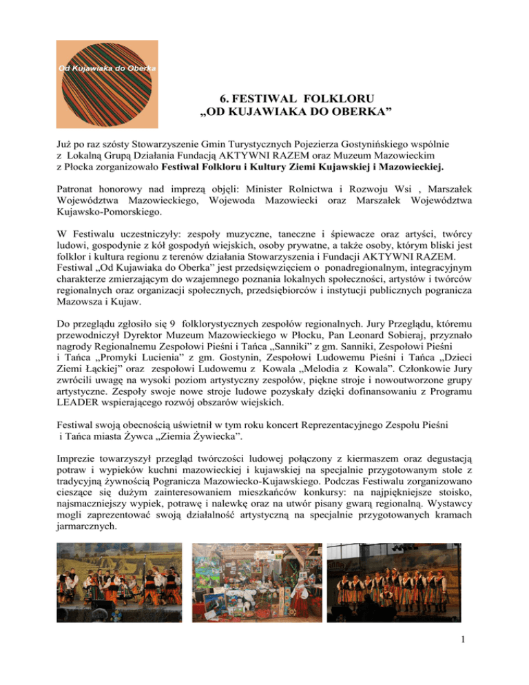 6. FESTIWAL FOLKLORU „OD KUJAWIAKA DO OBERKA” Już po raz szósty Stowarzyszenie Gmin Turystycznych Pojezierza Gostynińskiego wspólnie z Lokalną Grupą Działania Fundacją AKTYWNI RAZEM oraz Muzeum Mazowieckim z Płocka zorganizowało Festiwal Folkloru i Kultury Ziemi Kujawskiej i Mazowieckiej. Patronat honorowy nad imprezą objęli: Minister Rolnictwa i Rozwoju Wsi , Marszałek Województwa Mazowieckiego, Wojewoda Mazowiecki oraz Marszałek Województwa Kujawsko-Pomorskiego. W Festiwalu uczestniczyły: zespoły muzyczne, taneczne i śpiewacze oraz artyści, twórcy ludowi, gospodynie z kół gospodyń wiejskich, osoby prywatne, a także osoby, którym bliski jest folklor i kultura regionu z terenów działania Stowarzyszenia i Fundacji AKTYWNI RAZEM. Festiwal „Od Kujawiaka do Oberka” jest przedsięwzięciem o ponadregionalnym, integracyjnym charakterze zmierzającym do wzajemnego poznania lokalnych społeczności, artystów i twórców regionalnych oraz organizacji społecznych, przedsiębiorców i instytucji publicznych pogranicza Mazowsza i Kujaw. Do przeglądu zgłosiło się 9 folklorystycznych zespołów regionalnych. Jury Przeglądu, któremu przewodniczył Dyrektor Muzeum Mazowieckiego w Płocku, Pan Leonard Sobieraj, przyznało nagrody Regionalnemu Zespołowi Pieśni i Tańca „Sanniki” z gm. Sanniki, Zespołowi Pieśni i Tańca „Promyki Lucienia” z gm. Gostynin, Zespołowi Ludowemu Pieśni i Tańca „Dzieci Ziemi Łąckiej” oraz zespołowi Ludowemu z Kowala „Melodia z Kowala”. Członkowie Jury zwrócili uwagę na wysoki poziom artystyczny zespołów, piękne stroje i nowoutworzone grupy artystyczne. Zespoły swoje nowe stroje ludowe pozyskały dzięki dofinansowaniu z Programu LEADER wspierającego rozwój obszarów wiejskich. Festiwal swoją obecnością uświetnił w tym roku koncert Reprezentacyjnego Zespołu Pieśni i Tańca miasta Żywca „Ziemia Żywiecka”. Imprezie towarzyszył przegląd twórczości ludowej połączony z kiermaszem oraz degustacją potraw i wypieków kuchni mazowieckiej i kujawskiej na specjalnie przygotowanym stole z tradycyjną żywnością Pogranicza Mazowiecko-Kujawskiego. Podczas Festiwalu zorganizowano cieszące się dużym zainteresowaniem mieszkańców konkursy: na najpiękniejsze stoisko, najsmaczniejszy wypiek, potrawę i nalewkę oraz na utwór pisany gwarą regionalną. Wystawcy mogli zaprezentować swoją działalność artystyczną na specjalnie przygotowanych kramach jarmarcznych. 1 Jury za najpiękniejsze stoisko uznało ekspozycję Szkoły Podstawowej im. F. Chopina razem z Publicznym Gimnazjum w Sannikach, gm. Sanniki , drugie miejsce zajęła Pani Zofia Czubak za łowickie hafty, stroje ludowe, trzecią nagrodę otrzymali Państwo Aleksandra i Krzysztof Zawaccy. Wyróżnienie przyznano Pani Ewie Polańskiej. Do konkursu zgłosiło się 41 wystawców. Za najlepszy wypiek regionalny uznane zostały „Rogaliki Babci Weroniki” Renaty Lisowskiej. Druga nagroda trafiła do Lucyny Krych za „Ciasto drożdżowe z owocami”, a trzecia do Teresy Zaborowskiej za „Pączki”. Wyróżnienie otrzymała Elżbieta Kujawska za „Jabłecznik z kratką”. W kategorii Potrawa regionalna laureatką została Joanna Leonarcik, która przygotowała „Chleb wieloziarnisty na zalewie, ogórki kwaszone i smalec chłopski”. Druga nagroda przypadła Agnieszce Tomczak za „Żeberka w miodzie”. Również „Nadzionko”, zostało docenione przez Jury. Jego autorka, Krystyna Olobry zajęła trzecie miejsce. Wyróżnienie przyznano Marioli Dobaczewskiej, która przygotowała „Kluski kartoflane”. W konkursie na najlepszą nalewkę, jury najwyżej oceniło nalewkę „Sosnową” przygotowaną przez Irenę Muszyńską. Drugą nagrodę otrzymała Teresa Murawska za „Nalewkę z Pigwy”. Trzecia nagroda trafiła w ręce Krystyny Olobry, która przygotowała „Pigwówkę”. Wyróżnienia otrzymała Wanda Augustyniak za nalewkę o nazwie „Ogierówka”. W konkursie wzięło udział 58 wypieków, 22 potrawy i 31 nalewek regionalnych. Publiczność uznała, że najbardziej godne uwagi było stoisko Stowarzyszenia Aktywnych Kobiet, które przygotowało m. in. wytwarzane w swoim regionie pierogi, ciasta i nalewki. Wśród zespołów największe uznanie publiczności zdobyły Promyki Lucienia z gm. Gostynin, a najlepszym (według oceny publiczności) produktem żywnościowym było „Ciasto z Jabłkami” przygotowane przez Panią Zofię Zawadzką. 2