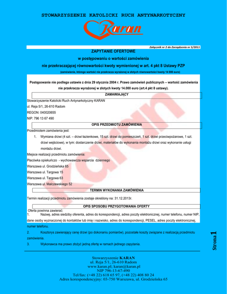 STOWARZYSZENIE KATOLICKI RUCH ANTYNARKOTYCZNY ZAPYTANIE OFERTOWE Załącznik nr 2 do Zarządzenia nr 5/2011 w postępowaniu o wartości zamówienia nie przekraczającej równowartości kwoty wymienionej w art. 4 pkt 8 Ustawy PZP (zamówienie, którego wartość nie przekracza wyrażonej w złotych równowartości kwoty 14 000 euro) Postępowanie nie podlega ustawie z dnia 29 stycznia 2004 r. Prawo zamówień publicznych – wartość zamówienia nie przekracza wyrażonej w złotych kwoty 14.000 euro (art.4 pkt 8 ustawy). ZAMAWIAJĄCY Stowarzyszenie Katolicki Ruch Antynarkotyczny KARAN ul. Reja 5/1, 26-610 Radom REGON: 040020655 NIP: 796 13 67 490 OPIS PRZEDMIOTU ZAMÓWIENIA Przedmiotem zamówienia jest: 1. Wymiana drzwi (4 szt. – drzwi łazienkowe, 15 szt. drzwi do pomieszczeń, 1 szt. drzwi przeciwpożarowe, 1 szt. drzwi wejściowe), w tym: dostarczenie drzwi, materiałów do wykonania montażu drzwi oraz wykonanie usługi montażu drzwi. Miejsce realizacji przedmiotu zamówienia: Placówka opiekuńczo - wychowawcza wsparcia dziennego Warszawa ul. Grodzieńska 65 Warszawa ul. Targowa 15 Warszawa ul. Targowa 63 Warszawa ul. Malczewskiego 52 TERMIN WYKONANIA ZAMÓWIENIA Termin realizacji przedmiotu zamówienia zostaje określony na: 31.12.2013r. OPIS SPOSOBU PRZYGOTOWANIA OFERTY Oferta powinna zawierać: 1. Nazwę, adres siedziby oferenta, adres do korespondencji, adres poczty elektronicznej, numer telefonu, numer NIP, dane osoby wyznaczonej do kontaktów lub imię i nazwisko, adres do korespondencji, PESEL, adres poczty elektronicznej, 2. Kosztorys zawierający cenę drzwi (po dokonaniu pomiarów), pozostałe koszty związane z realizacją przedmiotu zamówienia. 3. Wykonawca ma prawo złożyć jedną ofertę w ramach jednego zapytania. Stowarzyszenie KARAN ul. Reja 5/1, 26-610 Radom www.karan.pl; [email protected] NIP 796-13-67-490 Tel/fax: (+48 22) 618 65 97, (+48 22) 408 80 24 Adres korespondencyjny: 03-750 Warszawa, ul. Grodzieńska 65 Strona1 numer telefonu. STOWARZYSZENIE KATOLICKI RUCH ANTYNARKOTYCZNY 4. Cenę oferty należy podać w PLN. 5. Oferta powinna być napisana w języku polskim, czytelnie. MIEJSCE ORAZ TERMIN SKŁADANIA OFERT 1. Oferta powinna być przesłana za pośrednictwem poczty elektronicznej na adres [email protected] lub dostarczona osobiście na adres Stowarzyszenie Katolicki Ruch Antynarkotyczny KARAN Warszawa ul. Targowa 15 lok. 2/3 do dnia 30 listopada do godziny 12.00. 2. W trakcie badania i oceny ofert Zamawiający zastrzega sobie prawo wymagania od oferentów wyjaśnień dotyczących treści złożonych ofert. OCENA OFERT Zamawiający dokona oceny ważnych ofert na podstawie następujących kryteriów: Cena za poszczególne pozycje zamówienia. Zamawiający dokona wyboru najkorzystniejszej oferty spośród złożonych, oferujących wykonanie przedmiotu zamówienia, przyjmując najkorzystniejszą ofertę z najniższą ceną. Ceny podane w ofercie są cenami ostatecznymi obejmującymi wszystkie koszty i składniki związane z realizacją zamówienia. Zamawiający ma prawo wybrać do realizacji tylko część zamówienia. INFORMACJE DOTYCZĄCE WYBORU NAJKORZYSTNIEJSZEJ OFERTY W toku badania i oceny ofert Zamawiający może żądać od Wykonawców uzupełnień i wyjaśnień dotyczących treści złożonych ofert. Może również zwracać się z prośbami o poprawienie oczywistych omyłek i błędów rachunkowych. O wyborze najkorzystniejszej oferty Zamawiający zawiadomi oferenta za pośrednictwem poczty elektronicznej lub osobiście. DODATKOWE INFORMACJE Dodatkowych informacji w zakresie złożonego zamówienia udziela Pani/Pan Joanna Woźnicka-Wąsek pod numerem telefonu 22 408 80 24 oraz adresem email [email protected] FINANSOWANIE 1. Zamówienie jest finansowane ze środków Miasta Stołecznego Warszawy. 2. Wyłoniony Wykonawca/Oferent zostanie rozliczony na podstawie rachunku po zrealizowanym przedmiocie zamówienia. Zapłata nastąpi w terminie 14 dni od daty otrzymania rachunku przez Zamawiającego. W IMIENIU ZAMAWIAJĄCEGO DATA DOKONANIA ZATWIERDZENIA ZATWIERDZAM DO PRZEPROWADZENIA 22 listopada 2013r. Bożena Bereda PODPIS OSOBY ZATWIERDZAJĄCEJ Wiceprzewodnicząca ZG Bożena Bereda Strona2 Wiceprzewodnicząca ZG Stowarzyszenie KARAN ul. Reja 5/1, 26-610 Radom www.karan.pl; [email protected] NIP 796-13-67-490 Tel/fax: (+48 22) 618 65 97, (+48 22) 408 80 24 Adres korespondencyjny: 03-750 Warszawa, ul. Grodzieńska 65