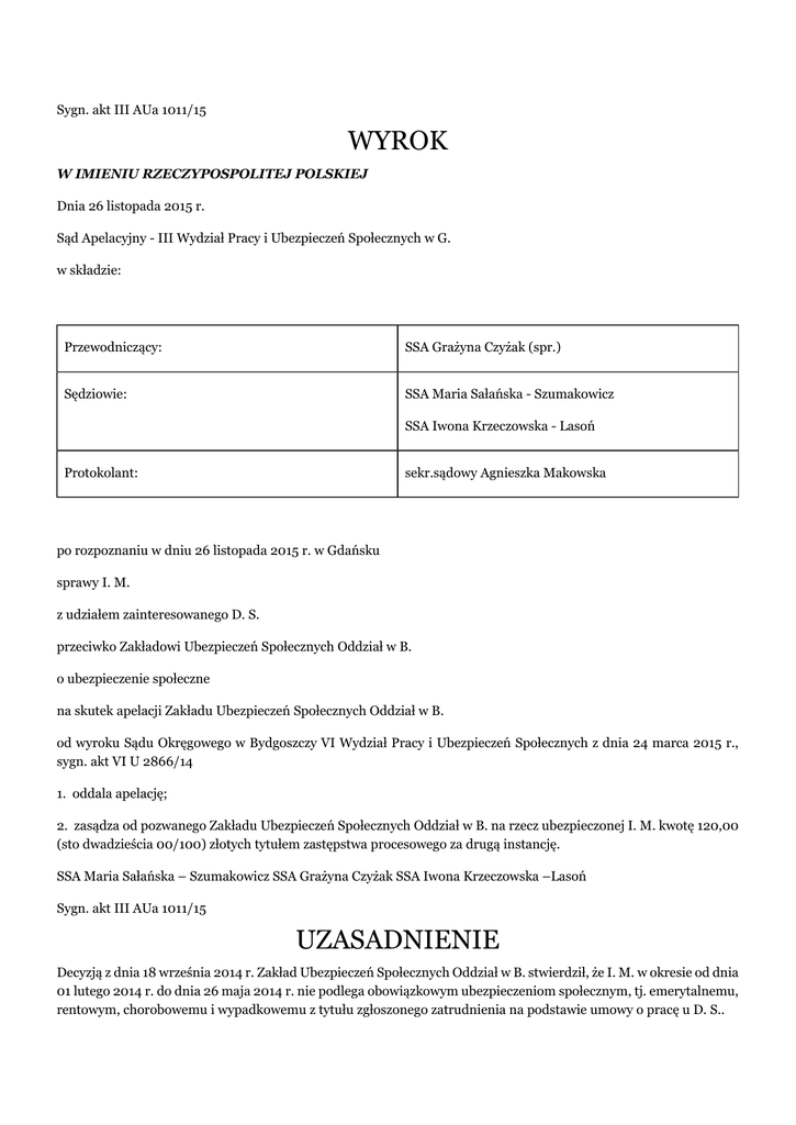 Sygn. akt III AUa 1011/15 WYROK W IMIENIU RZECZYPOSPOLITEJ POLSKIEJ Dnia 26 listopada 2015 r. Sąd Apelacyjny - III Wydział Pracy i Ubezpieczeń Społecznych w G. w składzie: Przewodniczący: SSA Grażyna Czyżak (spr.) Sędziowie: SSA Maria Sałańska - Szumakowicz SSA Iwona Krzeczowska - Lasoń Protokolant: sekr.sądowy Agnieszka Makowska po rozpoznaniu w dniu 26 listopada 2015 r. w Gdańsku sprawy I. M. z udziałem zainteresowanego D. S. przeciwko Zakładowi Ubezpieczeń Społecznych Oddział w B. o ubezpieczenie społeczne na skutek apelacji Zakładu Ubezpieczeń Społecznych Oddział w B. od wyroku Sądu Okręgowego w Bydgoszczy VI Wydział Pracy i Ubezpieczeń Społecznych z dnia 24 marca 2015 r., sygn. akt VI U 2866/14 1. oddala apelację; 2. zasądza od pozwanego Zakładu Ubezpieczeń Społecznych Oddział w B. na rzecz ubezpieczonej I. M. kwotę 120,00 (sto dwadzieścia 00/100) złotych tytułem zastępstwa procesowego za drugą instancję. SSA Maria Sałańska – Szumakowicz SSA Grażyna Czyżak SSA Iwona Krzeczowska –Lasoń Sygn. akt III AUa 1011/15 UZASADNIENIE Decyzją z dnia 18 września 2014 r. Zakład Ubezpieczeń Społecznych Oddział w B. stwierdził, że I. M. w okresie od dnia 01 lutego 2014 r. do dnia 26 maja 2014 r. nie podlega obowiązkowym ubezpieczeniom społecznym, tj. emerytalnemu, rentowym, chorobowemu i wypadkowemu z tytułu zgłoszonego zatrudnienia na podstawie umowy o pracę u D. S.. W uzasadnieniu tej decyzji organ rentowy wskazał, że brak było racjonalnych przesłanek do zatrudnienia córki przez płatnika składek w okresie od dnia 01 lutego 2014 r. do dnia 26 maja 2014 r., jeżeli D. S. zlikwidował swoją działalność gospodarczą. Ponadto odwołująca od wielu lat pomagała ojcu natomiast została zgłoszona do ubezpieczeń społecznych jako pracownik będąc w zaawansowanej ciąży. Zdaniem tego organu kwestionowaną umowę zawarto dla pozoru (art. 83 k.c.). Odwołanie od powyższej decyzji wniosła I. M. domagając się m.in.: zmiany tej decyzji przez ustalenie, że podlegała w spornym okresie pracowniczym ubezpieczeniom społecznym z uwzględnieniem podstawy wymiaru składek wynikającego ze spornej umowy o pracę, zwrotu kosztów procesu według norm przepisanych i dopuszczenie dowodu z zeznań wskazanych w tym odwołaniu świadków. W uzasadnieniu odwołania ubezpieczona obszernie wywodziła, że zawarcie umowy o pracę z dnia 01 lutego 2014 r. nie zmierzało do obejścia prawa (art. 58 § 1 k.c. w zw. z art. 300 k.p.). W odpowiedzi na odwołanie organ rentowy wniósł o jego oddalenie, podtrzymując swoje dotychczasowe stanowisko wyrażone w uzasadnieniu zaskarżonej decyzji. Wyrokiem z dnia 24 marca 2015 r. w sprawie VI U 2866/14 Sąd Okręgowy w Bydgoszczy VI Wydział Pracy i Ubezpieczeń Społecznych: 1. zmienił zaskarżoną decyzję Zakładu Ubezpieczeń Społecznych Oddziału w B. z dnia 18 września 2014 r. w ten sposób, że ustalił, iż I. M. podlega obowiązkowym ubezpieczeniom społecznym na podstawie umowy o pracę zawartej z D. S., 2. zasądził od organu rentowego na rzecz odwołującej kwotę 180 zł tytułem kosztów zastępstwa prawnego. Podstawę tego rozstrzygnięcia stanowiły następujące ustalenia i rozważania Sądu I instancji: Płatnik składek D. S. od 8 lat prowadził działalność gospodarczą dotyczącą sprzedaży odzieży przy ul. (...). Przed zatrudnieniem córki I. M. w prowadzeniu działalności pomagała mu żona M. S., która była zatrudniona jako osoba współpracująca przy prowadzeniu działalności gospodarczej. Żona miała jednak kłopoty z kręgosłupem, zaczęła chorować, wówczas pan D. S. zdecydował się zawrzeć umowę o pracę z córką I. M.. Odwołująca zanim podjęła pracę u ojca sprzedawała na targowisku mieszczącym się w B. na B. prowadząc tam swoją działalność gospodarczą. Działalność tą prowadziła do dnia 30 listopada 2013 r., a od dnia 01 grudnia 2013 r. zgłosiła zawieszenie prowadzenia działalności z uwagi na okoliczność, iż była już wówczas w ciąży, a stanowisko pracy mieściło się na wolnym powietrzu. Odwołująca zawarła z płatnikiem składek umowę o pracę w charakterze sprzedawcy. Miejscem wykonywania pracy był sklep przy ul. (...), wynagrodzenie wynosiło 3.000 zł brutto miesięcznie. Odwołująca sprzedawała odzież, układała na półkach. Odwołująca wykonywała swoją pracę w pełnym wymiarze czasu pracy aż do dnia porodu, tj. do dnia 01 kwietnia 2014 r. Odwołująca miała wystawione zaświadczenie lekarskie o zdolności do pracy. W dniu 04 lutego 2014 r. wypłacono jej wynagrodzenie zgodnie z umową. W okresie wcześniejszym przed zawarciem umowy o pracę ubezpieczona pomagała ojcu w prowadzeniu sklepu jednak pomoc tą świadczyła doraźnie i tylko w razie konieczności. W trakcie trwania stosunku pracy odwołująca obsługiwała takie klientki jak: M. T., K. T., A. S. (1), A. J., A. S. (2) oraz klienta J. W.. Pomiędzy 11, a 12 marca 2014 r. inspektor A. G. przeprowadził kontrolę z ramienia Inspekcji Handlowej i we wszystkich kwestiach prowadził rozmowy wyłącznie z ubezpieczoną, zauważył też, że obsługuje klientki w sklepie. Odwołująca w okresie objętym decyzją regulowała także czynsz z tytułu umowy dzierżawy do rąk najemcy P. K. (1), o czym świadczą jej podpisy na dowodach Kp. Płatnik składek D. S. osiągał przychód ze sprzedaży w ramach prowadzonej działalności gospodarczej w kwocie 143.654 zł. W momencie urodzenia dziecka przez odwołującą jej matka M. S. poczuła się lepiej i przejęła obowiązki odwołującej razem z drugą córką S. S., która pomagała matce po zajęciach szkolnych. Sąd Okręgowy uznał zeznania wszystkich świadków za wiarygodne, przy tym zauważył, że organ rentowy ich nie kwestionował. Świadkowie nie mieli żadnego interesu by zeznawać nieprawdę, byli osobami obcymi dla ubezpieczonej. Sąd ten wskazał, że zeznania ich znalazły potwierdzenie nie