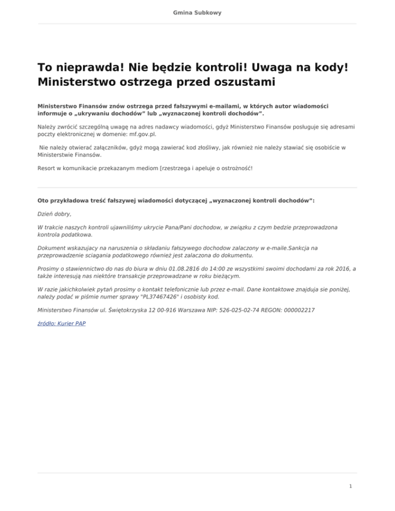 Gmina Subkowy To nieprawda! Nie będzie kontroli! Uwaga na kody! Ministerstwo ostrzega przed oszustami Ministerstwo Finansów znów ostrzega przed fałszywymi e-mailami, w których autor wiadomości informuje o „ukrywaniu dochodów” lub „wyznaczonej kontroli dochodów”. Należy zwrócić szczególną uwagę na adres nadawcy wiadomości, gdyż Ministerstwo Finansów posługuje się adresami poczty elektronicznej w domenie: mf.gov.pl. Nie należy otwierać załączników, gdyż mogą zawierać kod złośliwy, jak również nie należy stawiać się osobiście w Ministerstwie Finansów. Resort w komunikacie przekazanym mediom [rzestrzega i apeluje o ostrożność! Oto przykładowa treść fałszywej wiadomości dotyczącej „wyznaczonej kontroli dochodów”: Dzień dobry, W trakcie naszych kontroli ujawniliśmy ukrycie Pana/Pani dochodow, w związku z czym bedzie przeprowadzona kontrola podatkowa. Dokument wskazujacy na naruszenia o składaniu fałszywego dochodow zalaczony w e-maile.Sankcja na przeprowadzenie sciagania podatkowego również jest zalaczona do dokumentu. Prosimy o stawiennictwo do nas do biura w dniu 01.08.2816 do 14:00 ze wszystkimi swoimi dochodami za rok 2016, a także interesują nas niektóre transakcje przeprowadzane w roku bieżącym. W razie jakichkolwiek pytań prosimy o kontakt telefonicznie lub przez e-mail. Dane kontaktowe znajduja sie poniżej, należy podać w piśmie numer sprawy "PL37467426" i osobisty kod. Ministerstwo Finansów ul. Świętokrzyska 12 00-916 Warszawa NIP: 526-025-02-74 REGON: 000002217 źródło: Kurier PAP 1