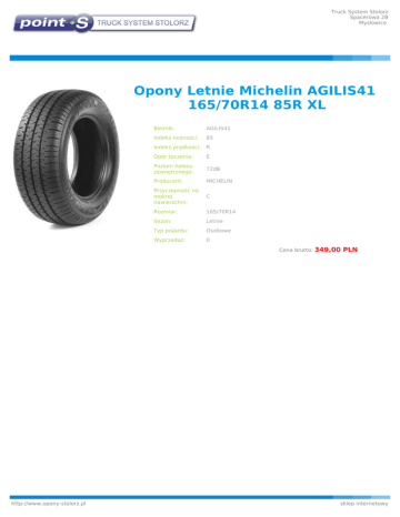 Truck System Stolorz Spacerowa 2B Mysłowice Opony Letnie Michelin AGILIS41 165/70R14 85R XL Bieżnik: AGILIS41 Indeks nośności: 85 Indeks prędkości: R Opór toczenia: E Poziom hałasu zewnętrznego: 72dB Producent: MICHELIN Przyczepność na mokrej nawierzchni: C Rozmiar: 165/70R14 Sezon: Letnie Typ pojazdu: Osobowe Wyprzedaż: 0 Cena brutto: http://www.opony-stolorz.pl 349,00 PLN sklep internetowy