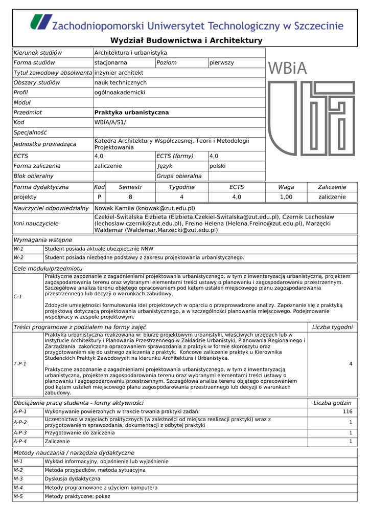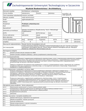 [ logo uczelni ] Wydział Budownictwa i Architektury Kierunek studiów Architektura i urbanistyka Forma studiów stacjonarna Poziom pierwszy Tytuł zawodowy absolwenta inżynier architekt Obszary studiów nauk technicznych Profil ogólnoakademicki Moduł Przedmiot Praktyka urbanistyczna Kod WBIA/A/S1/ Specjalność Jednostka prowadząca Katedra Architektury Współczesnej, Teorii i Metodologii Projektowania ECTS 4,0 ECTS (formy) 4,0 Forma zaliczenia zaliczenie Język polski Blok obieralny Forma dydaktyczna projekty Grupa obieralna Kod Semestr Tygodnie ECTS Waga Zaliczenie P 8 4 4,0 1,00 zaliczenie Nauczyciel odpowiedzialny Nowak Kamila ([email protected]) Inni nauczyciele Czekiel-Świtalska Elżbieta ([email protected]), Czernik Lechosław ([email protected]), Freino Helena ([email protected]), Marzęcki Waldemar ([email protected]) Wymagania wstępne W-1 Student posiada aktuale ubezpiecznie NNW W-2 Student posiada niezbędne podstawy z zakresu projektowania urbanistycznego. Cele modułu/przedmiotu C-1 Praktyczne zapoznanie z zagadnieniami projektowania urbanistycznego, w tym z inwentaryzacją urbanistyczną, projektem zagospodarowania terenu oraz wybranymi elementami treści ustawy o planowaniu i zagospodarowaniu przestrzennym. Szczegółowa analiza terenu objętego opracowaniem pod kątem ustaleń miejscowego planu zagospodarowania przestrzennego lub decyzji o warunkach zabudowy. Zdobycie umiejętności formułowania idei projektowych w oparciu o przeprowadzone analizy. Zapoznanie się z praktyką projektową dotyczącą projektowania urbanistycznego, a w szczególności planowania miejscowego. Podejmowanie współpracy w zespole projektowym. Treści programowe z podziałem na formy zajęć Liczba tygodni Praktyka urbanistyczna realizowana w: biurze projektowym urbanistyki, właściwych urzędach lub w Instytucie Architektury i Planowania Przestrzennego w Zakładzie Urbanistyki, Planowania Regionalnego i Zarządzania zakończona opracowaniem sprawozdania z praktyk w formie skoroszytu oraz przygotowaniem się do ustnego zaliczenia z praktyk. Końcowe zaliczenie praktyk u Kierownika Studenckich Praktyk Zawodowych na kierunku Architektura i Urbanistyka. T-P-1 4 Praktyczne zapoznanie z zagadnieniami projektowania urbanistycznego, w tym z inwentaryzacją urbanistyczną, projektem zagospodarowania terenu oraz wybranymi elementami treści ustawy o planowaniu i zagospodarowaniu przestrzennym. Szczegółowa analiza terenu objętego opracowaniem pod kątem ustaleń miejscowego planu zagospodarowania przestrzennego lub decyzji o warunkach zabudowy. Obciążenie pracą studenta - formy aktywności Liczba godzin A-P-1 Wykonywanie powierzonych w trakcie trwania praktyki zadań. A-P-2 Uczestnictwo w zajęciach praktycznych (w zależności od miejsca realizacji praktyki) wraz z przygotowaniem sprawozdania, dokumentacji z odbytej praktyki 1 A-P-3 Przygotowanie do zaliczenia 1 A-P-4 Zaliczenie 1 Metody nauczania / narzędzia dydaktyczne M-1 Wykład informacyjny, objaśnienie lub wyjaśnienie M-2 Metoda przypadków, metoda sytuacyjna M-3 Dyskusja dydaktyczna M-4 Metody programowane z użyciem komputera M-5 Metody praktyczne: pokaz 116 [ logo uczelni ] Wydział Budownictwa i Architektury Sposoby oceny (F - formująca, P - podsumowująca) S-1 F Ocena opiekuna praktyk; Ocena na podstawie przygotowanego sprawozdania w formie skoroszytu. S-2 P Zalicznenie ustne praktyki w oparciu o wynik praktyki złożony w formie skoroszytu. Ocenę końcową wystawia Kierownik Studenckich Praktyk Zawodowych. Zamierzone efekty kształcenia Odniesienie do efektów kształcenia dla kierunku studiów Odniesienie do efektów zdefiniowanych dla obszaru kształcenia A_1A_W20 T1A_W03 T1A_W04 T1A_W07 A_1A_U12 T1A_U09 T1A_U16 Odniesienie do efektów kształcenia prowadzących do Cel uzyskania tytułu przedmiotu zawodowego inżyniera Treści programowe Metody nauczania Sposób oceny M-1 M-2 M-3 M-4 M-5 S-1 S-2 M-1 M-2 M-3 M-4 M-5 S-1 S-2 M-1 M-2 M-3 M-4 M-5 S-1 S-2 Wiedza T-P-1 A_1A_PS1-II/8_W20 Ma wiedzę o zasadach projektowania urbanistycznego i teorii kształtowania układów prestrzennych. InzA_W03 InzA_W05 C-1 Umiejętności T-P-1 A_1A_PS1-II/8_U12 Ma umiejętność kształtowania kompozycji budynku, zespołu obiektów oraz jednostki urbanistycznej. InzA_U08 C-1 Inne kompetencje społeczne i personalne A_1A_PS1-II/8_K01 Ma kompetencje w zakresie pracy w grupie i jest świadomy odpowiedzialności w zespole. Ma kompetencje do podporządkowywania się oraz postępuje zgodnie z zasadami etyki. Efekt T-P-1 A_1A_K01 Ocena T1A_K01 Kryterium oceny Wiedza A_1A_PS1-II/8_W20 2,0 3,0 3,5 4,0 4,5 5,0 Potwierdzone przez opiekuna praktyk zaliczenie na ocenę dostateczną. Umiejętności A_1A_PS1-II/8_U12 2,0 3,0 3,5 4,0 4,5 5,0 Potwierdzone przez opiekuna praktyk zaliczenie na ocenę dostateczną. Inne kompetencje społeczne i personalne A_1A_PS1-II/8_K01 2,0 3,0 3,5 4,0 4,5 5,0 Potwierdzone przez opiekuna praktyk zaliczenie na ocenę dostateczną. Literatura podstawowa 1. USTAWA O PLANOWANIU I ZAGOSPODAROWANIU PRZESTRZENNYM 2. WARUNKI TECHNICZNE JAKIM POWINNY ODPOWIADAĆ BUDYNKI I ICH USYTUOWANIE Literatura uzupełniająca 1. USTAWA O PLANOWANIU I ZAGOSPODAROWANIU PRZESTRZENNYM C-1