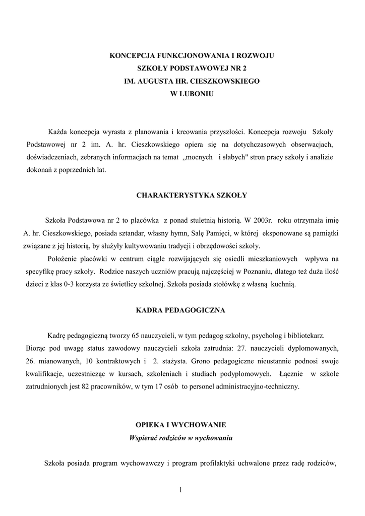 KONCEPCJA FUNKCJONOWANIA I ROZWOJU SZKOŁY PODSTAWOWEJ NR 2 IM. AUGUSTA HR. CIESZKOWSKIEGO W LUBONIU Każda koncepcja wyrasta z planowania i kreowania przyszłości. Koncepcja rozwoju Szkoły Podstawowej nr 2 im. A. hr. Cieszkowskiego opiera się na dotychczasowych obserwacjach, doświadczeniach, zebranych informacjach na temat „mocnych i słabych" stron pracy szkoły i analizie dokonań z poprzednich lat. CHARAKTERYSTYKA SZKOŁY Szkoła Podstawowa nr 2 to placówka z ponad stuletnią historią. W 2003r. roku otrzymała imię A. hr. Cieszkowskiego, posiada sztandar, własny hymn, Salę Pamięci, w której eksponowane są pamiątki związane z jej historią, by służyły kultywowaniu tradycji i obrzędowości szkoły. Położenie placówki w centrum ciągle rozwijających się osiedli mieszkaniowych wpływa na specyfikę pracy szkoły. Rodzice naszych uczniów pracują najczęściej w Poznaniu, dlatego też duża ilość dzieci z klas 0-3 korzysta ze świetlicy szkolnej. Szkoła posiada stołówkę z własną kuchnią. KADRA PEDAGOGICZNA Kadrę pedagogiczną tworzy 65 nauczycieli, w tym pedagog szkolny, psycholog i bibliotekarz. Biorąc pod uwagę status zawodowy nauczycieli szkoła zatrudnia: 27. nauczycieli dyplomowanych, 26. mianowanych, 10 kontraktowych i 2. stażysta. Grono pedagogiczne nieustannie podnosi swoje kwalifikacje, uczestnicząc w kursach, szkoleniach i studiach podyplomowych. Łącznie w szkole zatrudnionych jest 82 pracowników, w tym 17 osób to personel administracyjno-techniczny. OPIEKA I WYCHOWANIE Wspierać rodziców w wychowaniu Szkoła posiada program wychowawczy i program profilaktyki uchwalone przez radę rodziców, 1 które są wynikiem współpracy nauczycieli i rodziców. Uczniowie są systematycznie diagnozowani w zakresie swoich potrzeb, w szczególności ich poczucia bezpieczeństwa psychicznego i fizycznego. Poznawane jest także środowisko wychowanków. Szkoła stara się ściśle i systematycznie współpracować z rodzicami uczniów prezentujących trudne zachowania, organizując systematyczne spotkania, podczas których rozwiązywane są problemy poprzez negocjacje i wypracowanie kontraktu. Przy szkole działa świetlica socjoterapeutyczna, w której nasi uczniowie biorą udział w zajęciach terapeutycznych, a także pod opieką wychowawców odrabiają lekcje, uczą się kultury przygotowywania i spożywania posiłków, planowania i organizowania wolnego czasu. Dla uczniów przebywających dłużej w szkole zorganizowana jest świetlica szkolna, w której prowadzone są zajęcia mające na celu integrację grup i rozwój zainteresowań dzieci. Liczebność uczniów korzystających ze świetlicy coraz bardziej wzrasta. W szkole prowadzone są różnorodne akcje charytatywne na rzecz bardziej potrzebujących osób. DYDAKTYKA Naszym celem nadrzędnym jest stworzyć jak najlepsze warunki do harmonijnego i wszechstronnego rozwoju każdego ucznia na miarę jego możliwości. Praca dydaktyczna szkoły jest systematycznie diagnozowana i ewaluowana. Nauczyciele pracują w oparciu o programy nauczania, wybrane z listy MEN, oraz planu nadzoru pedagogicznego, który uwzględnia priorytety MEN, Kuratorium i wnioski z analizy pracy szkoły. W planowaniu dalszej pracy wspomaga dyrektora zespól diagnozujący pracę szkoły oraz zespół ds. analizy wyników sprawdzianu, a także przewodniczący zespołów samokształceniowych, których zadaniem jest monitorowanie osiągnięć i umiejętności uczniów, ich potrzeb, a także dokonywanie corocznej ewaluacji i analizy próbnego i głównego sprawdzianu. Wnioski z tych badań są uwzględniane w planie nadzoru pedagogicznego. Szkoła od kilku lat osiąga wysokie wyniki w sprawdzianie zewnętrznym. Nauczyciele podczas zajęć stosują metody aktywizujące, techniki twórczego myślenia, coraz częściej pracują metodą projektu edukacyjnego. W szkole organizuje się zajęcia pozalekcyjne, zarówno dla uczniów mających trudności w nauce, jak i zajęcia rozwijające zdolności i zainteresowania. Ważnym miejscem w procesie nauczania i samokształcenia jest biblioteka szkolna, która jako centrum multimedialne wspiera zarówno uczniów, jak i nauczycieli w samodzielnym wyszukiwaniu informacji poprzez stworzenie bazy materiałów dydaktycznych i informacyjnych. WSPÓŁPRACA Z RODZICAMI 2 Rodzice naszych uczniów jako pierwsi wychowawcy dziecka, współdecydują o podejmowanych przez szkołę działaniach wychowawczych i organizacji życia szkolnego. Wspierają szkołę w rozwiązywaniu pojawiających się problemów wychowawczych. Rodzice są współorganizatorami oraz uczestnikami różnych działań pozalekcyjnych, np. rajdy, wycieczki, imprezy szkolne i konkursy. Na szczególną uwagę zasługuje fakt organizowania corocznie festynu rodzinnego: „Pożegnanie lata z Cieszkowianką”. Rodzice angażują się także w zagospodarowanie terenów zieleni wokół budynku szkolnego, przyczynili się też do powstania tzw. „zielonego boiska” - ulubionego miejsca spędzania przerw przez dzieci. UCZNIOWIE Szkoła służy przede wszystkim uczniom, dlatego i oni są włączani do współorganizacji życia szkolnego. Staramy się by była miejscem zaspokajającym uczniowskie aspiracje, nie tylko na polu nauki, ale także umożliwiała, im podejmowanie twórczych działań i pomagała w realizacji własnych projektów. Ogromną rolę we wdrażaniu tych zamierzeń odgrywa Samorząd Uczniowski. Reprezentuje on szkołę na zewnątrz, przygotowuje imprezy wewnętrzne, wspó1pracuje z dyrekcją i nauczycielami. Wybory do Samorządu Uczniowskiego odbywają się co roku w określonym terminie i w sposób demokratyczny. Chętni do pracy w Samorządzie prezentują się społeczności uczniowskiej w różnorodny sposób, m.in. poprzez szkolny radiowęzeł, na plakatach, w specjalnym wydaniu szkolnej gazetki. W roku szkolnym 2008/2009 placówkę objęło kuratoryjne, zewnętrzne mierzenie pracy szkoły, które przeprowadzała wizyta