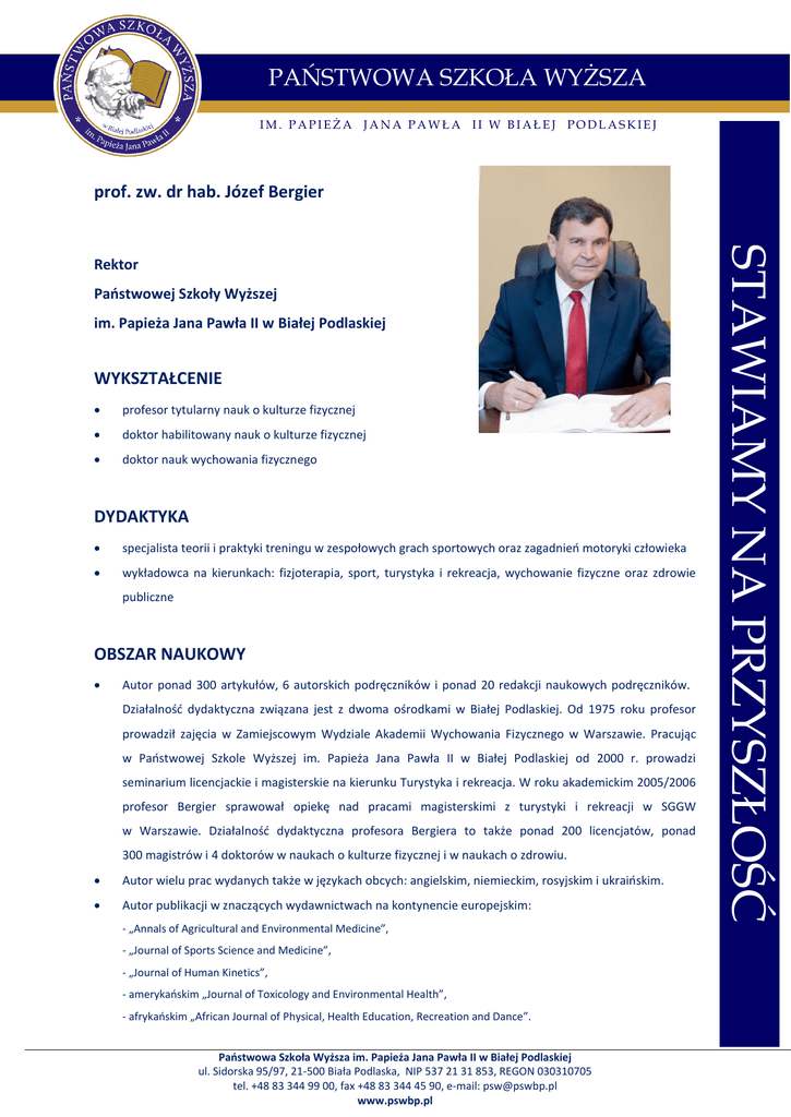 PAŃSTWOWA SZKOŁA WYŻSZA IM. PAPIEŻA JANA PAWŁA II W BIAŁEJ PODLASKIEJ prof. zw. dr hab. Józef Bergier Państwowej Szkoły Wyższej im. Papieża Jana Pawła II w Białej Podlaskiej WYKSZTAŁCENIE profesor tytularny nauk o kulturze fizycznej doktor habilitowany nauk o kulturze fizycznej doktor nauk wychowania fizycznego DYDAKTYKA specjalista teorii i praktyki treningu w zespołowych grach sportowych oraz zagadnień motoryki człowieka wykładowca na kierunkach: fizjoterapia, sport, turystyka i rekreacja, wychowanie fizyczne oraz zdrowie publiczne OBSZAR NAUKOWY Państwowa Szkoła Wyższa im. Papieża Jana20 Pawła II w Białej Podlaskiej Autor ponad 300 artykułów, 6 autorskich podręczników i ponad redakcji naukowych podręczników. www.pswbp.pl Działalność dydaktyczna związana jest z dwoma ośrodkami w Białej Podlaskiej. Od 1975 roku profesor prowadził zajęcia w Zamiejscowym Wydziale Akademii Wychowania Fizycznego w Warszawie. Pracując w Państwowej Szkole Wyższej im. Papieża Jana Pawła II w Białej Podlaskiej od 2000 r. prowadzi seminarium licencjackie i magisterskie na kierunku Turystyka i rekreacja. W roku akademickim 2005/2006 profesor Bergier sprawował opiekę nad pracami magisterskimi z turystyki i rekreacji w SGGW w Warszawie. Działalność dydaktyczna profesora Bergiera to także ponad 200 licencjatów, ponad 300 magistrów i 4 doktorów w naukach o kulturze fizycznej i w naukach o zdrowiu. Autor wielu prac wydanych także w językach obcych: angielskim, niemieckim, rosyjskim i ukraińskim. Autor publikacji w znaczących wydawnictwach na kontynencie europejskim: - „Annals of Agricultural and Environmental Medicine”, - „Journal of Sports Science and Medicine”, - „Journal of Human Kinetics”, - amerykańskim „Journal of Toxicology and Environmental Health”, - afrykańskim „African Journal of Physical, Health Education, Recreation and Dance”. Państwowa Szkoła Wyższa im. Papieża Jana Pawła II w Białej Podlaskiej ul. Sidorska 95/97, 21-500 Biała Podlaska, NIP 537 21 31 853, REGON 030310705 tel. +48 83 344 99 00, fax +48 83 344 45 90, e-mail: [email protected] www.pswbp.pl STAWIAMY NA PRZYSZŁOŚĆ Rektor PAŃSTWOWA SZKOŁA WYŻSZA IM. PAPIEŻA JANA PAWŁA II W BIAŁEJ PODLASKIEJ WYKAZ PUBLIKACJI „Piłka nożna dzieci i młodzieży” (1990), „Ocena obciążeń treningowych młodych piłkarzy” (1991), „Mini-piłka nożna” (1994), „Wybrane zagadnienia szkolenia bramkarzy w piłce nożnej” (1995), „Wiedza dzieci o nauczanych czynnościach ruchowych a skuteczność działań w grze zespołowej” (1998), „Charakterystyka i analiza gry w piłce nożnej mężczyzn i kobiet” (2009). Redaktor naukowy ponad dwudziestu podręczników z dziedzin: kultury fizycznej, m.in. z zakresu sportu: „Science in sport team games” (1995), „Sport dzieci i młodzieży na przełomie wieku” (2000), „Obserwacja i ocena działań zawodników w zespołowych grach sportowych” (2004), „Piłka nożna kobiet” (2006), „Sport kobiet w Polsce” (2008); turystyki i rekreacji: „Turystyka Państwowa Szkoław Wyższa a religia” (2003), „Survival teorii i praktyce” (2009); im. Papieża Jana Pawła II w Białej Podlaskiej hotelarstwa „Hotelarstwo – stan i kierunki rozwoju” www.pswbp.pl (2008); aspektów zdrowia: „Praca, sport i wypoczynek osób niepełnosprawnych” (2001), „Wellnes as a goal of health promotion and health education” (2008), „Sport powszechny w integracji z niepełnosprawnymi we wspólnej Europie” (2003), „Disability in society and Medicine” (2001), „Dobrostan celem promocji zdrowia i edukacji zdrowotnej” (2008), „Environmental factors shaping wellness in sickness and disability” (2010). Państwowa Szkoła Wyższa im. Papieża Jana Pawła II w Białej Podlaskiej ul. Sidorska 95/97, 21-500 Biała Podlaska, NIP 537 21 31 853, REGON 030310705 tel. +48 83 344 99 00, fax +48 83 344 45 90, e-mail: [email protected] www.pswbp.pl STAWIAMY NA PRZYSZŁOŚĆ Dorobek naukowy obejmuje 6 podręczników: PAŃSTWOWA SZKOŁA WYŻSZA IM. PAPIEŻA JANA PAWŁA II W BIAŁEJ PODLASKIEJ PEŁNIONE FUNKCJE, CZŁONKOSTWO I STANOWISKA POZA UCZELNIĄ redaktor naczelny czasopisma "Health Problems of Civilization" (dawniej "Human and Health”) zastępca redaktora naczelnego czasopisma „Rozprawy Społeczne Social Dissertations” redaktor tematyczny działu „Nutrition and Physical Activity” w czasopiśmie „Annals of Agricultural and Environmental Medicine” redaktor tematyczny działu w czasopiśmie naukowym „ARCHIVES OF BUDO” redaktor tematyczny działu „Zachowania Zdrowotne” w czasopiśmie „Medycyna Ogólna i Nauki o Zdrowiu”. Państwowa Szkoła Wyższa im. Papieża Jana Pawła II w Białej Podlaskiej www.pswbp.pl od 1985 r. członek Międzynarodowego Stowarzyszenia Motoryki Sportowej od 1985 r. zastępca przewodniczącego Międzynarodowego Towarzystwa Naukowego Gier Sportowych poseł na Sejm RP w latach 1997-2001. Zastępca przewodniczącego Komisji Senator RP w latach 2007-2011. Zastępca przewodniczącego Komisji członek Polskiej Komisji Akredytacyjnej; praca w zespołach: Zespół Nauk Medycznych, Farmaceutycznych, Zdrowiu i o Kulturze Fizycznej. trener klasy mistrzowskiej w piłce nożnej Czynnie uczestniczył w pracy szkoleniowej w piłce nożnej zdobywając kolejne tytuły: trenera kl. II trenera kl. I oraz trenera klasy mistrzowskiej. Od 1976 r. jest działaczem piłki nożnej pełniąc m.in. funkcję Prezesa Bialskopodlaskiego Okręgowego Związku Piłki Nożnej, a od 2009 r. Przewodniczącego Wydziału Piłkarstwa Kobiecego PZPN. Państwowa Szkoła Wyższa im. Papieża Jana Pawła II w Białej Podlaskiej ul. Sidorska 95/97, 21-500 Biała Podlaska, NIP 537 21 31 853, REGON 030310705 tel. +48 83 344 99 00, fax +48 83 344 45 90, e-mail: [email protected] www.pswbp.pl STAWIAMY NA PRZYSZŁOŚĆ prof. zw. dr hab. Józef Bergier Rektor Państwowej Szkoły Wyższej im. Papieża Jana Pawła II w
