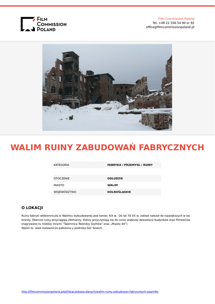 Film Commission Poland Tel. +48 22 556 54 90 or 92 office@filmcommissionpoland.pl WALIM RUINY ZABUDOWAŃ FABRYCZNYCH KATEGORIA FABRYKA / PRZEMYSŁ / RUINY OTOCZENIE ODLUDZIE MIASTO WALIM WOJEWÓDZTWO DOLNOŚLĄSKIE O LOKACJI Ruiny fabryki włókienniczej w Walimiu wybudowanej pod koniec XIX w. Do lat 70 XX w. zakład należał do największych w tej branży. Obecnie ruiny przyciągają złomiarzy, którzy przyczyniają się do coraz większej dewastacji budynków oraz filmowców (nagrywano tu miedzy innymi "Tajemnica Twierdzy Szyfrów" oraz „Miasto 44”). Walim to wieś malowniczo położona u podnóża Gór Sowich. http://filmcommissionpoland.pl/pl/lokacje/baza-danych/walim-ruiny-zabudowan-fabrycznych-agqmNx
