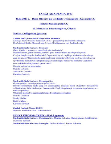 TARGI AKADEMIA 2013 20.03.2013 r. - Dzień Otwarty na Wydziale Oceanografii i Geografii UG Instytut Oceanografii UG al. Marszałka Piłsudskiego 46, Gdynia Stoiska - hall główny (parter): Zakład Funkcjonowania Ekosystemów Morskich Kolekcja Kultur Glonów Bałtyckich CCBA - przedstawią doktorantki z Pracowni Ekofizjologii Roślin Morskich mgr Sylwia Śliwińska oraz mgr Paulina Lemke Studenckie Koło Naukowe Geologów Gaz z łupków – szansa czy zagrożenie dla środowiska? Medialny temat, jakim ostatnio jest tzw. gaz z łupków niesie ze sobą wiele pytań. Czy jest bezpieczny dla środowiska? Czym różni się od zwykłego, niekonwencjonalnego gazu ziemnego? Nasze stoisko daje możliwość poznania wpływu na wody powierzchniowe i podziemne poszukiwań i eksploatacji gazu ziemnego z łupków na Pomorzu Gdańskim oraz na lokalne ekosystemy i społeczności. O gazie łupkowym opowiedzą: Monika Dobrzyń Aleksandra Gołacka Karolina Grajczak Studenckie Koło Naukowe Oceanografów Oceanografia – z nami popłyniesz gdzie chcesz Interdyscyplinarność nauki jaką jest oceanografia, ukazana okiem studentów zrzeszonych w Studenckim Kole Naukowym Oceanografii. Czyli jak połączyć przyjemne z pożytecznym nauka w podróży. O tym jak można być oceanografem i podróżnikiem opowiedzą: Monika Dolińska Maciej Mańko Rafał Michoń Karolina Serwach Zakład Geologii Morza IO UG Wystawa minerałów, skał i skamieniałości PUNKT INFORMACYJNY – HALL (parter) Studenckie Koło Naukowe Oceanografów: Monika Dolińska, Maciej Mańko, Rafał Michoń i Karolina Serwach Studenckie Koło Naukowe Geologów: Paulina Kotlarek, Joanna Tokarska