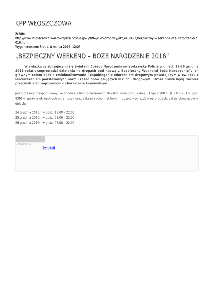 KPP WŁOSZCZOWA Źródło: http://www.wloszczowa.swietokrzyska.policja.gov.pl/tlw/ruch-drogowy/akcje/19423,Bezpieczny-Weekend-Boze-Narodzenie-2 016.html Wygenerowano: Środa, 8 marca 2017, 12:03 „BEZPIECZNY WEEKEND – BOŻE NARODZENIE 2016” W związku ze zbliżającymi się świętami Bożego Narodzenia świętokrzyska Policja w dniach 23-26 grudnia 2016 roku przeprowadzi działania na drogach pod nazwą „ Bezpieczny Weekend Boże Narodzenie”. Ich głównym celem będzie zminimalizowanie i zapobieganie zdarzeniom drogowym powstającym w związku z lekceważeniem podstawowych norm i zasad obowiązujących w ruchu drogowym. Stróże prawa będą również przeciwdziałać zagrożeniom o charakterze kryminalnym. Jednocześnie przypominamy, że zgodnie z Rozporzadzeniem Ministra Transportu z dnia 31 lipca 2007r. (Dz.U.z 2013r. poz. 839) w sprawie okresowych ograniczeń oraz zakazu ruchu niektórych rodzajów pojazdów na drogach, zakaz obowiązuje w dniach: 24 grudnia 2016r. w godz. 18.00 – 22.00 25 grudnia 2016r. w godz. 08.00 – 22.00 26 grudnia 2016r. w godz. 08.00 – 22.00. Ocena: 0/5 (0) Tweetnij