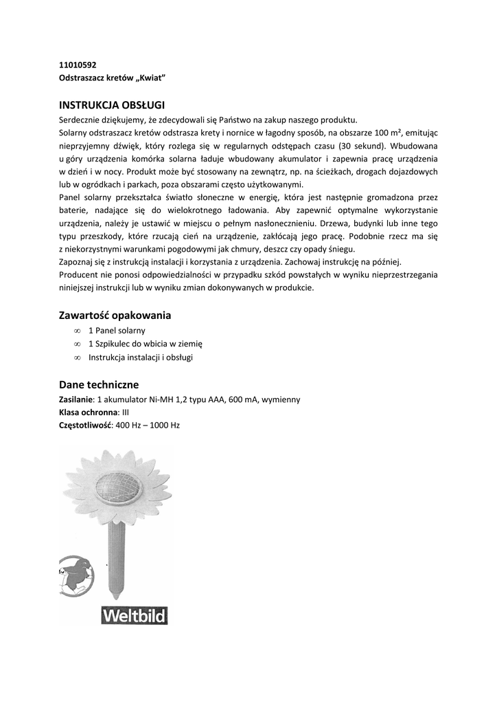 11010592 Odstraszacz kretów „Kwiat” INSTRUKCJA OBSŁUGI Serdecznie dziękujemy, że zdecydowali się Państwo na zakup naszego produktu. Solarny odstraszacz kretów odstrasza krety i nornice w łagodny sposób, na obszarze 100 m², emitując nieprzyjemny dźwięk, który rozlega się w regularnych odstępach czasu (30 sekund). Wbudowana u góry urządzenia komórka solarna ładuje wbudowany akumulator i zapewnia pracę urządzenia w dzień i w nocy. Produkt może być stosowany na zewnątrz, np. na ścieżkach, drogach dojazdowych lub w ogródkach i parkach, poza obszarami często użytkowanymi. Panel solarny przekształca światło słoneczne w energię, która jest następnie gromadzona przez baterie, nadające się do wielokrotnego ładowania. Aby zapewnić optymalne wykorzystanie urządzenia, należy je ustawić w miejscu o pełnym nasłonecznieniu. Drzewa, budynki lub inne tego typu przeszkody, które rzucają cień na urządzenie, zakłócają jego pracę. Podobnie rzecz ma się z niekorzystnymi warunkami pogodowymi jak chmury, deszcz czy opady śniegu. Zapoznaj się z instrukcją instalacji i korzystania z urządzenia. Zachowaj instrukcję na później. Producent nie ponosi odpowiedzialności w przypadku szkód powstałych w wyniku nieprzestrzegania niniejszej instrukcji lub w wyniku zmian dokonywanych w produkcie. Zawartość opakowania • • • 1 Panel solarny 1 Szpikulec do wbicia w ziemię Instrukcja instalacji i obsługi Dane techniczne Zasilanie: 1 akumulator Ni-MH 1,2 typu AAA, 600 mA, wymienny Klasa ochronna: III Częstotliwość: 400 Hz – 1000 Hz Wskazówki dotyczące bezpieczeństwa i ostrzeżenia • • • • • • • Ostrożnie wyjmij wszystkie elementy z opakowania. Przed uruchomieniem odstraszacza upewnij się, że nie został on uszkodzony podczas transportu. Jeśli urządzenie jest uszkodzone, korzystanie z niego jest zabronione. Nie naciskaj na frontową stronę komórki solarnej, ponieważ może to spowodować jej uszkodzenie. Opakowanie należy trzymać z dala od dzieci i zwierząt. Opakowanie zawiera drobne elementy, które mogą zostać połknięte przez dzieci. Nie wolno podejmować prób samodzielnej naprawy urządzenia. Odstraszacza nie należy narażać na działanie ekstremalnie wysokich temperatur i otwartego ognia. Produktu nie wolno zmieniać ani przebudowywać. Zmiany dokonywane w produkcie powodują utratę gwarancji. Montaż • • • • • • • • • Ostrożnie wyjmij produkt z opakowania. Ustaw odstraszacz w wybranym miejscu zachowując wskazówki bezpieczeństwa i ostrzeżenia. Po ustawieniu odstraszacza zwróć uwagę na to, aby był on odpowiednio połączony z podłożem. Podczas montażu uważaj na ryzyko potknięcia się. Do pierwszego naładowania akumulatora znajdź odpowiednie miejsce o bezpośrednim nasłonecznieniu. Zwróć uwagę na to, aby promienie słoneczne padały bezpośrednio na komórkę solarną. Cień padający na komórkę solarną zakłóca jej funkcjonowanie. Najpierw proszę połączyć przewody komórki solarnej z przewodami w szpikulcu. Połącz kolor czerwony z czerwonym i czarny z czarnym. Nałóż jednostkę solarną na górną część szpikulca. Ręką wbij szpikulec w ziemię. Nie używaj do tego młotka ani innego, podobnego narzędzia. Szpikulca nie należy wbijać w podłoże skaliste. Powód: niebezpieczeństwo odniesienia obrażeń i uszkodzenia szpikulca. Szpikulec należy wbić w ziemię najdalej na głębokość 25 cm. Koniec aluminiowej rurki szpikulca powinien się znajdować ok. 2 cm powyżej powierzchni ziemi. Czyszczenie i konserwacja • • • Jeśli jest taka potrzeba, produkt należy oczyścić z liści i zabrudzeń. Do czyszczenia użyj suchej lub lekko zwilżonej szmatki. Do czyszczenia nie używaj nigdy środków chemicznych ani rysujących powierzchnię. Jeśli urządzenie przez dłuższy czas nie jest używane należy wyjąć z niego baterie i schować je w suchym, osłoniętym miejscu. Utylizacja zużytych urządzeń Urządzenia po jego zużyciu nie należy wyrzucać wraz z odpadami domowymi lecz należy je oddać w punkcie zbiórki zużytych urządzeń elektrycznych i elektronicznych. Informuje o tym symbol umieszczony na produkcie, opakowaniu i w instrukcji.