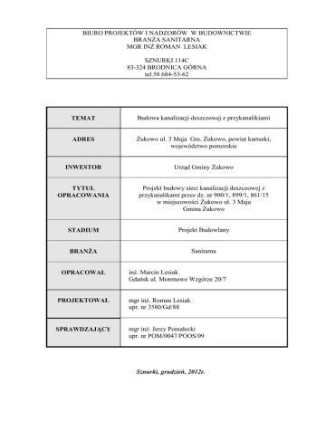 BIURO PROJEKTÓW I NADZORÓW W BUDOWNICTWIE BRANŻA SANITARNA MGR INŻ ROMAN LESIAK SZNURKI 114C 83-324 BRODNICA GÓRNA tel.58 684-53-62 TEMAT Budowa kanalizacji deszczowej z przykanalikiami ADRES Żukowo ul. 3 Maja Gm. Żukowo, powiat kartuski, województwo pomorskie INWESTOR Urząd Gminy Żukowo TYTUŁ OPRACOWANIA Projekt budowy sieci kanalizacji deszczowej z przykanalikami przez dz. nr 900/1, 899/1, 861/15 w miejscowości Żukowo ul. 3 Maja Gmina Żukowo STADIUM Projekt Budowlany BRANŻA Sanitarna OPRACOWAŁ inż. Marcin Lesiak Gdańsk ul. Morenowe Wzgórze 20/7 PROJEKTOWAŁ mgr inż. Roman Lesiak upr. nr 3580/Gd/88 SPRAWDZAJĄCY mgr inż. Jerzy Pomałecki upr. nr POM/0047/POOS/09 Sznurki, grudzień, 2012r. ZAWARTOŚĆ OPRACOWANIA OPIS TECHNICZNY 1. PODSTAWA OPRACOWANIA. 2. CEL I ZAKRES OPRACOWANIA. 3. CHARAKTERYSTYKA TERENU INWESTYCJI. 4. BUDOWA SIECI KANALIZACJI DESZCZOWEJ. 5. ZLEWNIA KANALIZACJI DESZCZOWEJ 6. ROBOTY BUDOWLANE. 7. UWAGI DLA WYKONAWCY ROBÓT 8. INFORMACJE DOTYCZĄCE BEZPIECZEŃSTWA I OCHRONY ZDROWIA ( BIOZ) RYSUNKI RYS. 1 Plan sytuacyjno - wysokościowy, SKALA 1:500 RYS. 2-3 Profile podłużne kanalizacji deszczowej SKALA 1:100/500/100 2 OPIS TECHNICZNY 1. PODSTAWA OPRACOWANIA 1.1. Zlecenie inwestora 1.2. Warunki projektowania zgodne z ustawą z dnia 10 kwietnia 2003 r. 1.3. Plan sytuacyjno – wysokościowy z uzbrojeniem terenu 1.4. Uzgodnienia z inwestorem 1.5. Wizja lokalna 1.6. Przepisy polskich i branżowych norm oraz normatywy obowiązujące przy budowie kanalizacji deszczowej 1.7. Warunki techniczne nr KŚR-ID.720.18.2012.WJ wydane przez Gminę Żukowo z dnia 05.12.2012 roku. 2. CEL I ZAKRES OPRACOWANIA Celem opracowania jest przedstawienie sposobu: Odprowadzenia wód opadowych z drogi asfaltowej ul. 3 Maja do szczelnej kanalizacji deszczowej i odprowadzenie ich do istniejącego rowu melioracyjnego. 3. CHARAKTERYSTYKA TERENU INWESTYCJI Obszar inwestycji obejmuje teren dz. nr 900/1, 899/1, 861/15 ul. 3 Maja w miejscowości Żukowo Gm. Żukowo. W obszarze opracowania zlokalizowane są istniejące sieci uzbrojenia terenu: przewody energetyczne , telekomunikacyjne oraz przewody wodociągowe i gazowe. 4. BUDOWA SIECI KANALIZACJI DESZCZOWEJ Zaprojektowano budowę kanalizacji deszczowej z rur PCV litych o podwyższonej wytrzymałości SDR34 o średnicy zewnętrznej Ø 315 x 9,2 łączonych na kielichy z uszczelką gumową o długości 165 metrów, Ø 250 x 7,3 łączonych na kielichy z uszczelką gumową o długości 41 metrów oraz Ø 200 x 5,9 łączonych na kielichy z uszczelką gumową o długości 13 metrów. Trasę kolektora przedstawiono na rys. nr 1 Na kolektorze zaprojektowano 8 studni rewizyjnych betonowych z kręgów Ø 1000 ( głębokość posadowienia według profilu i mapy), z dnem monolitycznym. 3 Jako zwieńczenia studni na płycie nastudziennej zamontować włazy żeliwne typu D400 z pokrywą typu wentylacyjnego z zabezpieczeniem przeciwko kradzieży. Wszystkie studnie kanalizacyjne poza D8 wyposażyć w pierścienie odciążające. Studnie rewizyjne wykonać zgodnie z PN-EN 1917. Włączenie nowej kanalizacji deszczowej należy wykonać do istniejącego rowu melioracyjnego. Na rurze wylotowej zamontować należy klapę zwrotną chroniącą przed cofaniem się wody w razie wysokich stanów wody. Przewody w studni D2 należy zlicować dnem. Włączenie sieci kanalizacji deszczowej wykonać do istniejącego rowu melioracyjnego na rzędnej 113.00 według rys. nr 1. Należy dokonać przełączenia istniejących wpustów ulicznych Kd3, Kd4, Kd7 do nowoprojektowanej kanalizacji deszczowej. Całość wód opadowych wprowadzić należy do separatora substancji ropopochodnych z częścią osadową. Część osadowa oczyszczać będzie wody opadowe celem zabezpieczenia istniejącego rowu przed zamulaniem. Separator wyposażyć należy w system powiadamiania o przepełnieniu komory osadu i flotatu, którą należy regularnie opróżniać. Separator wykonać jako betonowy o średnicy zewnętrznej DN 1740, szczegóły według rys. nr 8. Separator wyposażyć należy w przelew zabezpieczający przed nadmiarem wody opadowej. Dobrano separator COALISATOR L-CS_BYPASS-W/10/100/2000 marki ACO lub innego producenta o zbliżonych parametrach. Na separatorze zamontować właz typu lekkiego. Nowo zaprojektowane wpusty uliczny oraz przełączane podłączyć do studni kanalizacji deszczowej za pomocą rury PVC litej o podwyższonej wytrzymałości SDR34 o średnicy Ø 200 x 5,9 i 250 x 7,3 łączonej na kielichy z uszczelką gumową o długości według rysunków. Spadek przykanalików według profili. Przejścia przewodów przez ściany studni betonowych i separatora wykonać w tulejach ochronnych. Ściany zewnętrzne studni zaizolować dwukrotnie abizolem R+P. Wpusty uliczne Kd – sztuk 7 (lokalizacja zgodnie z projektem budowlanym) przewidziano jako żeliwny z rusztem uchylnym na zawiasie z zamkiem klasy D400 z zabezpieczeniem przeciwko kradzieży. Projektowane rzędne włazów skorygować na budowie. Studzienki ściekowe pod wpustami ulicznymi przewiduje się jako betonowe Ø 500 z osadnikami o głębokości 0,50 m, oraz jednoelementowym koszem na nieczystości o głębokości 0,6 m. Na studzience wykonać należy pierścienie odciążające. W osadniku wody opadowe oczyszczane będą z zawiesiny łatwo opadającej (piasek, drobne kamienie, żwir itp.). Rury należy układać na podsypce piaskowo - żwirowej o grubości 20cm. po zagęszczeniu, nie 4 zawierającej cząstek o uziarnieniu większym niż 10 mm, zgodnie z wytycznymi montażu rur podanymi przez producenta, ze spadkami wskazanymi na rysunkach profili podłużnych. Po ułożeniu rurociągu, przed zasypaniem, należy poddać go próbie szczelności zgodnie z PN i zgłosić do odbioru . Na przewodach energetycznych i telekomunikacyjnych należy zamontować rury dwudzielne osłonowe typu np. Arota o długości 1 m. Grubość warstwy ochronnej zasypki ponad wierzch przewodu powinna wynosić min. 30cm. Grunt używa