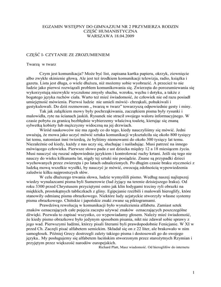 EGZAMIN WSTĘPNY DO GIMNAZJUM NR 2 PRZYMIERZA RODZIN CZĘŚĆ HUMANISTYCZNA WARSZAWA 18.04.2009 CZĘŚĆ I- CZYTANIE ZE ZROZUMIENIEM Twarzą w twarz Czym jest komunikacja? MoŜe być list, zapisana kartka papieru, okrzyk, ziewnięcie albo zwykłe skinienie głową. Ale jest teŜ środkiem komunikacji telewizja, radio, ksiąŜka i gazeta. Lista jest długa, o wiele dłuŜsza, niŜ moŜemy sobie wyobrazić. A przecieŜ to nie ludzie jako pierwsi rozwiązali problem komunikowania się. Zwierzęta do porozumiewania się wykorzystują niezwykle wyczulone zmysły słuchu, wzroku, węchu i dotyku, a takŜe z bogatego języka ruchów ciała. Warto teŜ mieć świadomość, Ŝe człowiek nie od razu posiadł umiejętność mówienia. Pierwsi ludzie nie umieli mówić- chrząkali, pohukiwali i gestykulowali. Do dziś rozmowom „ twarzą w twarz” towarzyszą odpowiednie gesty i miny. Tak jak zaląŜkiem mowy były pochrząkiwania, zaczątkiem pisma były rysunki i malowidła, ryte na ścianach jaskiń. Rysunek nie stracił swojego waloru informacyjnego. W czasie pobytu za granicą bezbłędnie wybierzemy właściwą toaletę, kierując się znaną sylwetką kobiety lub męŜczyzny widoczną na jej drzwiach. Wśród naukowców nie ma zgody co do tego, kiedy nauczyliśmy się mówić. Jedni uwaŜają, Ŝe mowa jako uczyć mówić sztuka komunikacji wykształciła się około 800 tysięcy lat temu, natomiast inni twierdzą, Ŝe byliśmy niemowami do około 300 tysięcy lat temu. NiezaleŜnie od kiedy, kaŜdy z nas uczy się, słuchając i naśladując. Musi patrzeć na innego mówiącego człowieka. Pierwsze słowo pada z ust dziecka między 12 a 18 miesiącem Ŝycia. Musi nauczyć się ruszać odpowiednio językiem i kontrolować ruchy krtani. Jeśli się tego nie nauczy do wieku kilkunastu lat, nigdy tej sztuki nie posiądzie. Znane są przypadki dzieci wychowanych przez zwierzęta i po latach odnalezionych. Po długim czasie braku styczności z ludzką mową wszelkie wysiłki, by nauczyć je mówić, owocują zdolnością wypowiedzenia zaledwie kilku najprostszych słów. W celu dłuŜszego trwania słowa, ludzie wymyślili pismo. Według naszej najlepszej wiedzy wynalazcami pisma byli Sumerowie (lud Ŝyjący na terenie dzisiejszego Iraku). Od roku 3300 przed Chrystusem przyciętymi ostro jak klin łodygami trzciny ryli obrazki na miękkich, prostokątnych tabliczkach z gliny. Egipcjanie rzeźbili i malowali hieroglify, które stanowiły odmianę pisma obrazkowego. Niektóre ludy azjatyckie stworzyły własne systemy pisma obrazkowego. Chińskie i japońskie znaki zwane są piktogramami. Prawdziwą rewolucją w komunikacji było wynalezienia alfabetu. Zamiast setek znaków oznaczających całe pojęcia zaczęto uŜywać znaków oznaczających poszczególne dźwięki. Pozwala to zapisać wszystko, co wypowiadamy głosem. NaleŜy mieć świadomość, Ŝe kiedy pismo obrazkowe było jedynym sposobem pisania, nikt nie zdawał sobie sprawy z jego wad. Pierwszymi ludźmi, którzy pisali literami byli prawdopodobnie Fenicjanie. W XI w przed Ch. Zaczęli pisać alfabetem semickim. Składał się on z 22 liter, ale brakowało w nim samogłosek. Później Grecy dostrzegli zalety takiego pisma i dostosowali go do swojego języka.. My posługujemy się alfabetem łacińskim stworzonym przez staroŜytnych Rzymian i przyjętym przez większość narodów europejskich. Richard Platt, Masz wiadomość. Od hieroglifów do internetu 1 1.W jakiej kolejności ludzie uczyli się komunikacji?( 0-1) Pismo obrazkowe Mowa ciała Proste dźwięki Pismo alfabetowe 2. Jak nazywają się znaki pisma egipskiego?(0-1) A. piktogramy B. hieroglify C. pismo obrazkowe 3. W jaki sposób i kiedy zaczęli pisać Sumerowie? MoŜesz napisać to własnymi słowami, albo zacytować odpowiedni fragment tekstu. ( 0-3) ……………………………………………………………………………………………… ……………………………………………………………………………………………….. ………………………………………………………………………………………………. ……………………………………………………………………………………………… …………………………………………………………………………………………………. 4. Jakie narządy, potrzebne do mówienia, wymienia autor tekstu ( 0-1) A. język i krtań B. krtań i usta C. wargi i płuca 5. W jaki sposób dziecko uczy się mówić? ( 0-2) ……………………………………………………………………………………………….... ………………………………………………………………………………………………… ………………………………………………………………………………………………… 6. Napisz ogłoszenie o wykładzie i wystawie na temat powstania pisma. Wymyśl kto, gdzie i kiedy zorganizuje takie spotkanie ( 0-5) ………………………………………………………………………………………………… ………………………………………………………………………………………………… 2 ………………………………………………………………………………………………… ………………………………………………………………………………………………… ………………………………………………………………………………………………… ………………………………………………………………………………………………… ………………………………………………………………………………………………… ………………………………………………………………………………………………… ………………………………………………………
