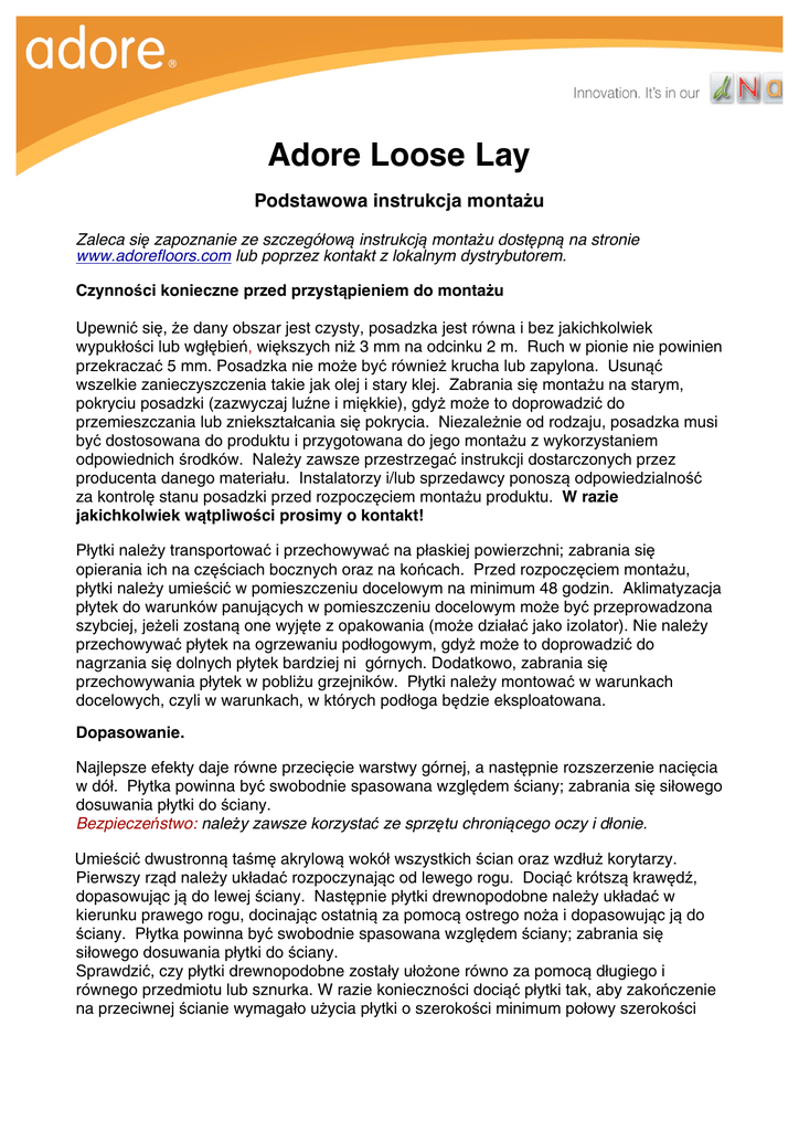 Adore Loose Lay Podstawowa instrukcja montażu Zaleca się zapoznanie ze szczegółową instrukcją montażu dostępną na stronie www.adorefloors.com lub poprzez kontakt z lokalnym dystrybutorem. Czynności konieczne przed przystąpieniem do montażu Upewnić się, że dany obszar jest czysty, posadzka jest równa i bez jakichkolwiek wypukłości lub wgłębień, większych niż 3 mm na odcinku 2 m. Ruch w pionie nie powinien przekraczać 5 mm. Posadzka nie może być również krucha lub zapylona. Usunąć wszelkie zanieczyszczenia takie jak olej i stary klej. Zabrania się montażu na starym, pokryciu posadzki (zazwyczaj luźne i miękkie), gdyż może to doprowadzić do przemieszczania lub zniekształcania się pokrycia. Niezależnie od rodzaju, posadzka musi być dostosowana do produktu i przygotowana do jego montażu z wykorzystaniem odpowiednich środków. Należy zawsze przestrzegać instrukcji dostarczonych przez producenta danego materiału. Instalatorzy i/lub sprzedawcy ponoszą odpowiedzialność za kontrolę stanu posadzki przed rozpoczęciem montażu produktu. W razie jakichkolwiek wątpliwości prosimy o kontakt! Płytki należy transportować i przechowywać na płaskiej powierzchni; zabrania się opierania ich na częściach bocznych oraz na końcach. Przed rozpoczęciem montażu, płytki należy umieścić w pomieszczeniu docelowym na minimum 48 godzin. Aklimatyzacja płytek do warunków panujących w pomieszczeniu docelowym może być przeprowadzona szybciej, jeżeli zostaną one wyjęte z opakowania (może działać jako izolator). Nie należy przechowywać płytek na ogrzewaniu podłogowym, gdyż może to doprowadzić do nagrzania się dolnych płytek bardziej ni górnych. Dodatkowo, zabrania się przechowywania płytek w pobliżu grzejników. Płytki należy montować w warunkach docelowych, czyli w warunkach, w których podłoga będzie eksploatowana. Dopasowanie. Najlepsze efekty daje równe przecięcie warstwy górnej, a następnie rozszerzenie nacięcia w dół. Płytka powinna być swobodnie spasowana względem ściany; zabrania się siłowego dosuwania płytki do ściany. Bezpieczeństwo: należy zawsze korzystać ze sprzętu chroniącego oczy i dłonie. Umieścić dwustronną taśmę akrylową wokół wszystkich ścian oraz wzdłuż korytarzy. Pierwszy rząd należy układać rozpoczynając od lewego rogu. Dociąć krótszą krawędź, dopasowując ją do lewej ściany. Następnie płytki drewnopodobne należy układać w kierunku prawego rogu, docinając ostatnią za pomocą ostrego noża i dopasowując ją do ściany. Płytka powinna być swobodnie spasowana względem ściany; zabrania się siłowego dosuwania płytki do ściany. Sprawdzić, czy płytki drewnopodobne zostały ułożone równo za pomocą długiego i równego przedmiotu lub sznurka. W razie konieczności dociąć płytki tak, aby zakończenie na przeciwnej ścianie wymagało użycia płytki o szerokości minimum połowy szerokości całkowitej. Następnie płytki należy odsunąć od ściany i usunąć folię ochronną z taśmy dwustronnej. Ponownie umieścić płytki w odpowiednich miejscach dociskając je do taśmy. Rozpocząć układanie drugiego rzędu, wykorzystując odcięte fragmenty z płytek w pierwszym rzędzie pod warunkiem, że ich długość wynosi więcej niż 200 mm i są one oddalone o minimum 300 mm od krótszego połączenia w pierwszym rzędzie. Ułożyć płytkę drewnopodobną obok pierwszego rzędu i dociąć ją dopasowując do lewej ściany. Układać drugi rząd w kierunku prawej ściany. Kolejne rzędy płytek należy układać zgodnie z powyższymi wskazówkami, docinając i dopasowując ostatni rząd do ściany końcowej.