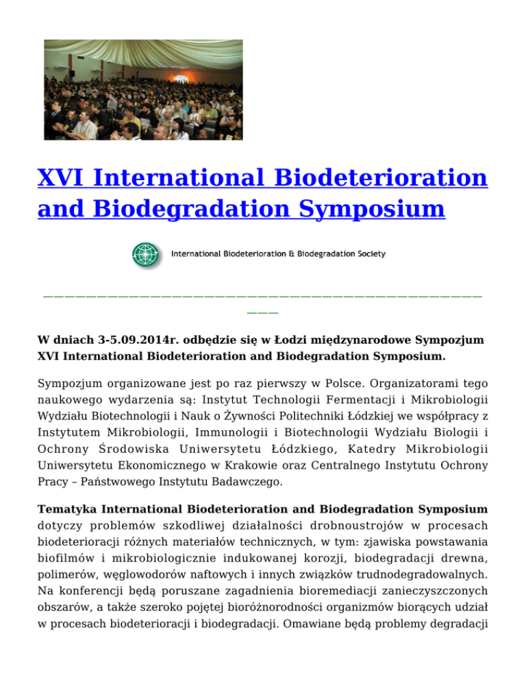 XVI International Biodeterioration and Biodegradation Symposium ————————————————————————————————————————— ——— W dniach 3-5.09.2014r. odbędzie się w Łodzi międzynarodowe Sympozjum XVI International Biodeterioration and Biodegradation Symposium. Sympozjum organizowane jest po raz pierwszy w Polsce. Organizatorami tego naukowego wydarzenia są: Instytut Technologii Fermentacji i Mikrobiologii Wydziału Biotechnologii i Nauk o Żywności Politechniki Łódzkiej we współpracy z Instytutem Mikrobiologii, Immunologii i Biotechnologii Wydziału Biologii i Ochrony Środowiska Uniwersytetu Łódzkiego, Katedry Mikrobiologii Uniwersytetu Ekonomicznego w Krakowie oraz Centralnego Instytutu Ochrony Pracy – Państwowego Instytutu Badawczego. Tematyka International Biodeterioration and Biodegradation Symposium dotyczy problemów szkodliwej działalności drobnoustrojów w procesach biodeterioracji różnych materiałów technicznych, w tym: zjawiska powstawania biofilmów i mikrobiologicznie indukowanej korozji, biodegradacji drewna, polimerów, węglowodorów naftowych i innych związków trudnodegradowalnych. Na konferencji będą poruszane zagadnienia bioremediacji zanieczyszczonych obszarów, a także szeroko pojętej bioróżnorodności organizmów biorących udział w procesach biodeterioracji i biodegradacji. Omawiane będą problemy degradacji i ochrony dziedzictwa kulturowego, a także sposoby zabezpieczania przed korozją mikrobiologiczną i usuwania jej skutków. W programie przewiduje się wykłady plenarne, sesje referatowe, posterowe. Sympozjum towarzyszyć będą targi biocydów, dezynfektantów, środków do ochrony antykorozyjnej, a także urządzeń do dezynfekcji. W Sympozjum przewiduje się udział ponad 400 uczestników z ośrodków naukowo – badawczych z całego świata, w tym wybitnych ekspertów m.in. prof. Christine Gaylarde, prof. Iwona Beech, prof. Ángel Martínez, prof. Geoff Robson, prof. Katjia Sterflingler, prof. Katerina Demnerova, prof. Jimmy Walker, prof. Joe Suflita, prof Dennis Allsopp oraz wielu innych. Rejestracja jest już otwarta i trwa do 30 czerwca 2014 r. Szczegółowe informacje można znaleźć na stronie www.ibbs2014.p.lodz.pl ————————————————————————————————————————— ——— Data publikacji: 13.04.2014r.