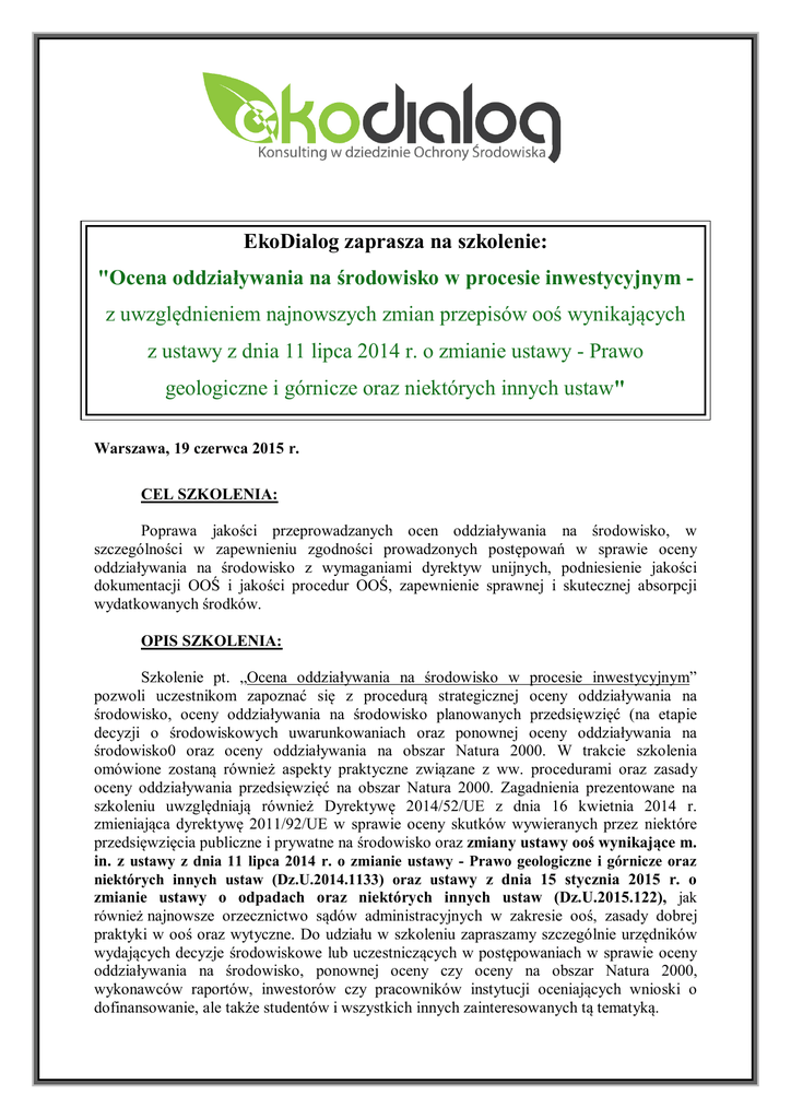EkoDialog zaprasza na szkolenie: "Ocena oddziaływania na środowisko w procesie inwestycyjnym z uwzględnieniem najnowszych zmian przepisów ooś wynikających z ustawy z dnia 11 lipca 2014 r. o zmianie ustawy - Prawo geologiczne i górnicze oraz niektórych innych ustaw" Warszawa, 19 czerwca 2015 r. CEL SZKOLENIA: Poprawa jakości przeprowadzanych ocen oddziaływania na środowisko, w szczególności w zapewnieniu zgodności prowadzonych postępowań w sprawie oceny oddziaływania na środowisko z wymaganiami dyrektyw unijnych, podniesienie jakości dokumentacji OOŚ i jakości procedur OOŚ, zapewnienie sprawnej i skutecznej absorpcji wydatkowanych środków. OPIS SZKOLENIA: Szkolenie pt. „Ocena oddziaływania na środowisko w procesie inwestycyjnym” pozwoli uczestnikom zapoznać się z procedurą strategicznej oceny oddziaływania na środowisko, oceny oddziaływania na środowisko planowanych przedsięwzięć (na etapie decyzji o środowiskowych uwarunkowaniach oraz ponownej oceny oddziaływania na środowisko0 oraz oceny oddziaływania na obszar Natura 2000. W trakcie szkolenia omówione zostaną również aspekty praktyczne związane z ww. procedurami oraz zasady oceny oddziaływania przedsięwzięć na obszar Natura 2000. Zagadnienia prezentowane na szkoleniu uwzględniają również Dyrektywę 2014/52/UE z dnia 16 kwietnia 2014 r. zmieniająca dyrektywę 2011/92/UE w sprawie oceny skutków wywieranych przez niektóre przedsięwzięcia publiczne i prywatne na środowisko oraz zmiany ustawy ooś wynikające m. in. z ustawy z dnia 11 lipca 2014 r. o zmianie ustawy - Prawo geologiczne i górnicze oraz niektórych innych ustaw (Dz.U.2014.1133) oraz ustawy z dnia 15 stycznia 2015 r. o zmianie ustawy o odpadach oraz niektórych innych ustaw (Dz.U.2015.122), jak również najnowsze orzecznictwo sądów administracyjnych w zakresie ooś, zasady dobrej praktyki w ooś oraz wytyczne. Do udziału w szkoleniu zapraszamy szczególnie urzędników wydających decyzje środowiskowe lub uczestniczących w postępowaniach w sprawie oceny oddziaływania na środowisko, ponownej oceny czy oceny na obszar Natura 2000, wykonawców raportów, inwestorów czy pracowników instytucji oceniających wnioski o dofinansowanie, ale także studentów i wszystkich innych zainteresowanych tą tematyką. PROGRAM SZKOLENIA: 1. 2. 3. 4. 5. 6. 7. 8. 9. Wprowadzenie System OOŚ w Unii Europejskiej - podstawy prawne System OOŚ w Polsce - podstawy prawne Strategiczna Ocena Oddziaływania na Środowisko (SOOŚ) - dotycząca projektów polityk, strategii, planów i programów projekty dokumentów podlegające SOOŚ odstąpienie od SOOŚ zakres prognozy opiniowanie przez właściwe organy udział społeczeństwa Ocena Oddziaływania na Środowisko planowanych przedsięwzięć podział przedsięwzięć, przedsięwzięcia podlegające OOŚ postępowania, w ramach których przeprowadza się OOŚ organy przeprowadzające OOŚ screening zakres raportu, scoping decyzja o środowiskowych uwarunkowaniach opiniowanie przez właściwe organy udział społeczeństwa zakres decyzji z OOŚ i bez OOŚ Ponowna ocena oddziaływania przedsięwzięcia na środowisko Postępowanie w sprawie transgranicznego oddziaływania na środowisko Ocena oddziaływania przedsięwzięć na obszary Natura 2000 europejska sieć ekologiczna Natura 2000 procedura oceny oddziaływania inwestycji na obszar Natura 2000 Realizacja projektów infrastrukturalnych finansowanych ze środków unijnych a OOŚ wybrane aspekty WYKŁADOWCA: Dr JOANNA SZTYBER Radca Generalnego Dyrektora w Wydziale ds. Orzecznictwa Administracyjnego Departamentu Ocen Oddziaływania Na Środowisko Generalnej Dyrekcji Ochrony Środowiska. Posiada wieloletnie doświadczenie w zakresie stosowania przepisów związanych z oceną oddziaływania na środowisko przedsięwzięć (przygotowanie projektów rozstrzygnięć administracyjnych w I i II instancji, udzielanie odpowiedzi Komisji Europejskiej w związku ze skargami dotyczącymi ooś dla inwestycji ubiegających się o dofinansowanie, przygotowywanie pism procesowych do sądów administracyjnych) oraz bogatą praktykę jako wykładowca (ponad 400 godzin szkoleń z dziedziny ocen oddziaływania na środowisko). LOKALIZACJA: Warszawa, Centrum Konferencyjne Golden Floor, budynek Millennium Plaza, al. Jerozolimskie 123A, samo centrum miasta (Rondo Zawiszy), ok. 600 metrów od Dworca Centralnego. Numer sali prześlemy na kilka dni przed szkoleniem. TERMIN: 19 czerwca 2015 r., zajęcia odbywają się w godzinach 10.00 - 16.00 KOSZT: 590 PLN netto (+ 23% VAT) za osobę Szkolenie ma charakter usługi kształcenia zawodowego. Dla instytucji zaświadczających, że szkolenie finansowane jest ze środków publicznych (w całości bądź minimum w 70%) zastosujemy stawkę VAT zw. W CENĘ SZKOLENIA WLICZONE SĄ: Wykład, Materiały szkoleniowe, Obiad, Serwis kawowy, Zaświadczenia uczestnictwa. KONTAKT: [email protected] tel. 604 533 262 www.ekodialog.pl