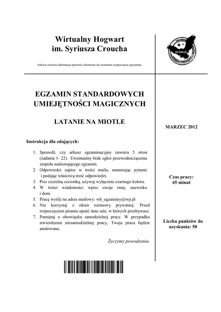 Wirtualny Hogwart im. Syriusza Croucha Arkusz zawiera informacje prawnie chronione do momentu rozpoczęcia egzaminu. EGZAMIN STANDARDOWYCH UMIEJĘTNOŚCI MAGICZNYCH LATANIE NA MIOTLE MARZEC 2012 Instrukcja dla zdających: 1. Sprawdź, czy arkusz egzaminacyjny zawiera 5 stron (zadania 1- 22). Ewentualny brak zgłoś przewodniczącemu zespołu nadzorującego egzamin. 2. Odpowiedzi zapisz w treści maila, numerując pytanie i podając właściwą treść odpowiedzi. 3. Pisz czytelną czcionką, używaj wyłącznie czarnego koloru. 4. W treści wiadomości wpisz swoje imię, nazwisko i dom. 5. Pracę wyślij na adres mailowy: [email protected] 6. Nie korzystaj z okien rozmowy prywatnej. Przed rozpoczęciem pisania opuść inne sale, w których przebywasz. 7. Pamiętaj o obowiązku samodzielnej pracy. W przypadku stwierdzenia niesamodzielnej pracy, Twoja praca będzie anulowana. Życzymy powodzenia. Czas pracy: 45 minut Liczba punktów do uzyskania: 50 Wirtualny Hogwart im. Syriusza Croucha Latanie na miotle Standardowe Umiejętności Magiczne Zadanie 1. (2 pkt) Ilu jest zawodników na boisku? A. B. C. D. 7 14 8 15 Zadanie 2. (2 pkt) Ile jest pętli na boisku? A. B. C. D. 3 8 4 6 Zadanie 3. (2 pkt) Ile cali ma kafel? A. B. C. D. 13 cali 12 cali 10 cali 11 cali Zadanie 4. (2 pkt) Dokończ zdanie.. "Quidditch jest najbardziej ekscytującą.... " …………………………………………………………………………………………. Zadanie 5. (2 pkt) Ile jest zasad gry w Quidditcha? A. B. C. D. 3 5 7 9 2 Wirtualny Hogwart im. Syriusza Croucha Latanie na miotle Standardowe Umiejętności Magiczne Zadanie 6. (2 pkt) Wymień 2 przykłady mioteł z wytwórni "Spółka Wytwórców Komet". (1) ………………………………………………………………………………………. (2) ………………………………………………………………………………………. Zadanie 7. (2 pkt) Która piłka powstała w XIII wieku? ………………………………………………………………………………………....... Zadanie 8. (2 pkt) Ile punktów zdobywa drużyna za złapanie Złotego Znicza przez ich szukającego? ………………………………………………………………………………………....... Zadanie 9. (2 pkt) W 1398 roku, ktoś stworzył pełny opis gry w Quidditcha. Kto to był? ………………………………………………………………………………………....... Zadanie 10. (2 pkt) Jaki kolor ma Kafel? ………………………………………………………………………………………....... Zadanie 11. (2 pkt) Z jakimi zawodnikami łączy się Złoty Znicz? ………………………………………………………………………………………....... Zadanie 12. (2 pkt) Różnicą między LnM a Quidditchem na pewno nie jest... A. Quidditch to gra, natomiast LnM to przedmiot nauczany w szkole B. Quidditch jest to praktyczne użycie miotły, LnM nauczeniem się o tym, czym ta miotła jest i skąd powstała C. Quidditch to gra zespołowa, a LnM to ogólne latanie na miotle. 3 Wirtualny Hogwart im. Syriusza Croucha Latanie na miotle Standardowe Umiejętności Magiczne Zadanie 13. (2 pkt) Określ w maksymalnie 10 słowach o czym mówi siódma zasada ustalona przez Ministerstwo Magii. ………………………………………………………………………………………....... Zadanie 14. (2 pkt) Kafel jest sporządzany z? A. B. C. D. kamieni szlachetnych skóry materiału kamienia miękkiego Zadanie 15. (8 pkt) Na pytania odpowiedz tak lub nie. TAK NIE 15.1 15.2 15.3 15.4 Czy boisko do Quidditcha posiada na środku koło? Czy tłuczki obecnie są sporządzane z ołowiu? Czy pozycja obrońcy istnieje od XII wieku? Czy Srebna Strzała została wydana w 1456r? Zadanie 16. (2 pkt) W którym wieku powstała pierwotna miotła? A. B. C. D. X wieku XI wieku IX wieku VIII wieku Zadanie 17. (2 pkt) Rozwiń skrót LnM. ………………………………………………………………………………………....... Zadanie 18. (2 pkt) Kto i kiedy stworzył pierwszą profesjonalną miotłę? Jak się nazywała? ………………………………………………………………………………………....... 4 Wirtualny Hogwart im. Syriusza Croucha Latanie na miotle Standardowe Umiejętności Magiczne Zadanie 19. (2 pkt) W którym wieku ustalono wymiary boiska? ………………………………………………………………………………………....... Zadanie 20. (2 pkt) Ile było dekretów Rady Czarodziejów odnośnie Mugoli? A. B. C. D. 2 4 3 5 Zadanie 21. (2pkt) Co się stało w 1901 roku? ………………………………………………………………………………………....... Zadanie 22. (2 pkt) Która z piłek jest Złota? ………………………………………………………………………………………....... 5