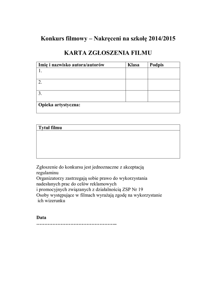 Konkurs filmowy – Nakręceni na szkołę 2014/2015 KARTA ZGŁOSZENIA FILMU Imię i nazwisko autora/autorów 1. Klasa Podpis 2. 3. Opieka artystyczna: Tytuł filmu Zgłoszenie do konkursu jest jednoznaczne z akceptacją regulaminu Organizatorzy zastrzegają sobie prawo do wykorzystania nadesłanych prac do celów reklamowych i promocyjnych związanych z działalnością ZSP Nr 19 Osoby występujące w filmach wyrażają zgodę na wykorzystanie ich wizerunku Data …………………………………………..