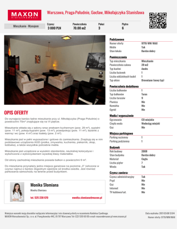 Warszawa, Praga-Południe, Gocław, Mikołajczyka Stanisława Mieszkanie - Wynajem Czynsz 3 000 PLN Powierzchnia 70.00 m2 Pokoi Piętro 3 6 Podstawowe Numer oferty 9770/MW/MAX Meble Tak Stan lokalu Bardzo dobry Pomieszczenia Typ mieszkania Mieszkanie Powierzchnia salonu 29 m2 Typ kuchni Aneks Liczba łazienek 1 Liczba oddzielnych toalet 1 Typ okien Drewniane (nowy typ) Powierzchnia dodatkowa OPIS OFERTY Do wynajęcia bardzo ładne mieszkanie przy ul. Mikołajczyka (Praga Południe) o powierzchni 70m² znajdujące się na VI piętrze. Mieszkanie składa się z salonu wraz aneksem kuchennym (pow. 29 m²), sypialni (pow. 11 m²), pokoju/sypialni (pow. 13 m²), przedpokoju (pow. 11 m²), łazienki z wanną i wc (pow. 4 m²) oraz toalety (pow. 2 m²). Mieszkanie jest w pełni wyposażone i gotowe do zamieszkania. Znajdują się w nim podstawowe urządzenia AGD (pralka, zmywarka, kuchenka, piekarnik, okap, lodówka), a także wszystkie potrzebne meble. Mieszkanie jest urządzone w wysokim standardzie, neutralnej kolorystyce i wykończone z wykorzystaniem wysokiej klasy materiałów. Od strony zachodniej mieszkanie posiada balkon o powierzchni 9 m². Do mieszkania przynależy jedno miejsce garażowe na poziomie „0” (wliczone w czynsz najmu) o bardzo dogodnym wjeździe od środka osiedla. Jest również parkowania samochodu na terenie przed budynkiem. Monika Słomiana Monika Słomiana tel. 525 230 670 Liczba balkonów 1 Typ balkonów Taras Liczba tarasów 9 Piwnica Nie Komórka Nie Ogród Nie Media i wyposażenie Ogrzewanie CO miejskie Ciepła woda Wodociąg miejski Gaz Nie Miejsca parkingowe Parking naziemny 1 Parking podziemny 1 Budynek Rok budowy 2008 Stan budynku Bardzo dobry Materiał Cegła Liczba pięter 7 Winda Tak Czynsz zawiera: Czynsz administracyjny Tak Prąd Nie Gaz Nie Internet Nie TV kablowa/sat. Nie [email protected] Niniejsze warunki mają charakter wyłącznie informacyjny i nie stanowią oferty w rozumieniu Kodeksu Cywilnego. MAXON Nieruchomości Sp. z o o. ul. Powązkowska 44C, 01-797 Warszawa Tel: (22) 530 60 00 e-mail: [email protected] www.maxon.pl Data wydruku: 2017-03-08 12:04 Numer oferty: 9770/MW/MAX
