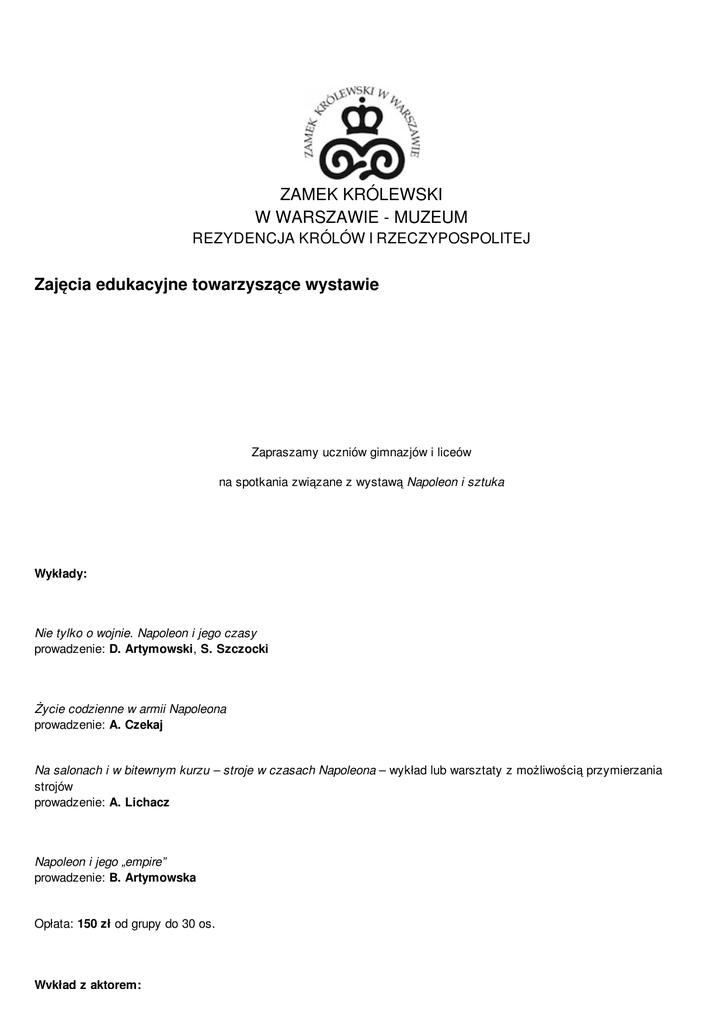 ZAMEK KRÓLEWSKI W WARSZAWIE - MUZEUM REZYDENCJA KRÓLÓW I RZECZYPOSPOLITEJ Zajęcia edukacyjne towarzyszące wystawie Zapraszamy uczniów gimnazjów i liceów na spotkania związane z wystawą Napoleon i sztuka Wykłady: Nie tylko o wojnie. Napoleon i jego czasy prowadzenie: D. Artymowski, S. Szczocki Życie codzienne w armii Napoleona prowadzenie: A. Czekaj Na salonach i w bitewnym kurzu – stroje w czasach Napoleona – wykład lub warsztaty z możliwością przymierzania strojów prowadzenie: A. Lichacz Napoleon i jego „empire” prowadzenie: B. Artymowska Opłata: 150 zł od grupy do 30 os. Wykład z aktorem: Wykład z aktorem: Czytaj z Napoleonem. Literackie gusta wielkiego wodza prowadzenie: D. Artymowski Opłata: 150 zł od grupy do 30 os. Spektakl teatralny: Xiążę Józef S. (według sztuki Stefana Żeromskiego Sułkowski) Adaptacja i reżyseria: Jacek Pacocha Kostiumy: Sylwia Majewska W rolach głównych: Księżniczka Gonzaga – Monika Markiewicz, Antraigues: Wojciech Machnicki, Sułkowski – Sebastian Świerszcz Liczba miejsc: 45 osób Cena: 15 zł od osoby Terminy umawiane są indywidualnie z każdą grupą Kontakt i rezerwacja: tel/fax 22 35 55 291 e-mail: [email protected] Zamek Królewski w Warszawie - Muzeum. Rezydencja Królów i Rzeczypospolitej www.zamek-krolewski.pl