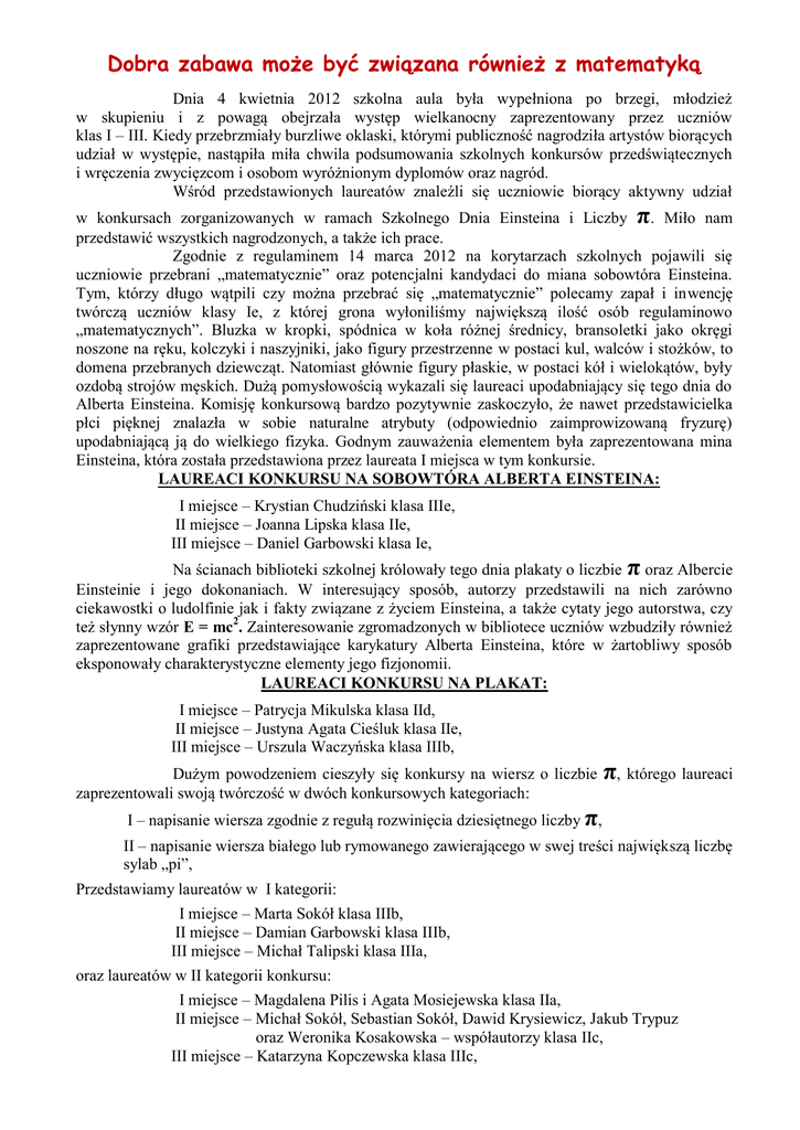 Dobra zabawa może być związana również z matematyką Dnia 4 kwietnia 2012 szkolna aula była wypełniona po brzegi, młodzież w skupieniu i z powagą obejrzała występ wielkanocny zaprezentowany przez uczniów klas I – III. Kiedy przebrzmiały burzliwe oklaski, którymi publiczność nagrodziła artystów biorących udział w występie, nastąpiła miła chwila podsumowania szkolnych konkursów przedświątecznych i wręczenia zwycięzcom i osobom wyróżnionym dyplomów oraz nagród. Wśród przedstawionych laureatów znaleźli się uczniowie biorący aktywny udział w konkursach zorganizowanych w ramach Szkolnego Dnia Einsteina i Liczby π. Miło nam przedstawić wszystkich nagrodzonych, a także ich prace. Zgodnie z regulaminem 14 marca 2012 na korytarzach szkolnych pojawili się uczniowie przebrani „matematycznie” oraz potencjalni kandydaci do miana sobowtóra Einsteina. Tym, którzy długo wątpili czy można przebrać się „matematycznie” polecamy zapał i inwencję twórczą uczniów klasy Ie, z której grona wyłoniliśmy największą ilość osób regulaminowo „matematycznych”. Bluzka w kropki, spódnica w koła różnej średnicy, bransoletki jako okręgi noszone na ręku, kolczyki i naszyjniki, jako figury przestrzenne w postaci kul, walców i stożków, to domena przebranych dziewcząt. Natomiast głównie figury płaskie, w postaci kół i wielokątów, były ozdobą strojów męskich. Dużą pomysłowością wykazali się laureaci upodabniający się tego dnia do Alberta Einsteina. Komisję konkursową bardzo pozytywnie zaskoczyło, że nawet przedstawicielka płci pięknej znalazła w sobie naturalne atrybuty (odpowiednio zaimprowizowaną fryzurę) upodabniającą ją do wielkiego fizyka. Godnym zauważenia elementem była zaprezentowana mina Einsteina, która została przedstawiona przez laureata I miejsca w tym konkursie. LAUREACI KONKURSU NA SOBOWTÓRA ALBERTA EINSTEINA: I miejsce – Krystian Chudziński klasa IIIe, II miejsce – Joanna Lipska klasa IIe, III miejsce – Daniel Garbowski klasa Ie, Na ścianach biblioteki szkolnej królowały tego dnia plakaty o liczbie π oraz Albercie Einsteinie i jego dokonaniach. W interesujący sposób, autorzy przedstawili na nich zarówno ciekawostki o ludolfinie jak i fakty związane z życiem Einsteina, a także cytaty jego autorstwa, czy też słynny wzór E = mc2. Zainteresowanie zgromadzonych w bibliotece uczniów wzbudziły również zaprezentowane grafiki przedstawiające karykatury Alberta Einsteina, które w żartobliwy sposób eksponowały charakterystyczne elementy jego fizjonomii. LAUREACI KONKURSU NA PLAKAT: I miejsce – Patrycja Mikulska klasa IId, II miejsce – Justyna Agata Cieśluk klasa IIe, III miejsce – Urszula Waczyńska klasa IIIb, Dużym powodzeniem cieszyły się konkursy na wiersz o liczbie zaprezentowali swoją twórczość w dwóch konkursowych kategoriach: π, którego laureaci I – napisanie wiersza zgodnie z regułą rozwinięcia dziesiętnego liczby π, II – napisanie wiersza białego lub rymowanego zawierającego w swej treści największą liczbę sylab „pi”, Przedstawiamy laureatów w I kategorii: I miejsce – Marta Sokół klasa IIIb, II miejsce – Damian Garbowski klasa IIIb, III miejsce – Michał Talipski klasa IIIa, oraz laureatów w II kategorii konkursu: I miejsce – Magdalena Pilis i Agata Mosiejewska klasa IIa, II miejsce – Michał Sokół, Sebastian Sokół, Dawid Krysiewicz, Jakub Trypuz oraz Weronika Kosakowska – współautorzy klasa IIc, III miejsce – Katarzyna Kopczewska klasa IIIc, Z przyjemnością prezentujemy niektóre z nagrodzonych wierszy: Kot i pies i stała sprzeczka, tu zadyma mocna, tam pewna ucieczka. Nienawiść ogromna odwieczną grą, co kot podrapie, pies gryzie go. „Odpuść może? Łza twa uleciała.” „Dać za wygraną? Koncepcja słaba!” Marta Sokół kl. III b Ada i Olaf w ławce krzyczeli, że „kocham matmę nad życie”. Wyliczać, rozwiązać, sumować, podliczać, tak, to ich zadaniem jest. Prawda, że dobrze, nikt ich nie zrozumie, ale to pociąga, fascynuje... Damian Garbowski kl. III b Pierwszy raz poznałam liczbę pi i ciągle w głowie mi tkwi. Pojawiła się jak pierwiosnek i wpisała się pod pierwiastek. We wzorach stwarza problem mi i o północy mi się śni. Każdy o niej słyszał chociaż nikt jej do końca nie opisał. Pi to liczba niewymierna, wiedza o niej jest obszerna. Chociaż ciągle jej przybywa coraz więcej wiedzy mi ubywa. Magdalena Pilis i Agata Mosiejewska kl. IIa Bo liczba Pi to jest takie coś i musi znać to każdy gość. A jeśli nie, to jesteś łoś, i jak nic dostaniesz w kość. Liczba Pi, liczba Pi to jest fajna liczba powiem Ci, Więc z nami chodź poucz się, Bo jak nie, to będzie źle. Był sobie pewien gość, Co wymyślił sobie coś, A liczba Pi to się zwie I naucz się, bo będzie źle. Liczba Pi to 3,14 Archimedes twierdzi tak, I nie zmieni tego nikt, choćby runął cały świat. Weronika Kosakowska, Dawid Krysiewicz, Michał Sokół, Sebastian Sokół, Jakub Trypuz klasa IIc, „Najsmaczniejszą” częścią tego dnia był oczywiście KONKURS NA NAJπSZNIEJSZE CIASTO. Gorące chwile przeżywali nie tylko autorzy pysznych wypieków oczekujący na werdykt, ale i zgromadzona publiczność, mająca nadzieję na spróbowanie przyniesionych smakołyków. Konkursowym wymogiem był kształt lub dekoracja przygotowanego wypieku, spełniająca warunki zawarte w regulaminie. Wszyscy uczestnicy wywiązali się z tego zadania wręcz wzorowo. Dzięki pomocy przedstawicielek płci pięknej w osobach uczennic naszej szkoły, wszystkie ciasta zostały na koniec podzielone na mniejsze porcje i ze smakiem skonsumowane przez zgromadzonych łasuchów. Uchwycone obiektywem aparatu fotograficznego ciasta przywołują wspomnienia ich smaku, jednocześnie przedstawiając grono uczestników tego konkursu. Laureaci konkursu na najπszniejsze ciasto: I miejsce – Rafał Kopczewski kla