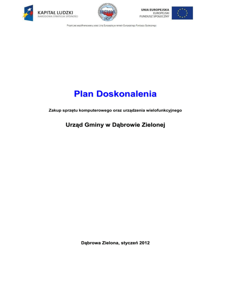 Plan Doskonalenia Zakup sprzętu komputerowego oraz urządzenia wielofunkcyjnego Urząd Gminy w Dąbrowie Zielonej Dąbrowa Zielona, styczeń 2012 SPIS TREŚCI: 1. Informacje wstępne ......................................................................................... 3 2. Cel ..................................................................................................................... 3 3. Zadania do realizacji ....................................................................................... 3 4. Potencjalne trudności ..................................................................................... 4 5. Zasoby niezbędne dla realizacji projektu .................................................... 4 Partner projektu F5 Konsulting Sp. z o.o. ul. Składowa 5, 61-897 Poznań T: 061 856 69 60 F: 061 853 02 95 1. Informacje wstępne Numer planu doskonalenia*: Tytuł/ nazwa planu doskonalenia: Kryterium/ podkryterium modelu CAF: Urząd: Kierownik projektu: Zespół projektowy: 12/01/2012 Zakup sprzętu komputerowego oraz urządzenia wielofunkcyjnego Kryterium 4. Partnerstwo i zasoby p. 4.4. Zarządzanie informacją i wiedzą p. 4.6. Zarządzanie majątkiem rzeczowym Urząd Gminy w Dąbrowie Zielonej Halina Huras 1. Lidia Sowa 2. Aneta W ojtala 2. Cel Cel: Sposób oceny realizacji celu: Pozyskać środki zewnętrzne na zakup sprzętu komputerowego oraz kserokopiarki, urządzeń. terminowy charakter realizacji projektu ustalenie i przyjęcie koncepcji przez Członków Zespołu zakup urządzenia wielofunkcyjnego (ksero, drukarka) zakup laptopa z oprogramowaniem 3. Zadania do realizacji Lp 1. 2. 3. 4. Zadania do realizacji W yznaczenie przez Sekretarza Gminy członków Zespołu Projektowego Ustalenie zasad komunikacji wewnętrznej i zewnętrznej w ramach Zespołu Projektowego Ustalenie szczegółowej listy niezbędnego wyposażenia i sprzętu Zebranie od pracowników informacji dot. wyposażenia i sprzętu Analiza kosztów zakupu wyposażenia i sprzętu 5. Zidentyfikowanie zewnętrznych źródeł finansowania 6. Uzgodnienie z kierownictwem urzędu listy wyposażenia i sprzętu możliwych do Odpowiedzialny Sekretarz Gminy Termin 1 dzień Oczekiwane rezultaty Powołanie Zespołu Projektowego na podstawie Zarządzenia Kierownik/Lider Zespołu Projektowego Zespół Projektowy Kierownik/Lider Zespołu Projektowego Zespół Projektowy Informatyk 1 dzień Sprawna komunikacja wewnętrzna i zewnętrzna w oparciu o ustalone zasady 30 dni Lista wyposażenia i sprzętu niezbędna do pracy Urzędu Zespół Projektowy Referat Finansowy Informatyk Zespół Projektowy Referat Organizac yjny W ójt Gminy Kierownicy Referatów Kierownik/Lider 14 dni W ynik finansowy wprowadzenia usprawnień 5 dni Stworzenie listy potencjalnych zewnętrznych źródeł finansowania Decyzja w sprawie zakupu wyposażenia i sprzętu 7 dni Partner projektu F5 Konsulting Sp. z o.o. ul. Składowa 5, 61-897 Poznań T: 061 856 69 60 F: 061 853 02 95 Zespołu Projektowego Zespół Projektowy Informatyk zakupu 4. Potencjalne trudności Lp. 1. Przewidywane trudności w realizacji zadań Obciążenie członków Zespołu bieżąc ymi obowiązkami 2. Choroby, urlopy i inne wydarzenia związane z członkami Zespołu Projektowego uniemożliwiającego ich prace. 3. Środki Finansowe Działania zapobiegawcze /terminy/ osoby odpowiedzialne za ich realizację/ 1. Pismo do kierownictwa informujące o uczestnictwie członków Zespołu w jego pracach. 2. W ypracowanie odpowiedniego planu komunikacji wewnętrznej. Osoby odpowiedzialne – członkowie Zespołu Projektowego 1. Stworzenie s ystemu zastępstw – wyznaczenie dwóch osób do jednego zadania Osoby odpowiedzialne – Członkowie Zespołu Projektowego 1. Zabezpieczenie w budżecie gminy niezbędnych środków na zakup wyposażenia i sprzętu. Osoby odpowiedzialne – Członkowie Zespołu Projektowego, Referat Finansowy 5. Zasoby niezbędne dla realizacji projektu Zasoby ludzkie Środki finansowe 1. Zespół Projektowy – 3 osoby 2. Konsultacje z udziałem kierownictwa Urzędu, pracownikami, klientem zewnętrznym, informatykiem Zabezpieczenie w budżecie gminy niezbędnych środków na zakup wyposażenia i sprzętu. Rzeczowe Materiały biurowe Stanowisko Imię i nazwisko Lidia Sowa Aneta W ojtala Data Opracowanie: Podinspektor sekretarka 22.01.2012 W eryfikacja: Zastępca W ójta Halina Huras 24.01.2012 Zatwierdzenie: W ójt Maria W łodarczyk 24.01.2012 Partner projektu F5 Konsulting Sp. z o.o. ul. Składowa 5, 61-897 Poznań T: 061 856 69 60 F: 061 853 02 95 Podpis