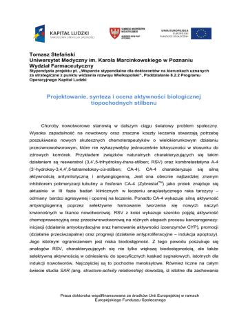 Tomasz Stefański Uniwersytet Medyczny im. Karola Marcinkowskiego w Poznaniu Wydział Farmaceutyczny Stypendysta projektu pt. „Wsparcie stypendialne dla doktorantów na kierunkach uznanych za strategiczne z punktu widzenia rozwoju Wielkopolski”, Poddziałanie 8.2.2 Programu Operacyjnego Kapitał Ludzki Projektowanie, synteza i ocena aktywności biologicznej tiopochodnych stilbenu Choroby nowotworowe stanowią w dalszym ciągu światowy problem społeczny. Wysoka zapadalność na nowotwory oraz znaczne koszty leczenia stwarzają potrzebę poszukiwania nowych skutecznych chemoterapeutyków o wielokierunkowym działaniu przeciwnowotworowym, które nie wykazywałyby jednocześnie toksyczności w stosunku do zdrowych komórek. Przykładem związków naturalnych charakteryzujących się takim działaniem są resweratrol (3,4’,5-trihydroksy-trans-stilben; RSV) oraz kombretastatyna A-4 (3’-hydroksy-3,4,4’,5-tetrametoksy-cis-stilben; CA-4). CA-4 charakteryzuje się silną aktywnością antymitotyczną i antyangiogenną. Jest ona obecnie najbardziej znanym inhibitorem polimeryzacji tubuliny a fosforan CA-4 (ZybrestatTM) jako prolek znajduje się aktualnie w III fazie badań klinicznych w leczeniu anaplastycznego raka tarczycy – odmiany bardzo agresywnej i opornej na leczenie. Ponadto CA-4 wykazuje silną aktywność antyangiogenną poprzez selektywne hamowanie tworzenia się nowych naczyń krwionośnych w tkance nowotworowej. RSV z kolei wykazuje szeroko pojętą aktywność chemoprewencyjną oraz przeciwnowotworową na różnych etapach procesu kancerogenezy: inicjacji (działanie antyoksydacyjne oraz hamowanie aktywności izoenzymów CYP), promocji (działanie przeciwzapalne) oraz progresji (działanie antyproliferacyjne – indukcja apoptozy). Jego istotnym ograniczeniem jest niska biodostępność. Z tego powodu poszukuje się analogów RSV, charakteryzujących się nie tylko większą biodostępnością, ale także selektywną aktywnością w odniesieniu do specyficznych kaskad sygnałowych, istotnych dla indukcji nowotworów. Najczęściej są to pochodne metoksylowe. Również liczne na całym świecie studia SAR (ang. structure-activity relationship) dowodzą, iż istotne dla zachowania Praca doktorska współfinansowana ze środków Unii Europejskiej w ramach Europejskiego Funduszu Społecznego aktywności przeciwnowotworowej CA-4 są grupy metoksylowe obecne w obu pierścieniach fenylowych. Istnieją sugestie, iż zastąpienie tlenu bioizosterycznym atomem siarki w tych ugrupowaniach pozwoli zwiększyć ich aktywność. Potwierdzają to m.in. wstępne badania zarówno biologiczne, jak i obliczeniowe. Ponadto przeprowadzone badania metylotiopochodnych RSV jako inhibitorów ludzkich rekombinowanych izoenzymów CYP1A1, CYP1A2 oraz CYP1B1 udowadniają, iż są one bardziej aktywne od ich analogów metoksylowych. Podstawowe cele pracy obejmują: zaprojektowanie przy wykorzystaniu narzędzi chemoinformatycznych scharakteryzowanie oraz pod modelowania względem molekularnego, fizykochemicznym i zsyntetyzowanie biologicznym oraz nowych pochodnych cis- oraz trans-stilbenu przyjmując odpowiednio CA-4 oraz RSV jako związek wiodący. Synteza chemiczna obejmuje otrzymanie analogów, które w miejsce atomu/ów tlenu w cząsteczce będą posiadały atom/y siarki, a także przyłączone dodatkowe podstawniki metoksylowe lub metylotiolowe do pozostałych wolnych pozycji w pierścieniach fenylowych. Ponadto w przypadku pochodnych CA-4 zaplanowano syntezę 4 grup związków różniących się budową rdzenia cząsteczki (cis-stilbeny, pochodne kwasu - fenylocynamonowego, N-metyloimidazole i oksazole). Usztywnienie cząsteczki CA-4 różnymi układami heterocyklicznymi zgodnie z danymi literaturowymi okazała się skutecznie zapobiegać przekształcaniu formy cis w izomer trans i zwiększała działanie cytotoksyczne związków w stosunku do komórek nowotworowych. Badanie biologiczne i biochemiczne otrzymanych pochodnych stilbenu obejmują: a) wpływ na aktywność enzymów z grupy CYP450 dla pochodnych RSV, b) wpływ pochodnych RSV na aktywność czynników transkrypcyjnych biorących udział w procesie kancerogenezy NF- B i AP-1, c) wpływ na proces polimeryzacji tubuliny pochodnych CA-4 (CA-4), d) badanie aktywności cytotoksycznej na wybranych liniach komórek nowotworowych pochodnych RSV i CA-4, e) oceny zdolności najaktywniejszych pochodnych CA-4 do wywołania śmierci apoptotycznej wybranych linii komórkowych na podstawie pomiaru aktywności kaspaz 3 i 9. Przewiduje się dalsze modyfikacje otrzymanych i przebadanych biologicznie związków wykazujących wysoką, obiecującą aktywność przeciwnowotworową w celu poprawienia ich właściwości fizyko-chemicznych. Odbywać się to będzie poprzez Praca doktorska współfinansowana ze środków Unii Europejskiej w ramach Europejskiego Funduszu Społecznego wytworzenie nanocząstek charakteryzujących się strukturą typu rdzeń-powłoka (ang. core/shell) o własnościach luminescencyjno-magnetycznych. Znalezienie bardziej aktywnych a zarazem mniej toksycznych pochodnych w połączeniu z wykorzystaniem modelowania molekularnego do oceny ich powinowactwa do receptora daje szansę uzyskania istotnych a zarazem przybliżających nas informacji co do samego miejsca wiążącego pozwalając na projektowanie w przyszłości jeszcze lepszych, a więc bardziej selektywnych inhibitorów polimeryzacji tubuliny w oparciu o znajomość mechanizmu działania. Zdobyta wiedza w tym zakresie posłuży ostatecznie do otrzymania wysoce aktywnych pochodnych stilbenowych, które będą mogły być włączone do ewentualnych testów przedklinicznych i klinicznych i ich dalszej komercjalizacji przez firmy w naszym regionie. Zastosowanie nowoczesnych nanostruktur charakteryzujących się strukturą typu rdzeń-powłoka (ang. core/shell) o własnościach luminescencyjno-magnetycznych pozwoli poprawić biodostępność najbardziej aktywnych struktur, ich selekt