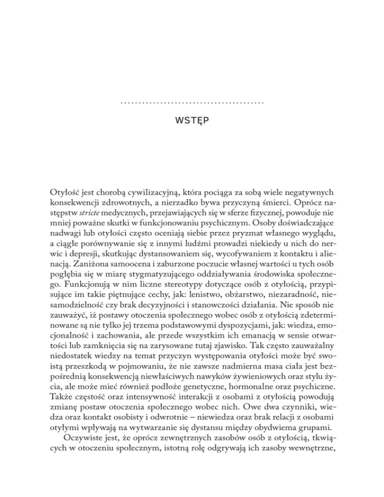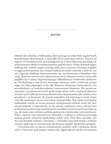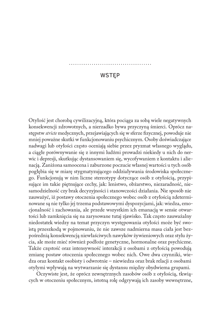 WSTĘP Otyłość jest chorobą cywilizacyjną, która pociąga za sobą wiele negatywnych konsekwencji zdrowotnych, a nierzadko bywa przyczyną śmierci. Oprócz następstw stricte medycznych, przejawiających się w sferze fizycznej, powoduje nie mniej poważne skutki w funkcjonowaniu psychicznym. Osoby doświadczające nadwagi lub otyłości często oceniają siebie przez pryzmat własnego wyglądu, a ciągłe porównywanie się z innymi ludźmi prowadzi niekiedy u nich do nerwic i depresji, skutkując dystansowaniem się, wycofywaniem z kontaktu i alienacją. Zaniżona samoocena i zaburzone poczucie własnej wartości u tych osób pogłębia się w miarę stygmatyzującego oddziaływania środowiska społecznego. Funkcjonują w nim liczne stereotypy dotyczące osób z otyłością, przypisujące im takie piętnujące cechy, jak: lenistwo, obżarstwo, niezaradność, niesamodzielność czy brak decyzyjności i stanowczości działania. Nie sposób nie zauważyć, iż postawy otoczenia społecznego wobec osób z otyłością zdeterminowane są nie tylko jej trzema podstawowymi dyspozycjami, jak: wiedza, emocjonalność i zachowania, ale przede wszystkim ich emanacją w sensie otwartości lub zamknięcia się na zarysowane tutaj zjawisko. Tak często zauważalny niedostatek wiedzy na temat przyczyn występowania otyłości może być swoistą przeszkodą w pojmowaniu, że nie zawsze nadmierna masa ciała jest bezpośrednią konsekwencją niewłaściwych nawyków żywieniowych oraz stylu życia, ale może mieć również podłoże genetyczne, hormonalne oraz psychiczne. Także częstość oraz intensywność interakcji z osobami z otyłością powodują zmianę postaw otoczenia społecznego wobec nich. Owe dwa czynniki, wiedza oraz kontakt osobisty i odwrotnie – niewiedza oraz brak relacji z osobami otyłymi wpływają na wytwarzanie się dystansu między obydwiema grupami. Oczywiste jest, że oprócz zewnętrznych zasobów osób z otyłością, tkwiących w otoczeniu społecznym, istotną rolę odgrywają ich zasoby wewnętrzne, 8 Wstęp indywidualne, pomocne w radzeniu sobie z tak ważnym problemem zdrowotnym. Podstawowym zasobem osobistym wydaje się zjawisko, które jak dotąd dość enigmatycznie określa się mianem przystosowania lub adaptacji. U podstaw genezy przystosowania leżą trzy grupy czynników i w oparciu o nie należy pojmować ten proces. Człowiek to istota biopsychiczna, przebywająca w grupie społecznej, ujawniająca szereg mechanizmów będących rezultatem interakcji pomiędzy biologiczną sprawnością jednostki, jej sprawnością psychologiczną oraz wymaganiami środowiska społecznego (J. Kirenko 1991). Przystosowanie jest więc procesem, „dzięki któremu jednostka osiąga stan względnej równowagi między własnymi potrzebami, pragnieniami, możliwościami a warunkami i wymaganiami zewnętrznymi” (J. Kirenko 1998, s. 50). Przez stosunkowo długi czas problematykę przystosowania osób przewlekle chorych i niepełnosprawnych analizowano jako stan lub proces osiągnięty dzięki dokonującym się przemianom (zob. Z. Sękowska 1991; J. Kirenko 1991, 1998). Określenie „stan” odnosi się przede wszystkim do tych postaci przystosowania, w których istnieje potrzeba określenia i scharakteryzowania zastanej sytuacji przystosowawczej (J. Kirenko 1991, 1998). Konieczne jest wówczas sformułowanie kryteriów przystosowania, na których podstawie można powiedzieć, jakie zachowania są, a jakie nie są przejawami właściwego przystosowania. Znajdowało to odzwierciedlenie m.in. w obszarze takich modeli przystosowawczych, jak: stadialno-fazowy (linearny lub temporalny), wahadłowy (cykliczny, powracający), ekologiczny czy indywidualny (idiosynkratyczny), który nie podlegał uogólnieniu (S. Byra 2006, 2012). Stosunkowo rzadko natomiast dociekano mechanizmów tego procesu. Zagadnieniem tym szerzej zajęli się H. Livneh i R. F. Antonak (1997, 2005), którzy stworzyli model psychospołecznej adaptacji do życia z chroniczną chorobą i niepełnosprawnością, określany mianem interakcyjnego. Punktem wyjścia do opracowania tego modelu było rozróżnienie pojęć: adaptacja i przystosowanie1. Zdaniem autorów adaptacja jest pojęciem szerszym niż przystosowanie. Przy tym właściwe rozumienie procesów adaptacji nie jest możliwe, jeśli nie przeanalizuje się wszystkich zjawisk i procesów związanych ze stanem funkcjonowania człowieka chorego lub niepełnosprawnego, do których zaliczyć możemy m.in.: stres, żal, kryzys, depresję, obraz własnego ciała, strategie radzenia sobie, niezależność czy jakość życia. Zdaniem H. Livneha i R. F. Antonaka (1997, 2005) adekwatny opis procesu adaptacji wymaga uwzględnienia wielu czynników, takich jak np.: rodzaj choroby lub 1 W niniejszym opracowaniu będziemy zamiennie używać obu tych pojęć. Wstęp 9 niepełnosprawności, czas i sposób ich nabycia, konsekwencje psychiczne bycia przewlekle chorym lub niepełnosprawnym, stałość lub zmienność choroby i niepełnosprawności itp. (zob. S. Byra 2012). Adaptacja jest procesem, który ma charakter psychospołeczny. Wymiar psychologiczny wiąże się z ogólną akceptacją swojego stanu, zmaganiem się z następstwami choroby czy niepełnosprawności, większą otwartością na doświadczenie, wyższą samooceną i samoświadomością. Wymiar społeczny ujawnia się w pozytywnym uczestnictwie w życiu społecznym, rodzinnym i zawodowym, kontaktach z innymi ludźmi oraz zdobywaniu nowych umiejętności interpersonalnych (por. S. Byra 2006, 2008, 2012). Model procesu adaptacji H. Livneha i R. F. Antonaka (1997, 2005; zob. S. Byra 2006, 2008, 2012) stanowi podłoże wielu rozważań teoretycznych oraz planowania i projektowania badań służących wielowymiarowej terapii i rehabilitacji. Większość założeń modelu podlegała weryfikacji empirycznej, co umożliwiało przewidywanie zachowań osób przewlekle chorych i niepełnosprawnych. Mnogość 